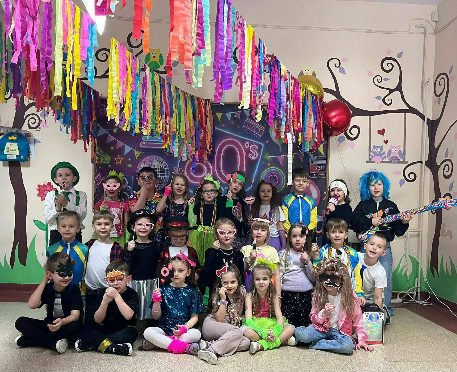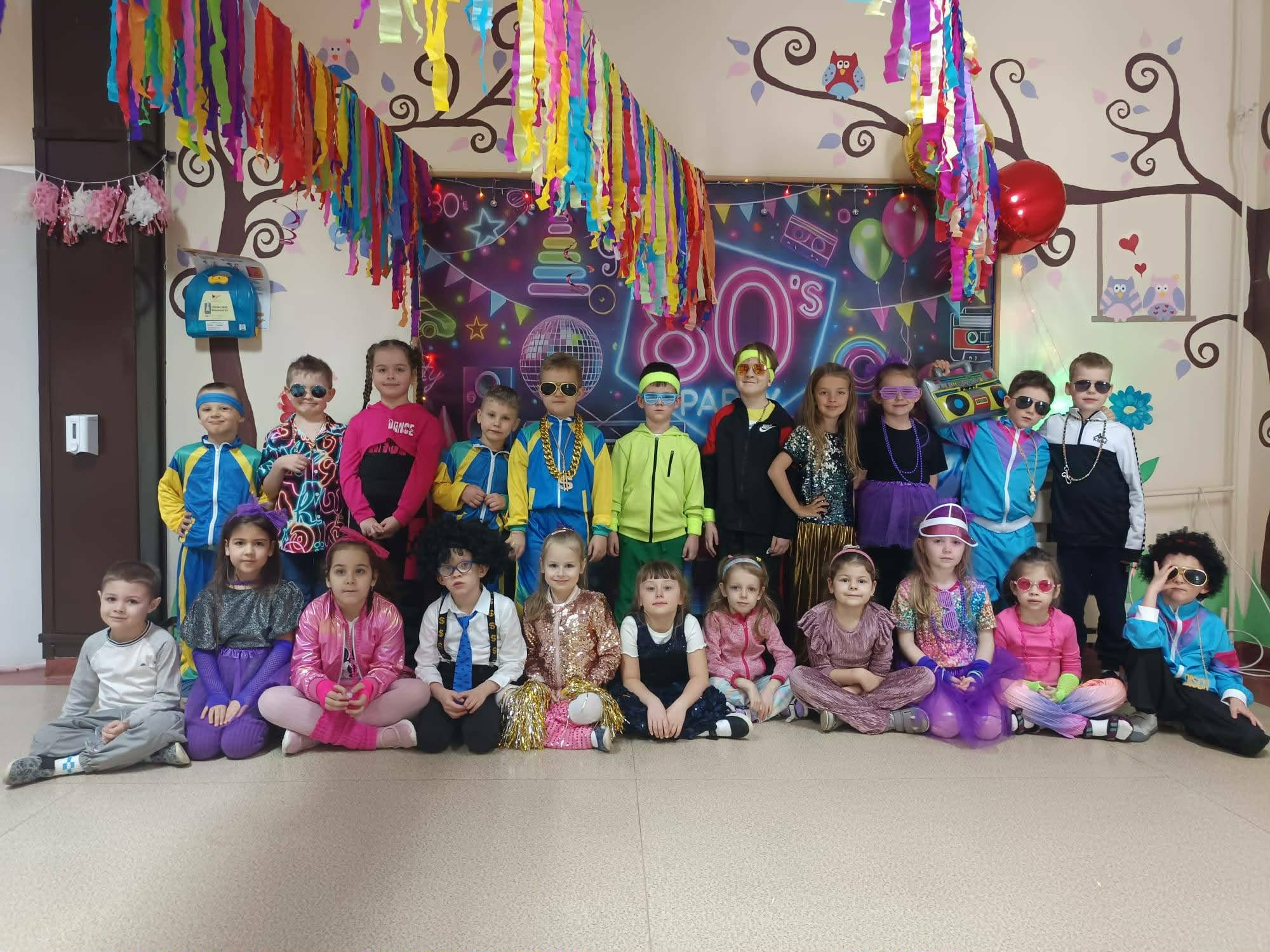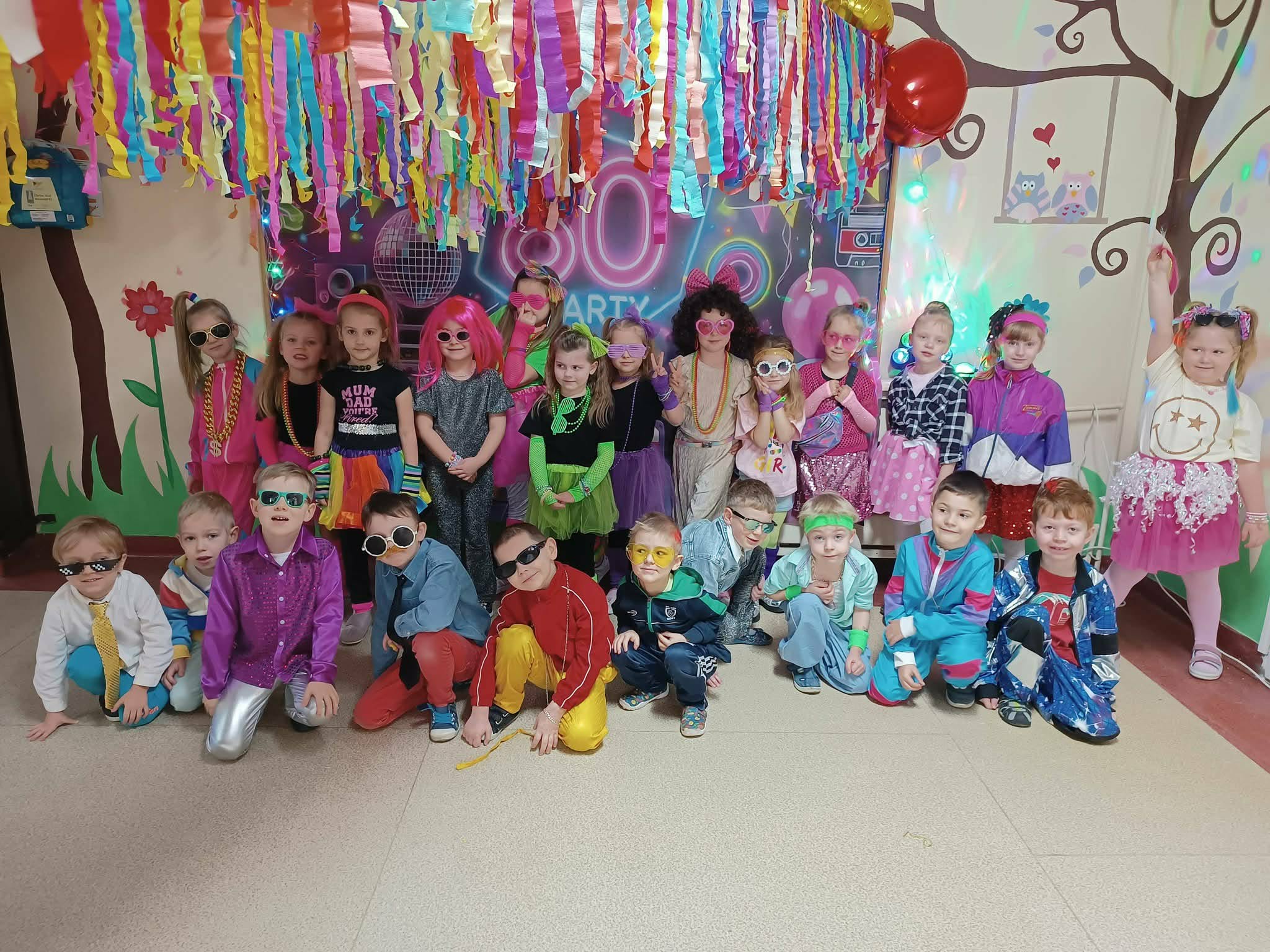 W naszym przedszkolu odbył się wyjątkowy bal w klimacie disco lat 80.! Dzieci zachwyciły kolorowymi, barwnymi strojami inspirowanymi tamtą dekadą. Wspólną zabawę rozpoczęliśmy tanecznie na holu, a następnie przenieśliśmy się do sali, gdzie czekał pyszny poczęstunek i dalsze tańce. Radości, uśmiechów i świetnej energii nie brakowało!