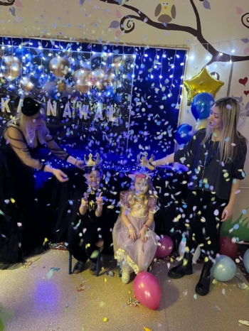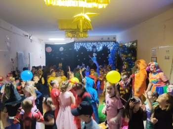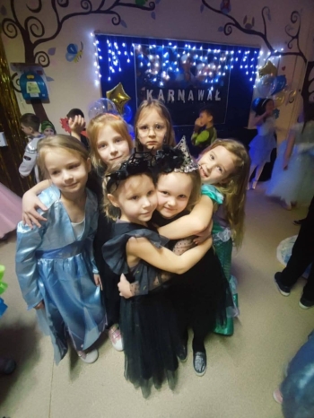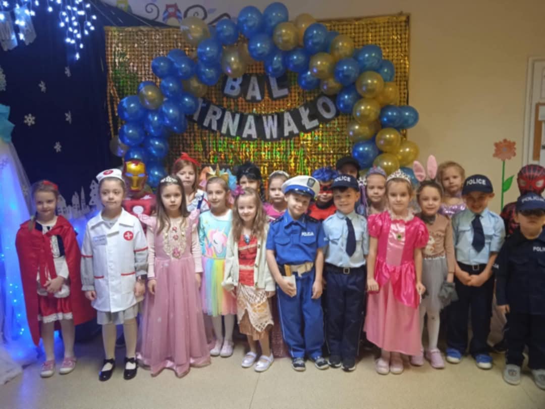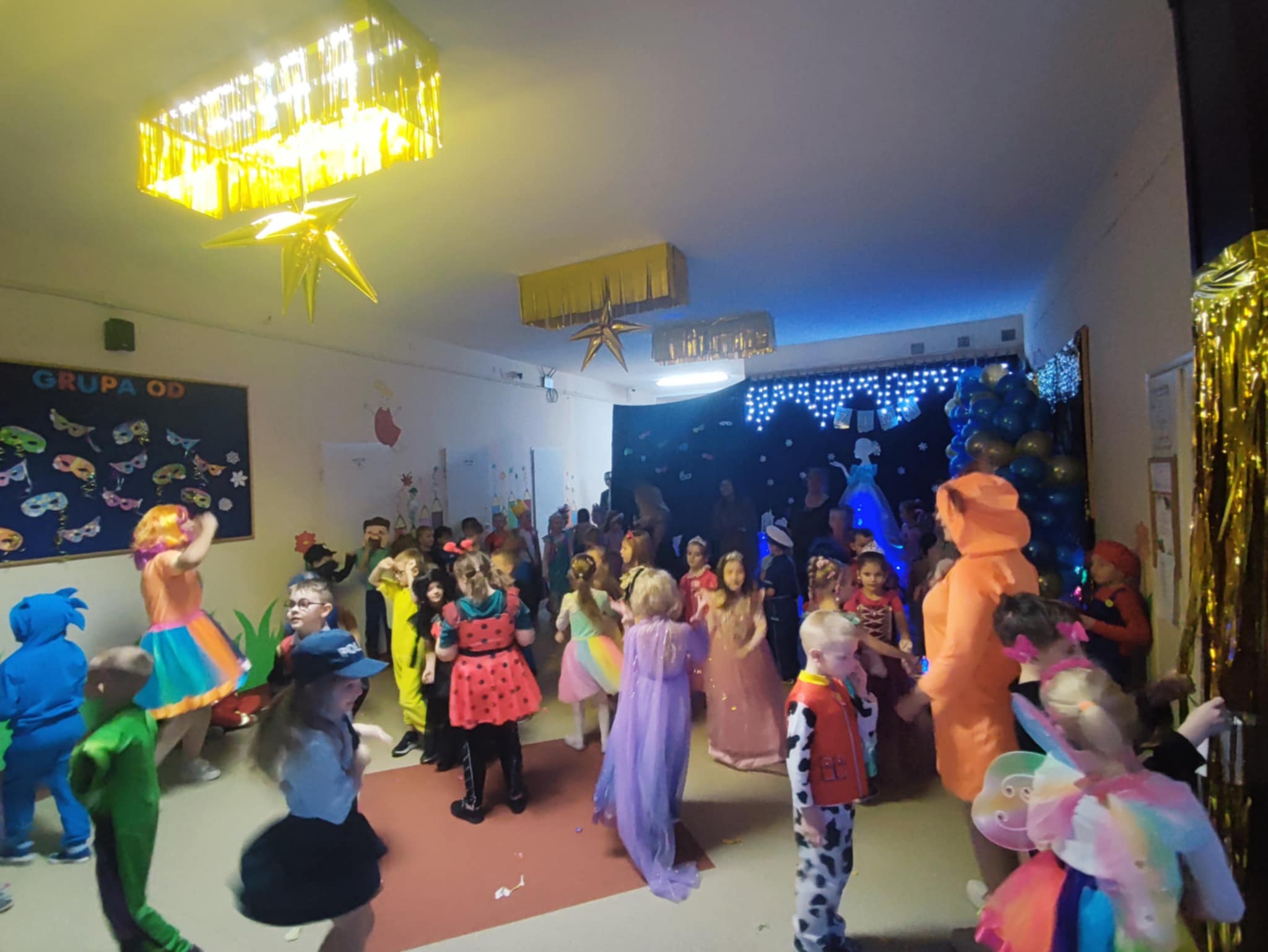 Wystrój sali tanecznej wprowadził w radosny nastrój oraz zachęcał do wesołej zabawy. W rytmie wesołej,karnawałowej muzyki, przedszkolaki z wielką ochotą rozpoczęły pląsy i tańce. Wszyscy bawili się znakomicie. Wielką atrakcją dla dzieci podczas balu były zabawy z kolorowymi balonami oraz bajkowe zabawy, w których bardzo chętnie wszyscy wzięli udział.Podczas balu wybrano również króla i królową naszego balu !