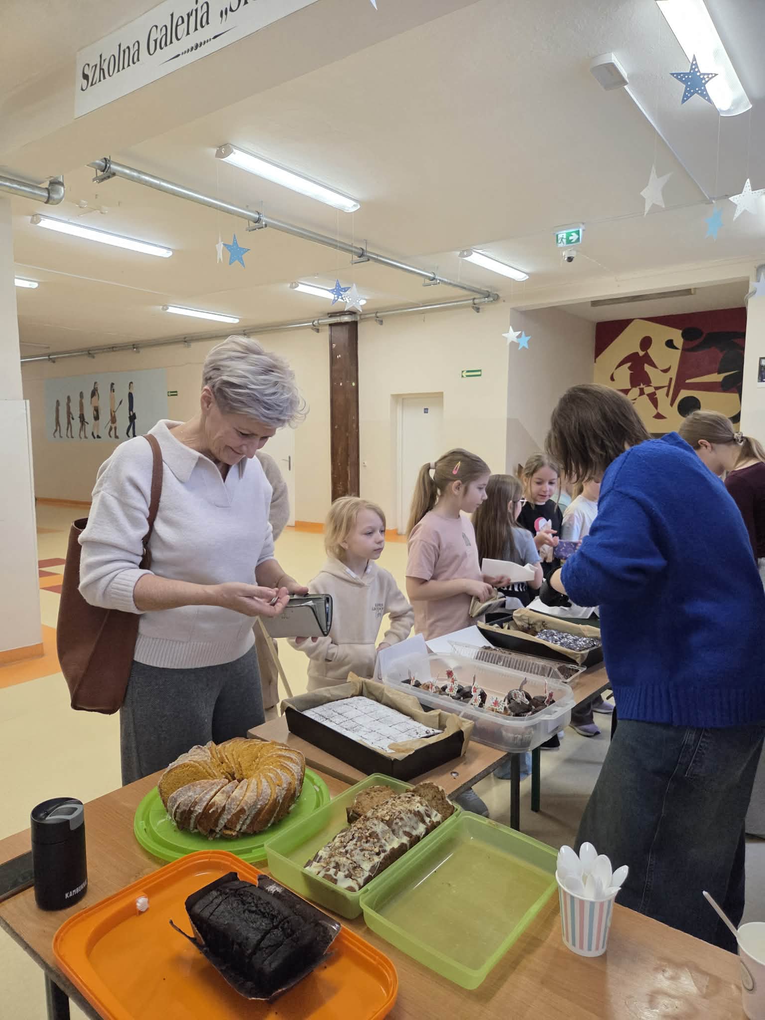 Stoły uginały się od pysznych wypieków – nie zabrakło tradycyjnych pierników, babeczek, serników i wielu innych słodkości, które zachwycały nie tylko smakiem, ale i pięknym wyglądem. Kiermasz cieszył się dużym zainteresowaniem całej społeczności szkolnej, a zapach domowych ciast przyciągał kolejnych smakoszy.