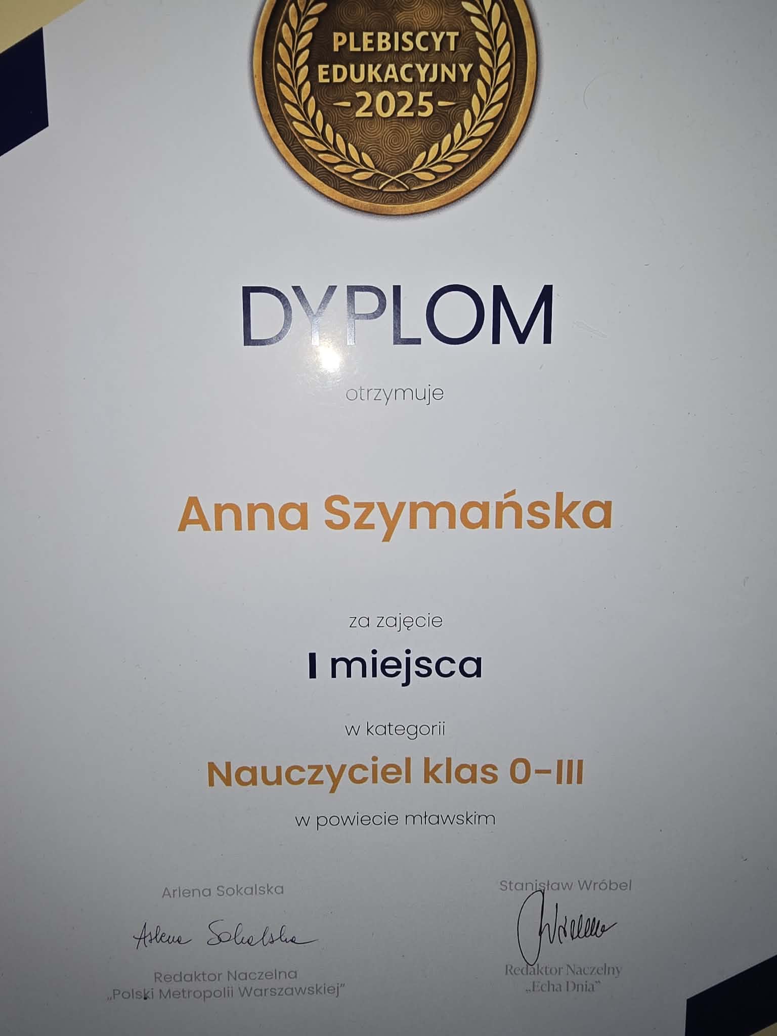 Z ogromną radością i dumą informujemy, że nauczycielka naszej szkoły Anna SzymańskazdobyłaI miejsce w plebiscycie edukacyjnym 2025 w powiecie mławskim w kategorii nauczyciel klas I–III.