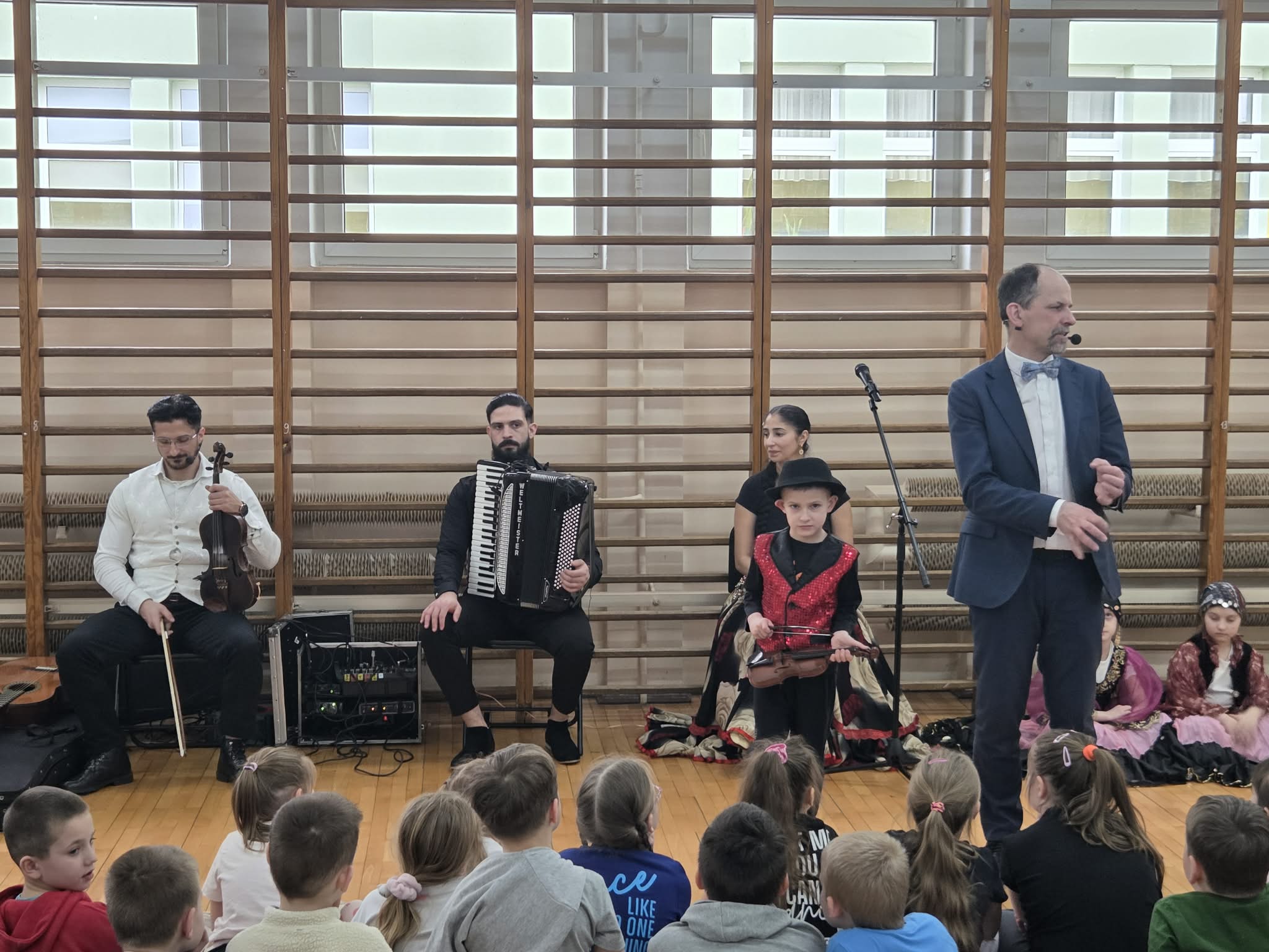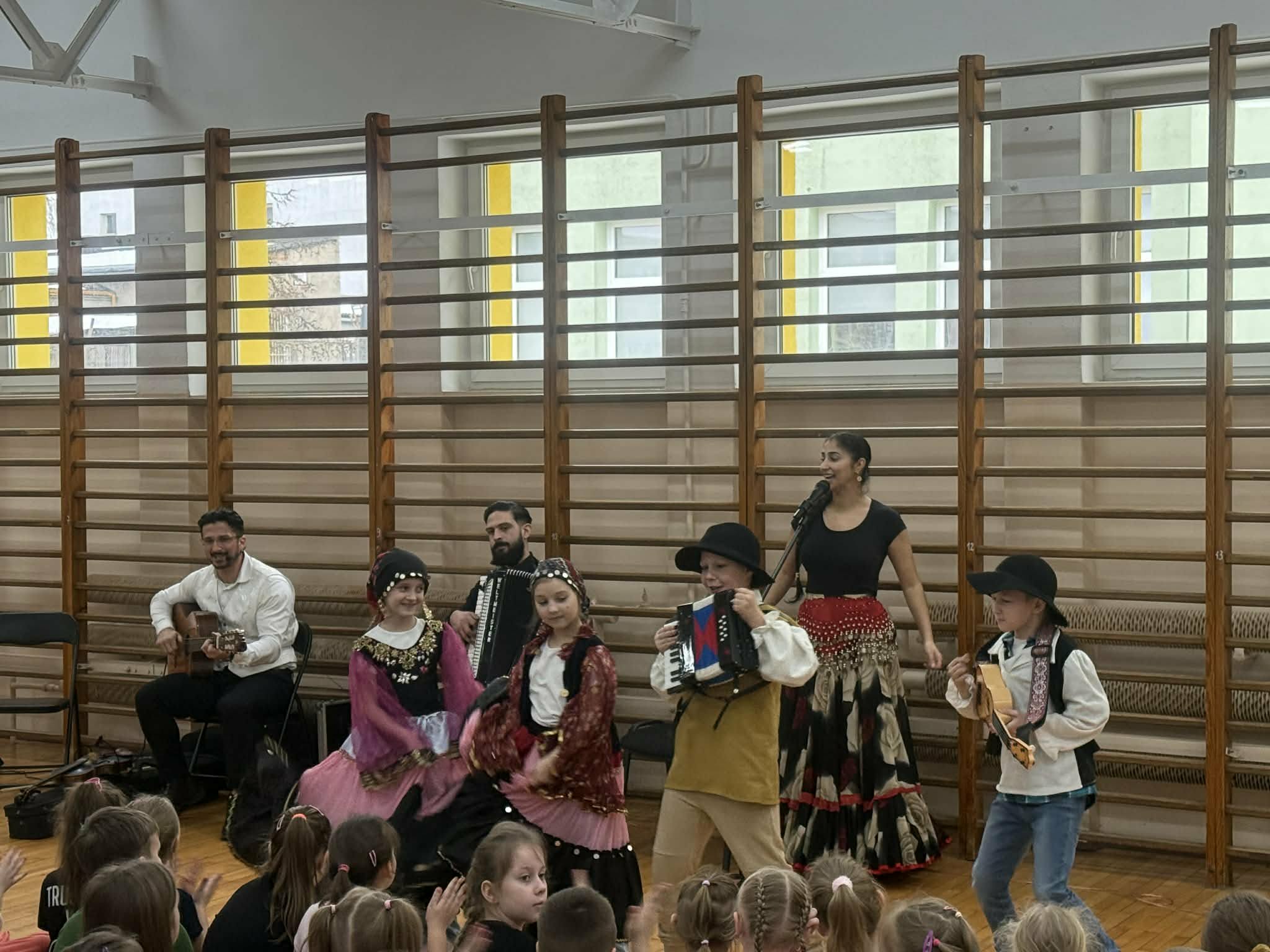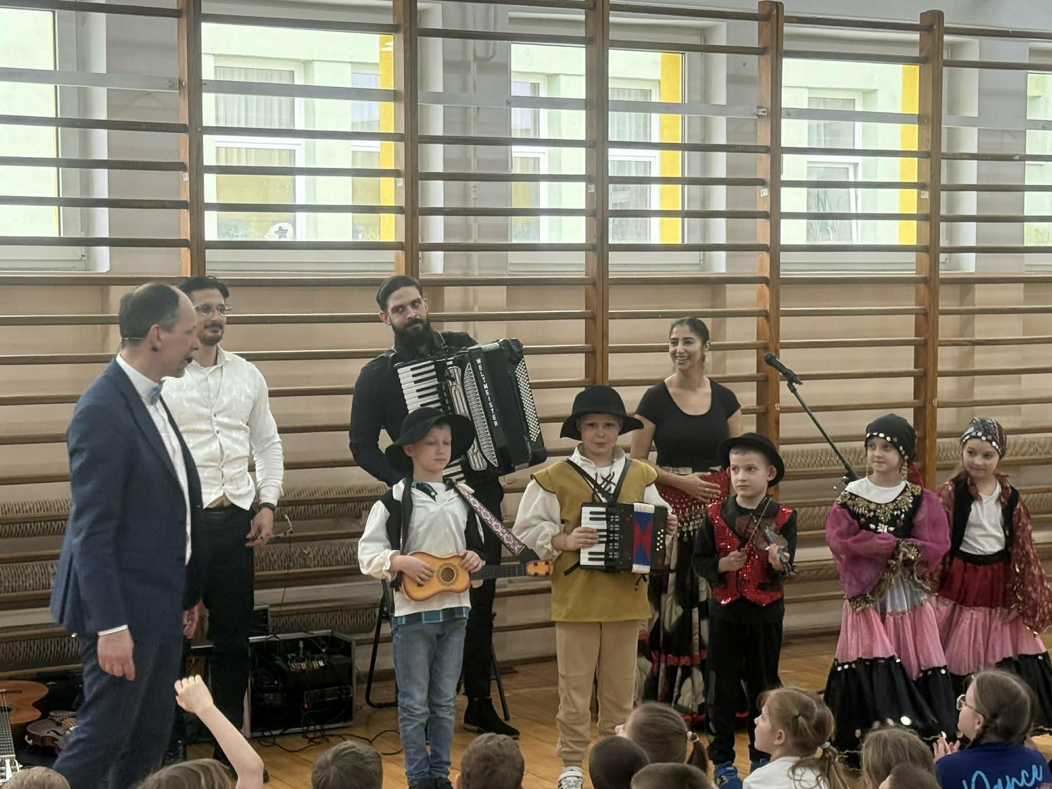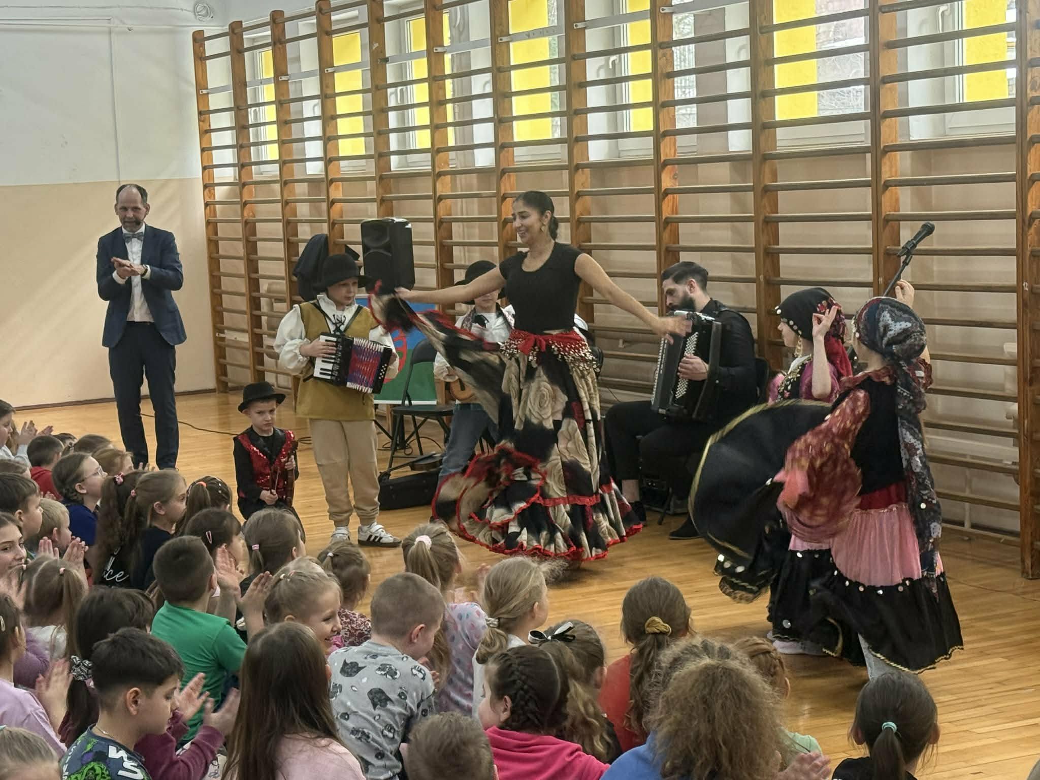 Dziś w naszej szkole odbył się wyjątkowy koncert pt. "Co w cygańskiej duszy gra", w którym uczestniczyli uczniowie klas I-III. Dzieci miały okazję wysłuchać barwnej i pełnej emocji muzyki romskiej wykonywanej na żywo. Wydarzenie odbyło się dzięki współpracy z Agencją Artystyczną "Pozytywka", która organizuje koncerty dla dzieci i młodzieży. Dzięki tej współpracy uczniowie mogą uczestniczyć w wartościowych spotkaniach muzycznych. Podczas koncertu zostały przedstawione elementy kultury i tradycji romskiej oraz charakterystyczne cechy tej muzyki. Uczniowie wysłuchali wielu utworów, w tym hymnu Romów oraz znanego Czardasz, poznając ich wyjątkowy nastrój, tempo i emocjonalny wyraz. Dzieci miały okazję wcielić się w role aktorów, przebierając się w piękne, kolorowe stroje, tańcząc i uczestnicząc w krótkich scenkach, co pozwoliło uczniom w pełni poczuć klimat prezentowanej kultury.