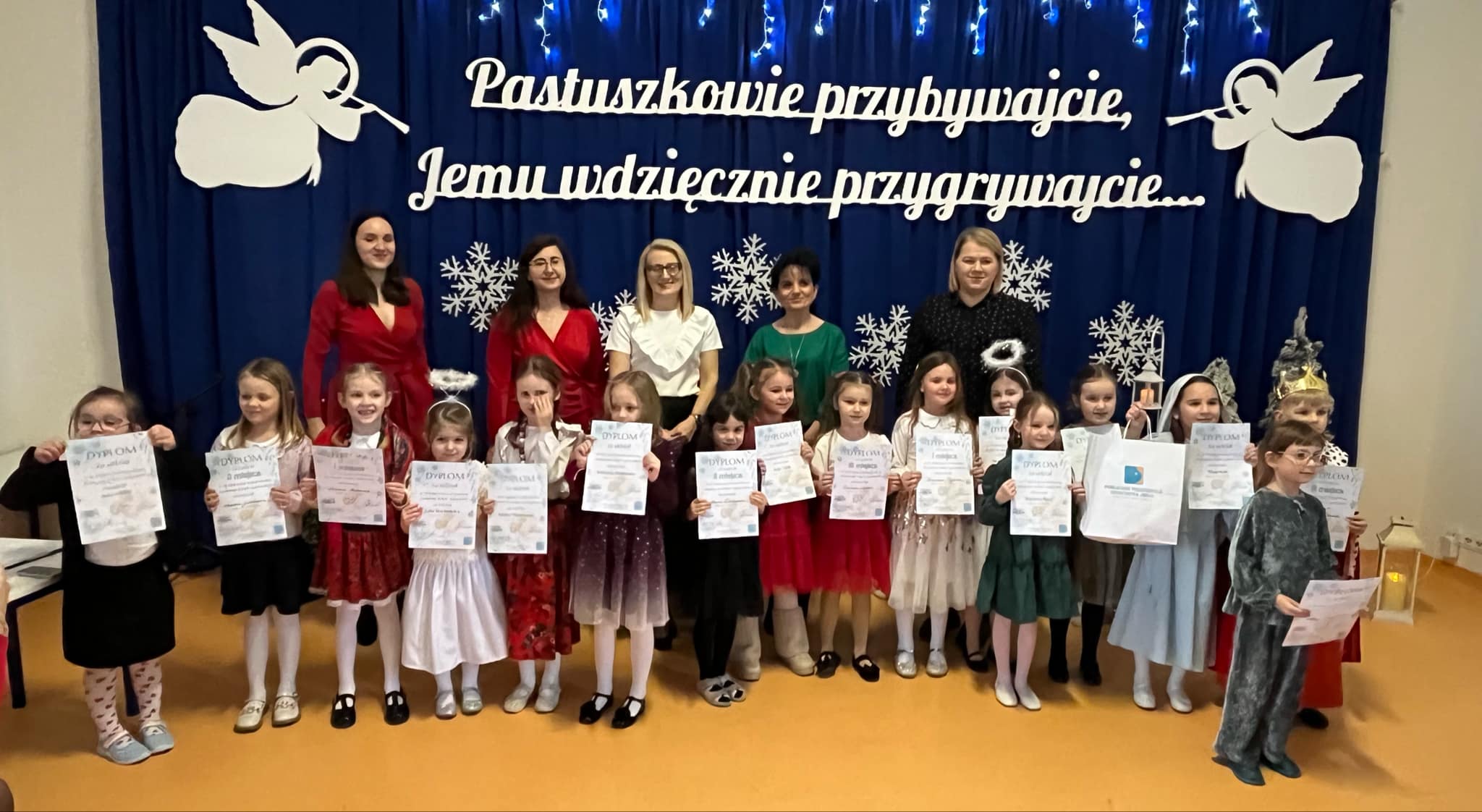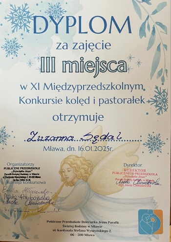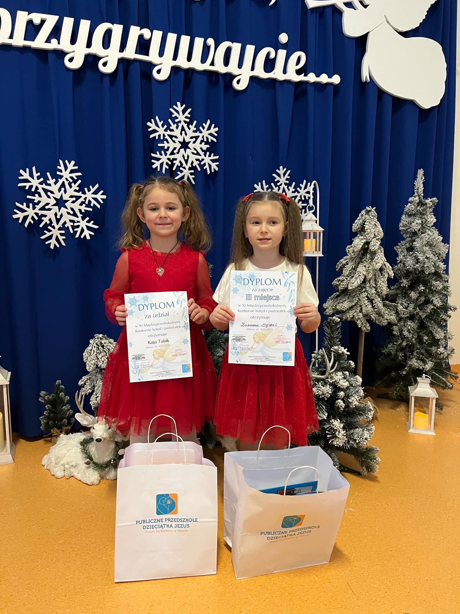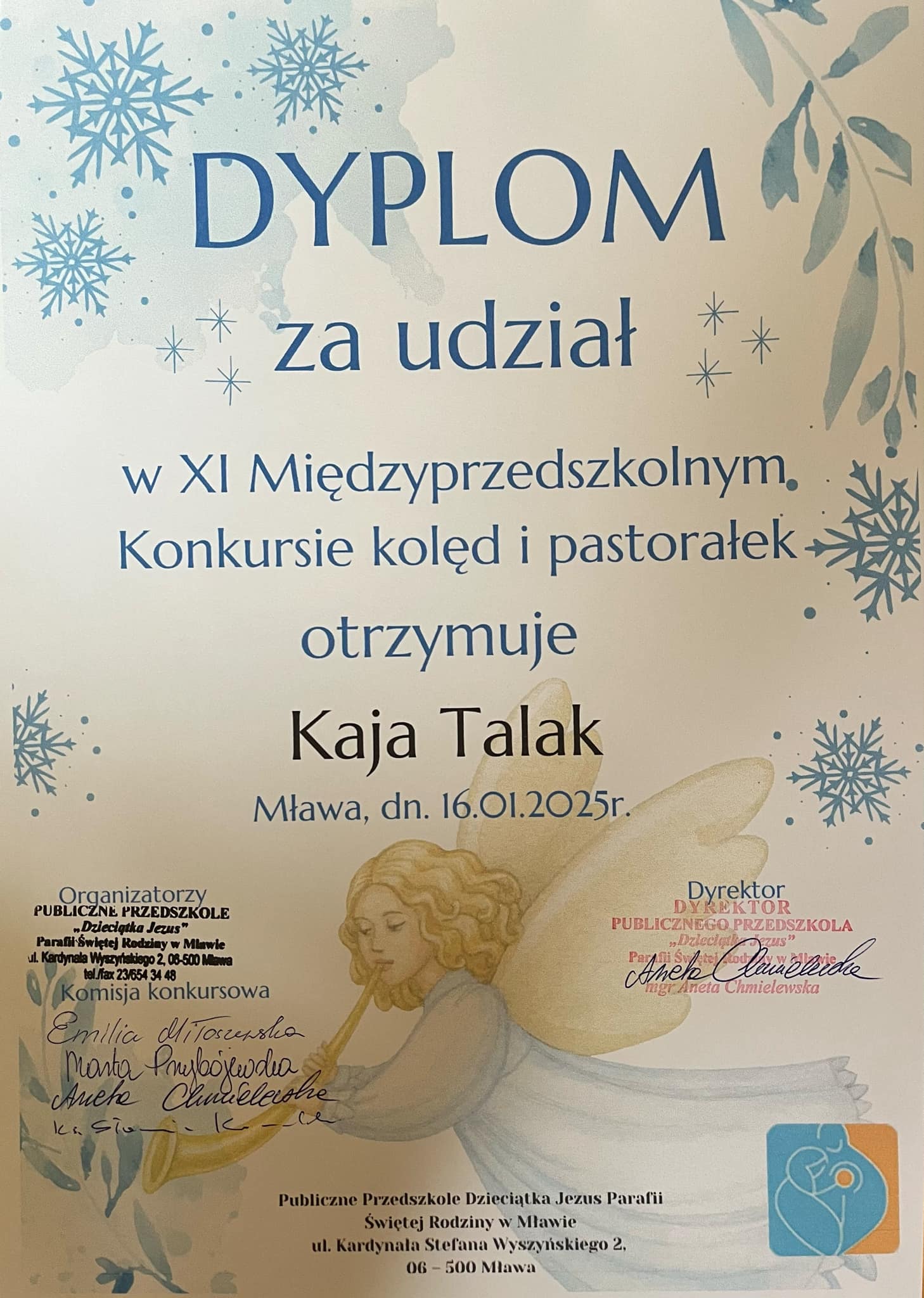 6 letnia Zuzanna Sędal z grupy 0b oraz 5 letnia Kaja Talak z grupy Pszczółki w dniu dzisiejszym wzięły udział w XI Miedzyprzedszkolnym konkursie kolęd i pastorałek, jak co roku organizowanym przez Publiczne Przedszkole Dzieciątka Jezus w Mławie.Dziewczynki pięknie zaprezentowały przygotowane pastorałki. W kategorii wiekowej - 5 latki Kaja otrzymała dyplom za udział!