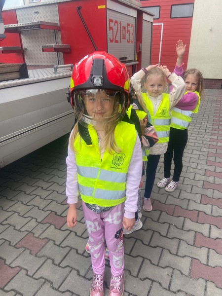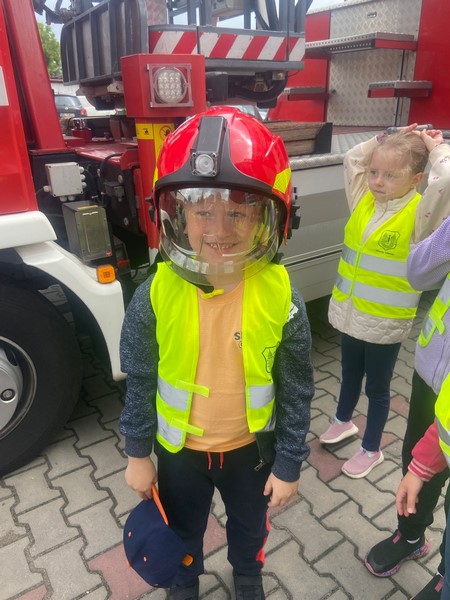11 czerwca dzieci z grupy Kotki wybrały się na wycieczkę do Straży Pożarnej w naszym mieście. Dzięki życzliwości Panów Strażaków przedszkolaki mogły z bliska obejrzeć samochody i sprzęt pożarniczy. W trakcie rozmowy ze strażakiem dowiedziały się dużo o trudnej, odpowiedzialnej i niebezpiecznej pracy. Zrozumiały, że strażak pomaga nie tylko w czasie pożaru, ale bierze również udział w akcjach ratowniczych np. w czasie wypadku drogowego. Dzieci miały możliwość obserwacji zjazdu strażaków do akcji po metalowej rurze. Przekonały się jak cenna jest każda minuta, sprawność i szybkie działanie. Dzieci obejrzeli strój strażaka do gaszenia pożaru i miały możliwość przymierzyć hełm.