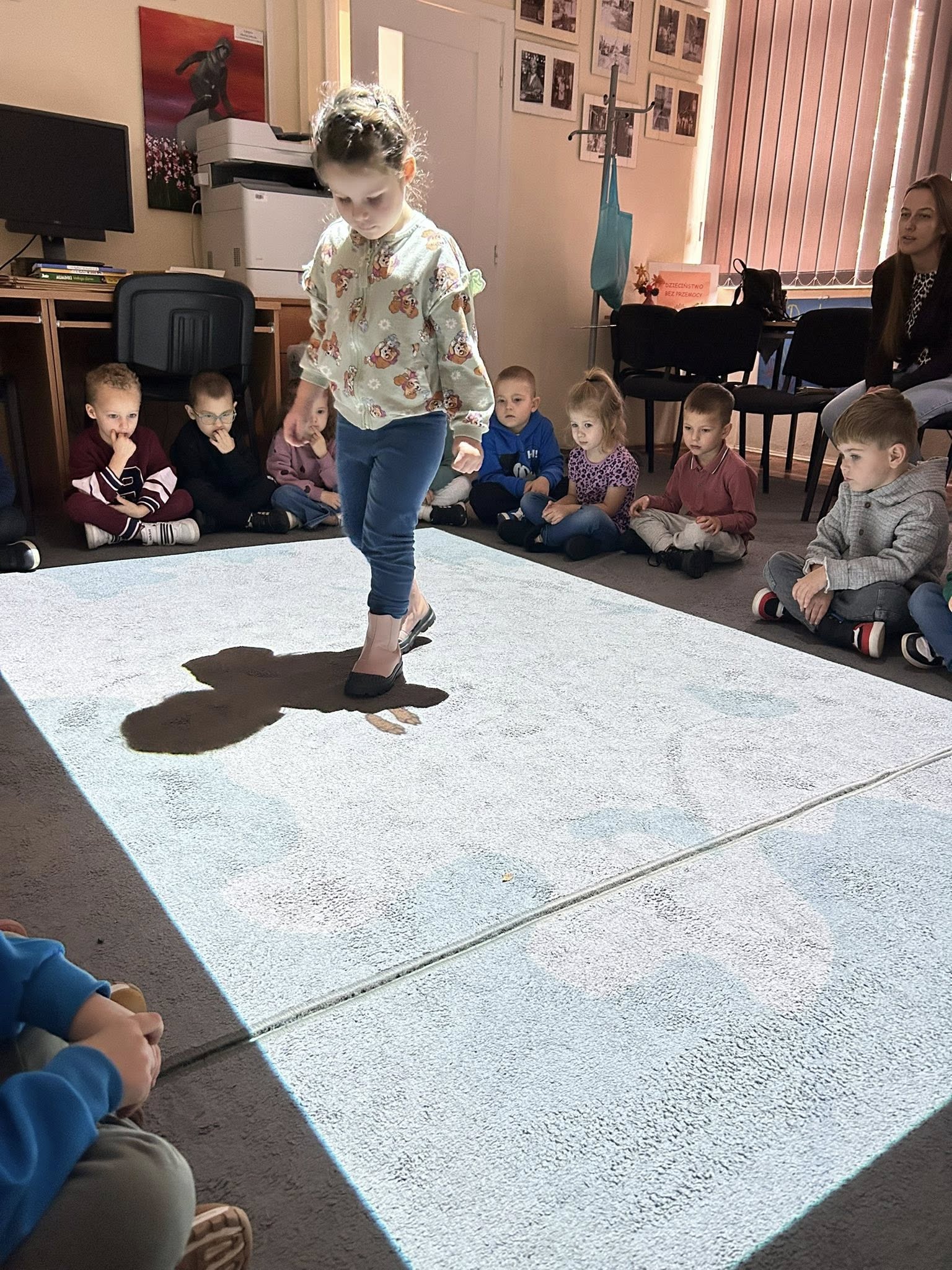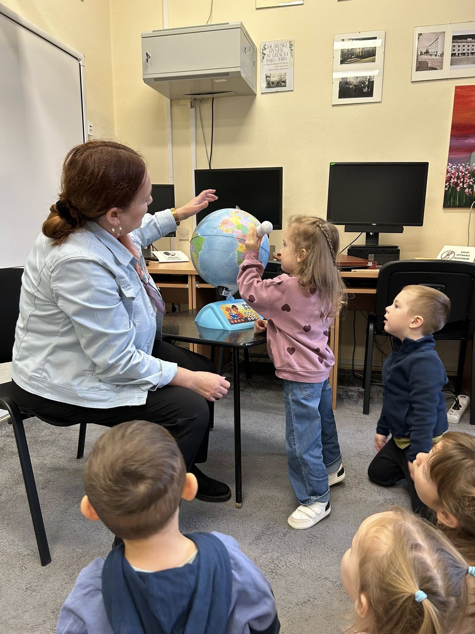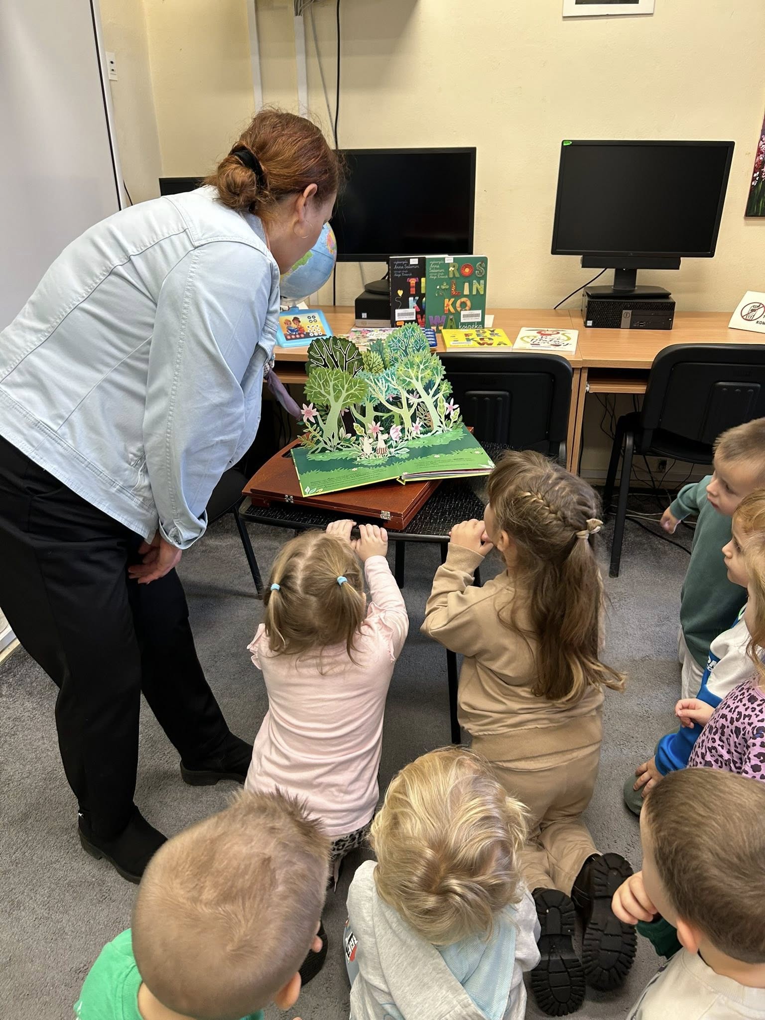 29 października 2025 r. dzieci z grupy „Księżyce" z MPS nr 4 w Mławie wybrały się z wizytą do biblioteki pedagogicznej. Pani Agata Mierzwa – kierownik biblioteki – opowiedziała przedszkolakom o pracy bibliotekarza oraz zaprezentowała im bogaty zbiór książek dla dzieci, w różnych formatach – od najmniejszych po bardzo duże. Maluchy z zaciekawieniem oglądały prezentowane pozycje i wsłuchiwały się w czytane fragmenty. Dużą atrakcją okazał się również „interaktywny globus", dzięki któremu mogły wyruszyć w wirtualną podróż po świecie. Na zakończenie wizyty dzieci wzięły udział w zabawach na „Magicznym dywanie", zbierając cukierki, grając w piłkę oraz świetnie się bawiąc przy innych zadaniach.