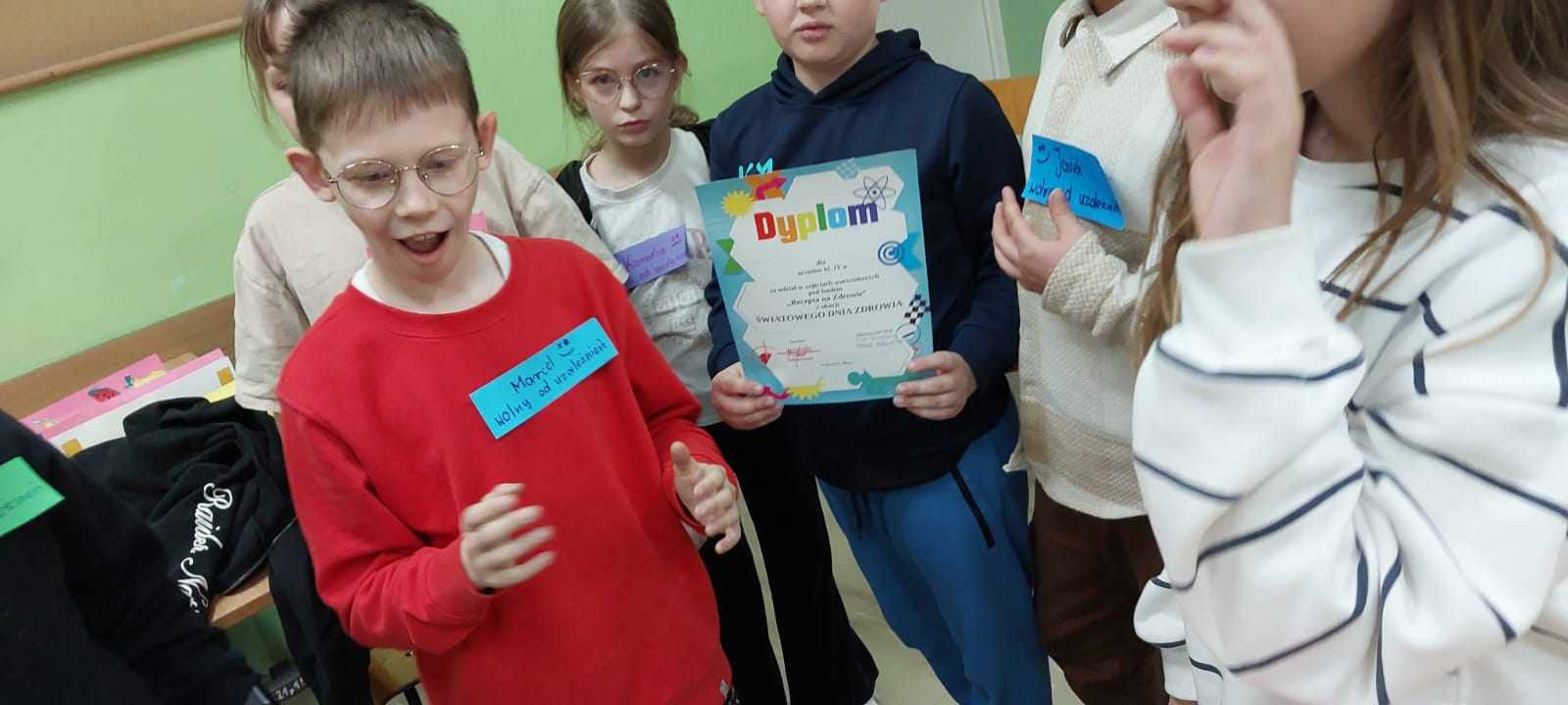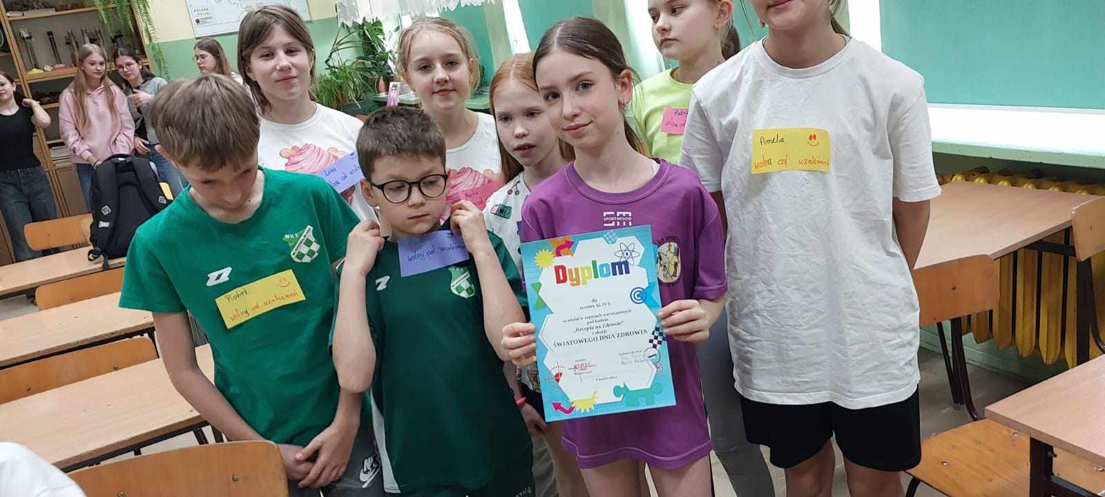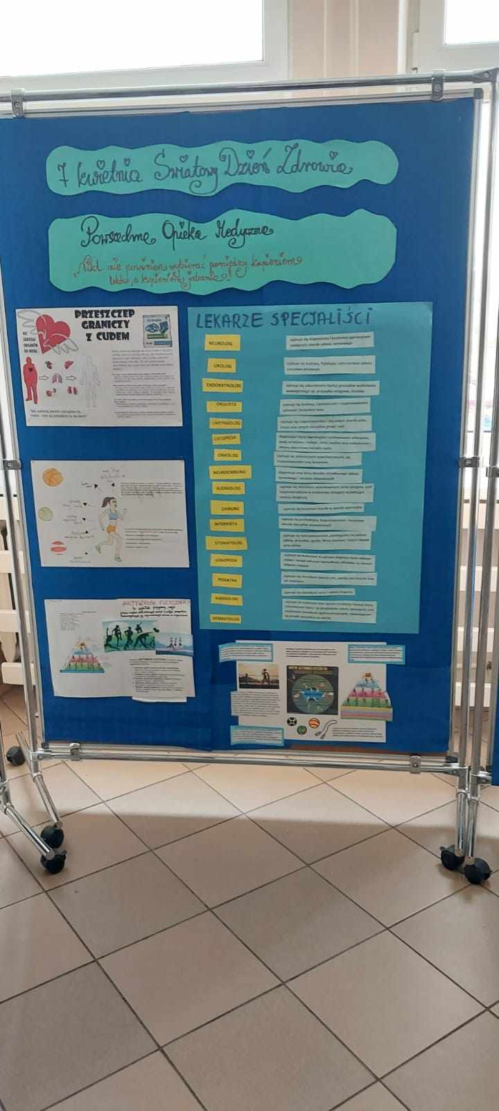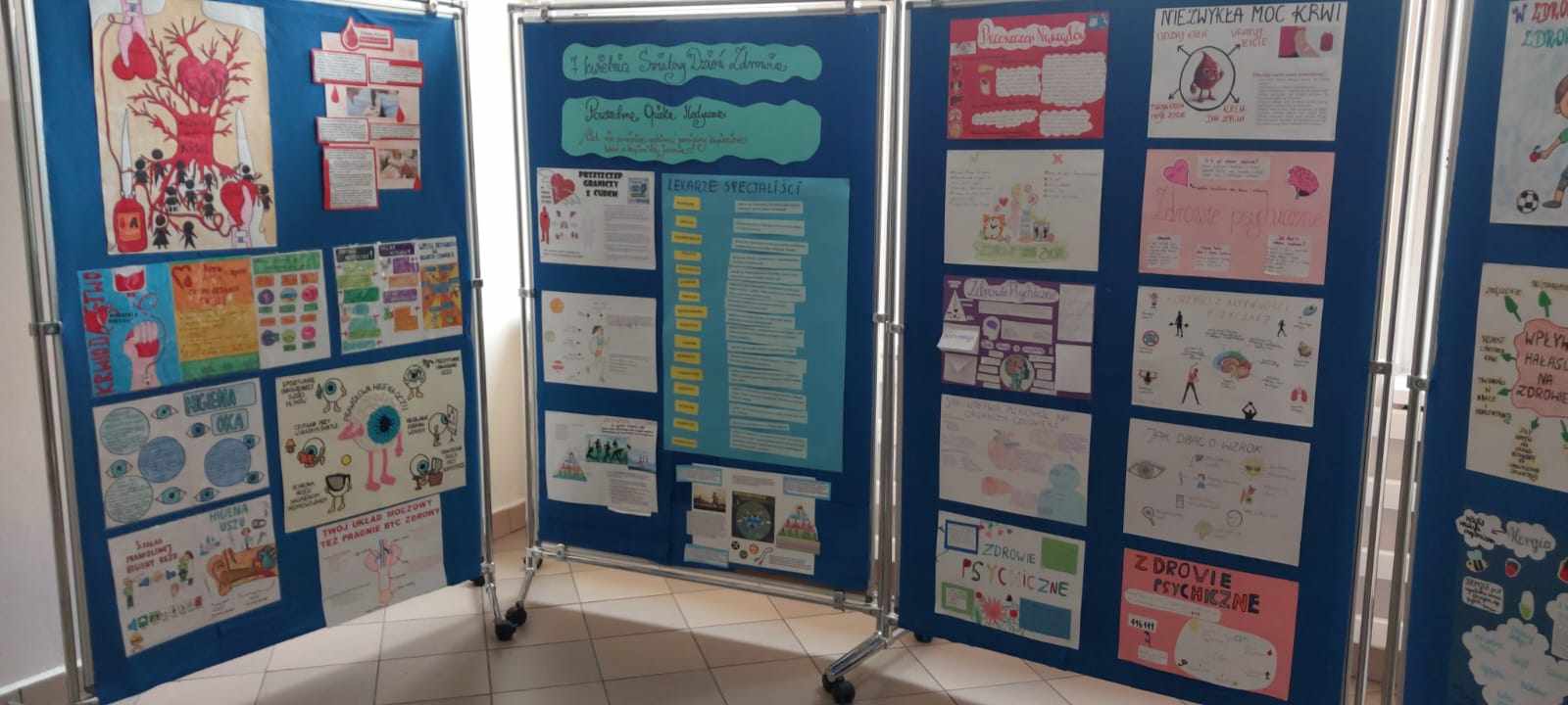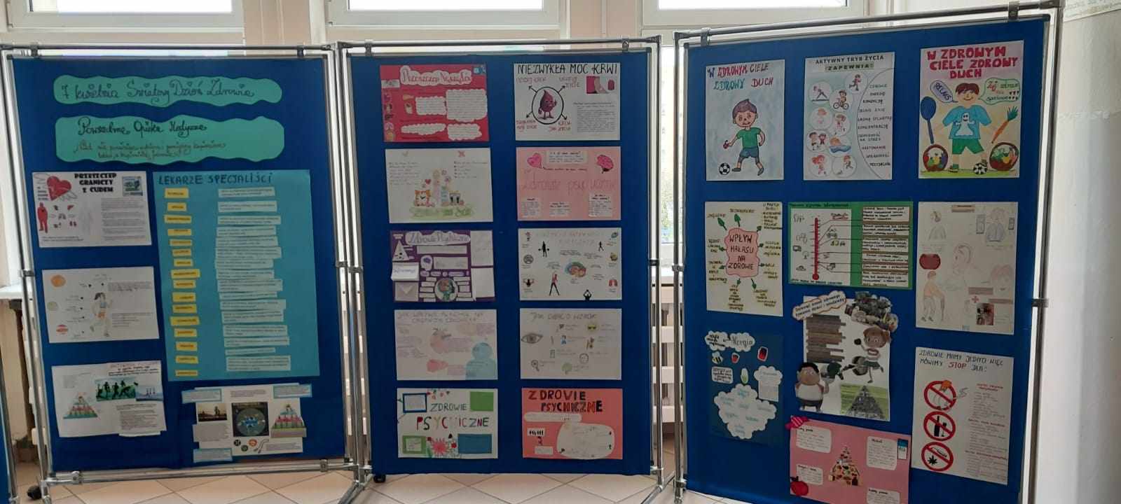 Zdrowe początki, pełna nadziei przyszłość to hasło przewodnie tegorocznych obchodów Dnia Zdrowia. Tradycyjnie w tym miesiącu na zajęciach lekcyjnych odbyły się pogadanki o tematyce zdrowotnej. Uczniowie oglądali filmy, prezentacje, rozwiązywali zadania interaktywne - jak dbać o dobrą kondycję ciała, umysłu oraz środowiska przyrodniczego. Uczniowie klas czwartych wzięli udział w zajęciach warsztatowych pod hasłem: ,, nasza recepta na zdrowie. Na poszczególnych stacjach analizowali piramidę zdrowego żywienia, rozmawiali o uzależnieniach, uczestniczyli w grze: zdrowe podchody. Uczniowie z klas siódmych na plakatach przedstawili zasady higieny narządu wzroku i słuchu. Zaś ósmoklasiści podali niekorzystny wpływ alkoholu na organizm człowieka. Szóstoklasiści opracowali ulotki z zasadami postępowania w przypadku ukąszenia przez żmiję. Powstałe materiały zostały umieszczone na gazetce na szkolnym korytarzu.
