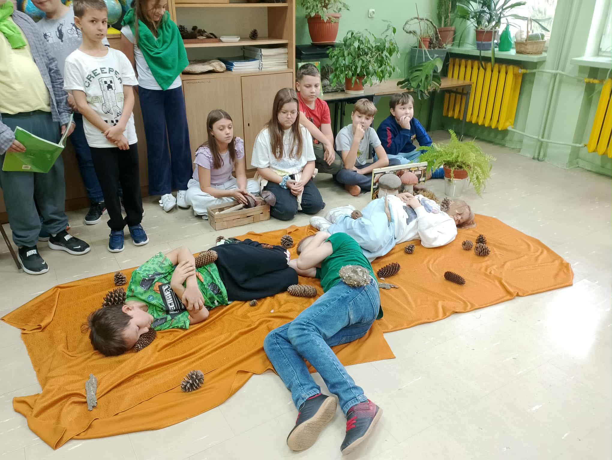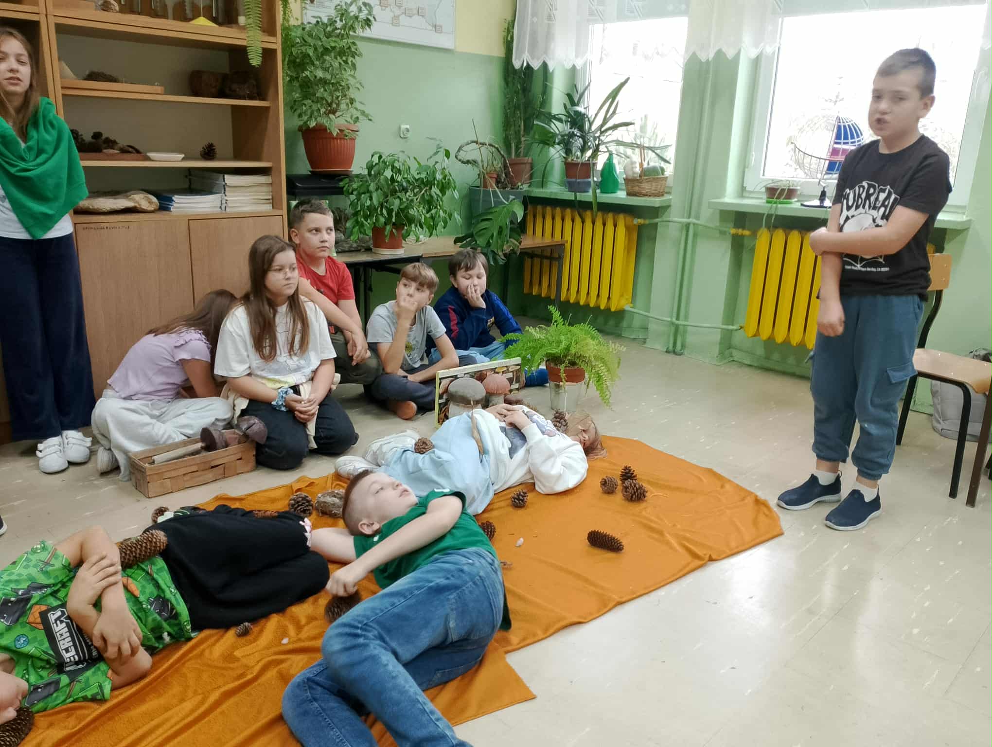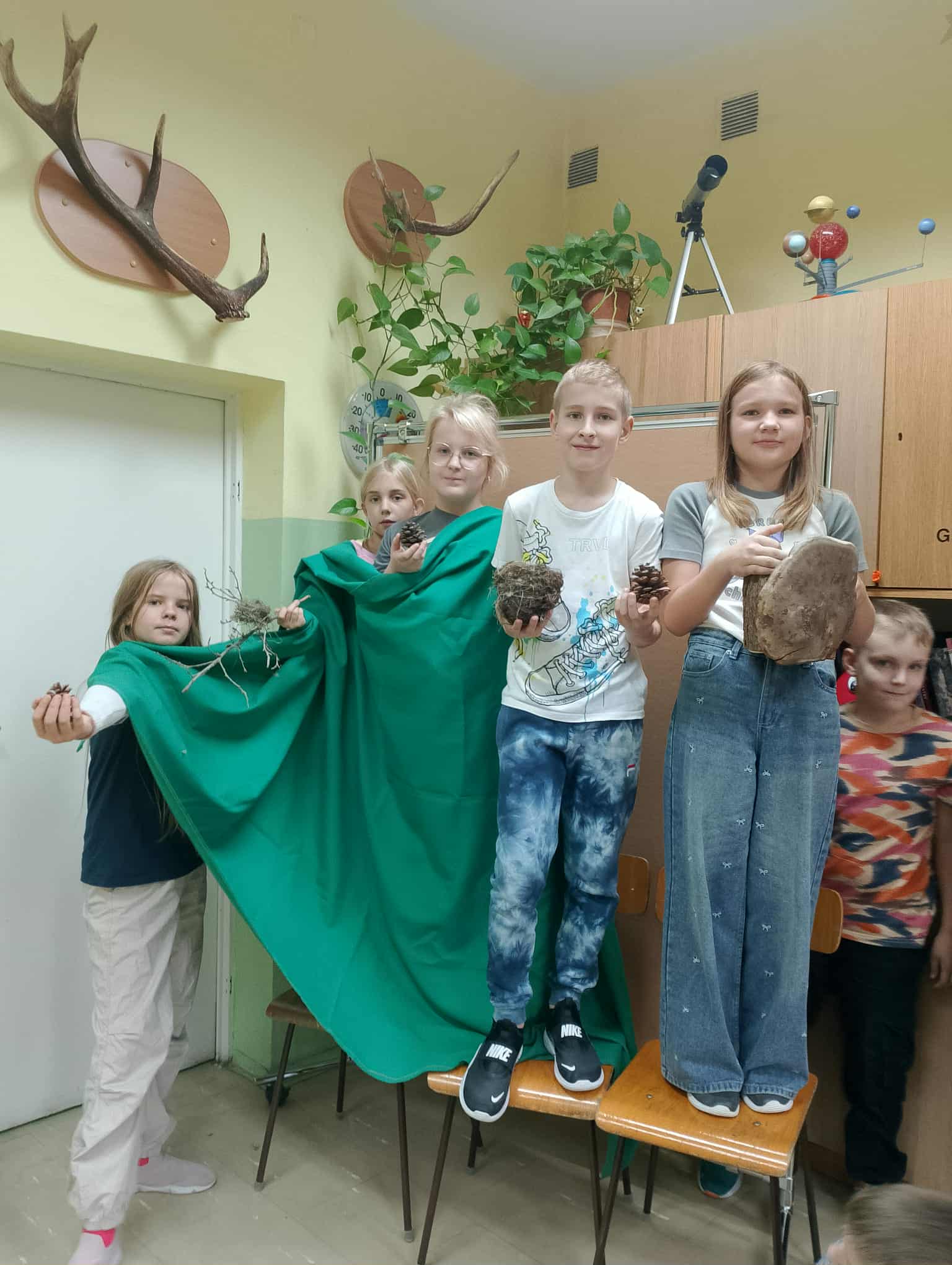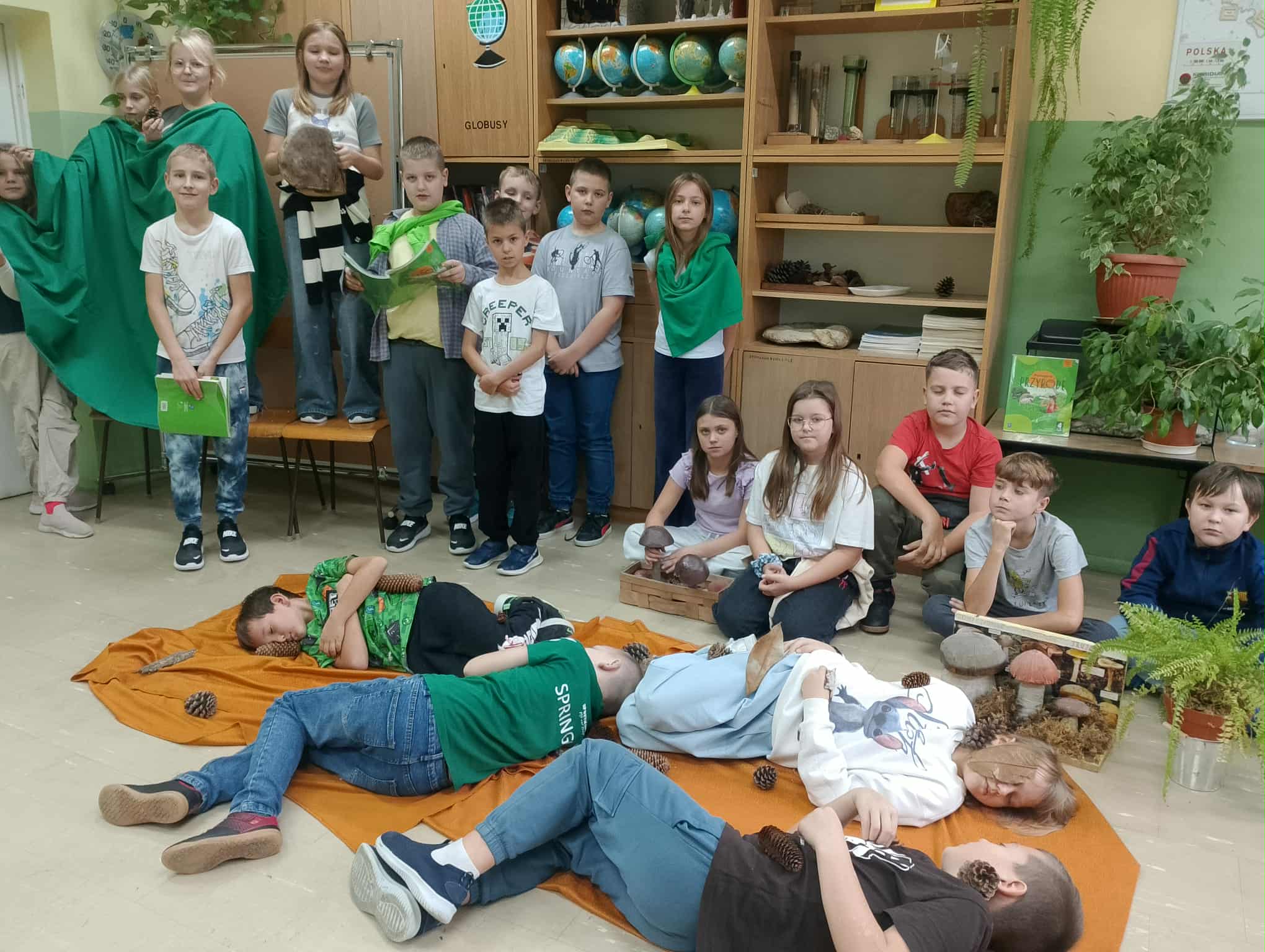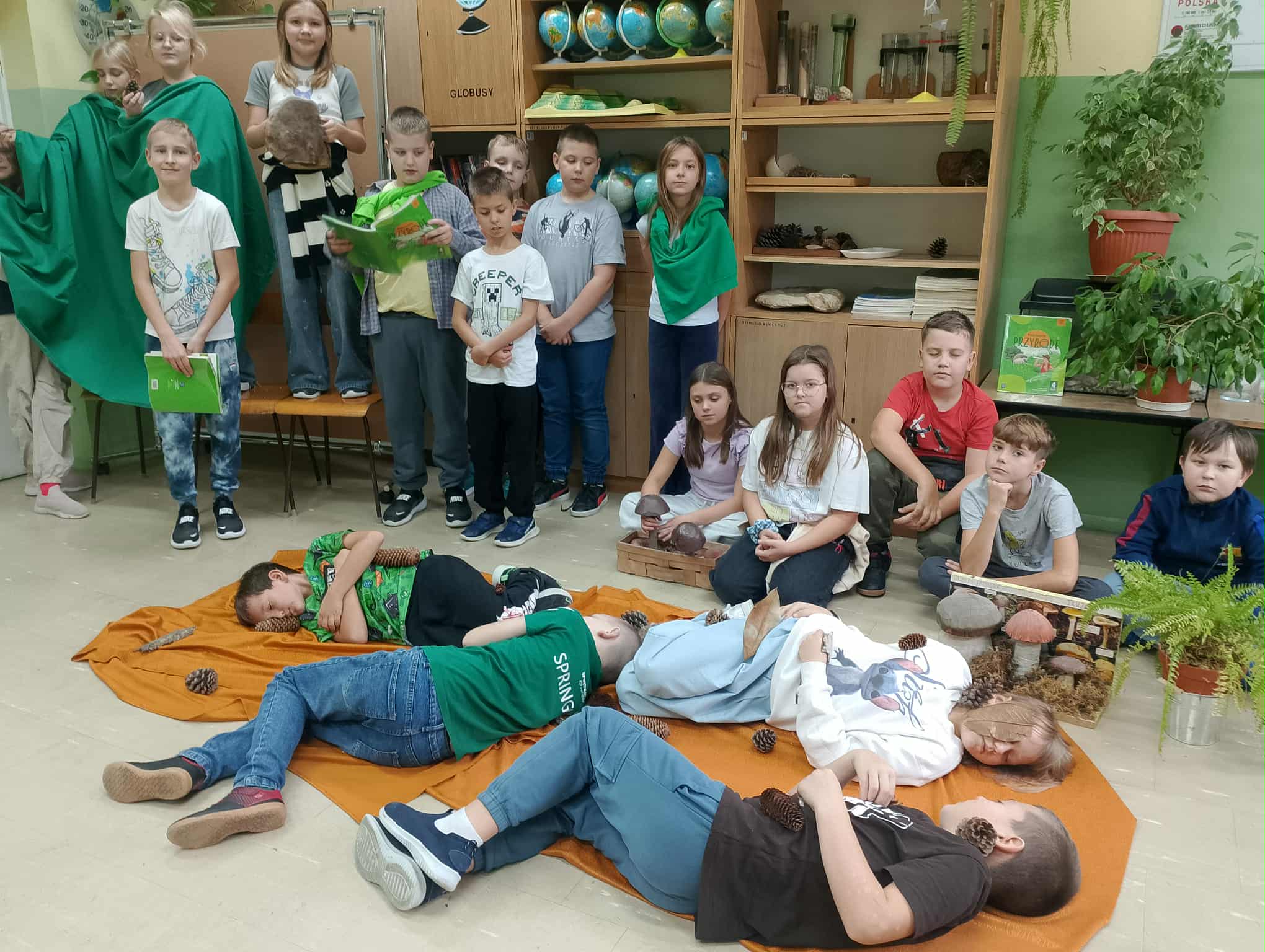 Lekcja przyrody w klasie 4a dotyczyła budowy lasu, w szczególności charakterystyki jego warstw (ściółka, runo leśne, podszyt, korony drzew) oraz warunków życia w lesie. Zajęcia miały charakter teatru edukacyjnego. Grupy uczniów przedstawiały warstwy lasu, dzieci wcielały się w drzewa, krzewy, niskie rośliny, grzyby typowe dla danej warstwy lasu.