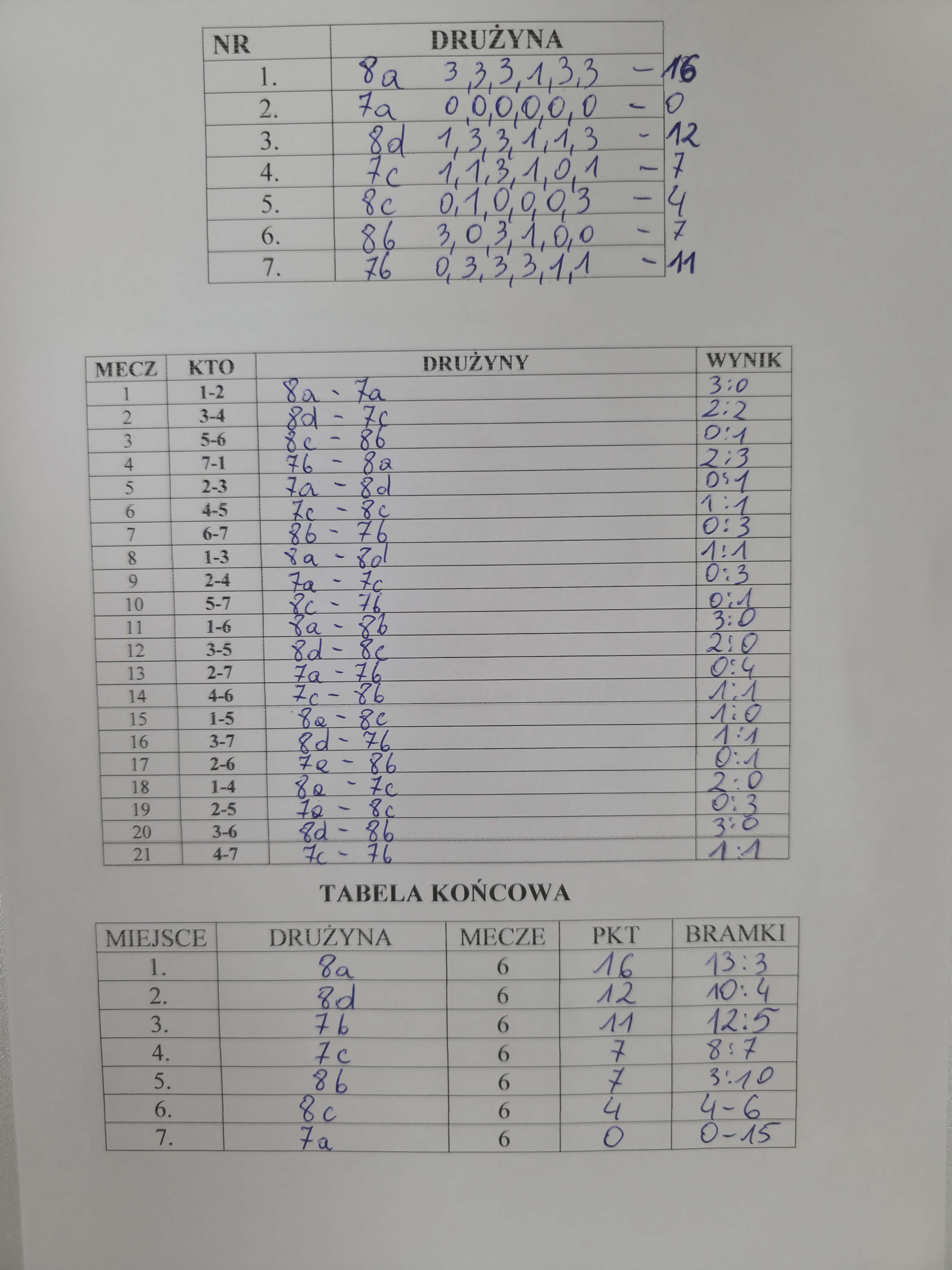 MISTRZEM SZKOŁY w halowej piłce nożnej klas 7 i 8 została klasa 8a, drugie miejsce 8d, trzecie 7b. Gratulacje dla wszystkich za sportową postawę, zaangażowanie i walkę o każdą piłkę.