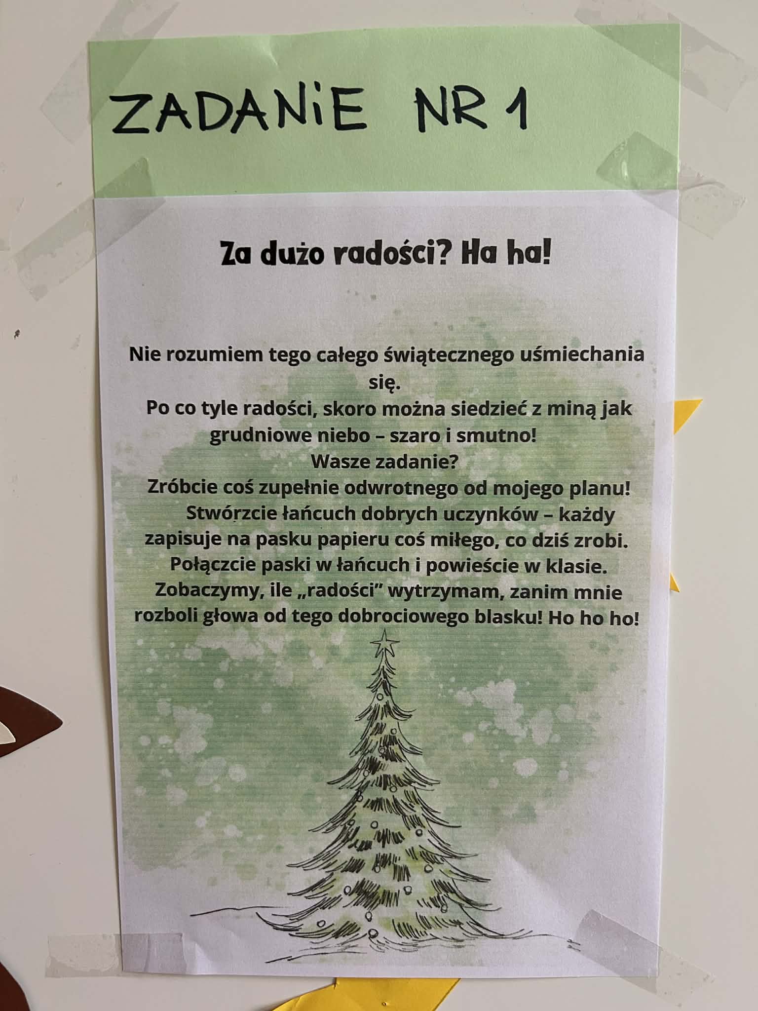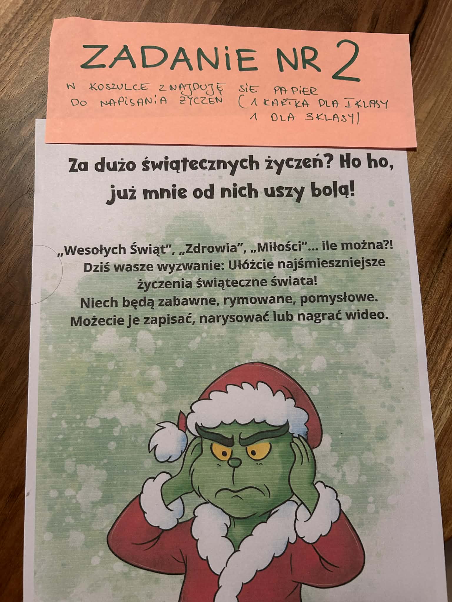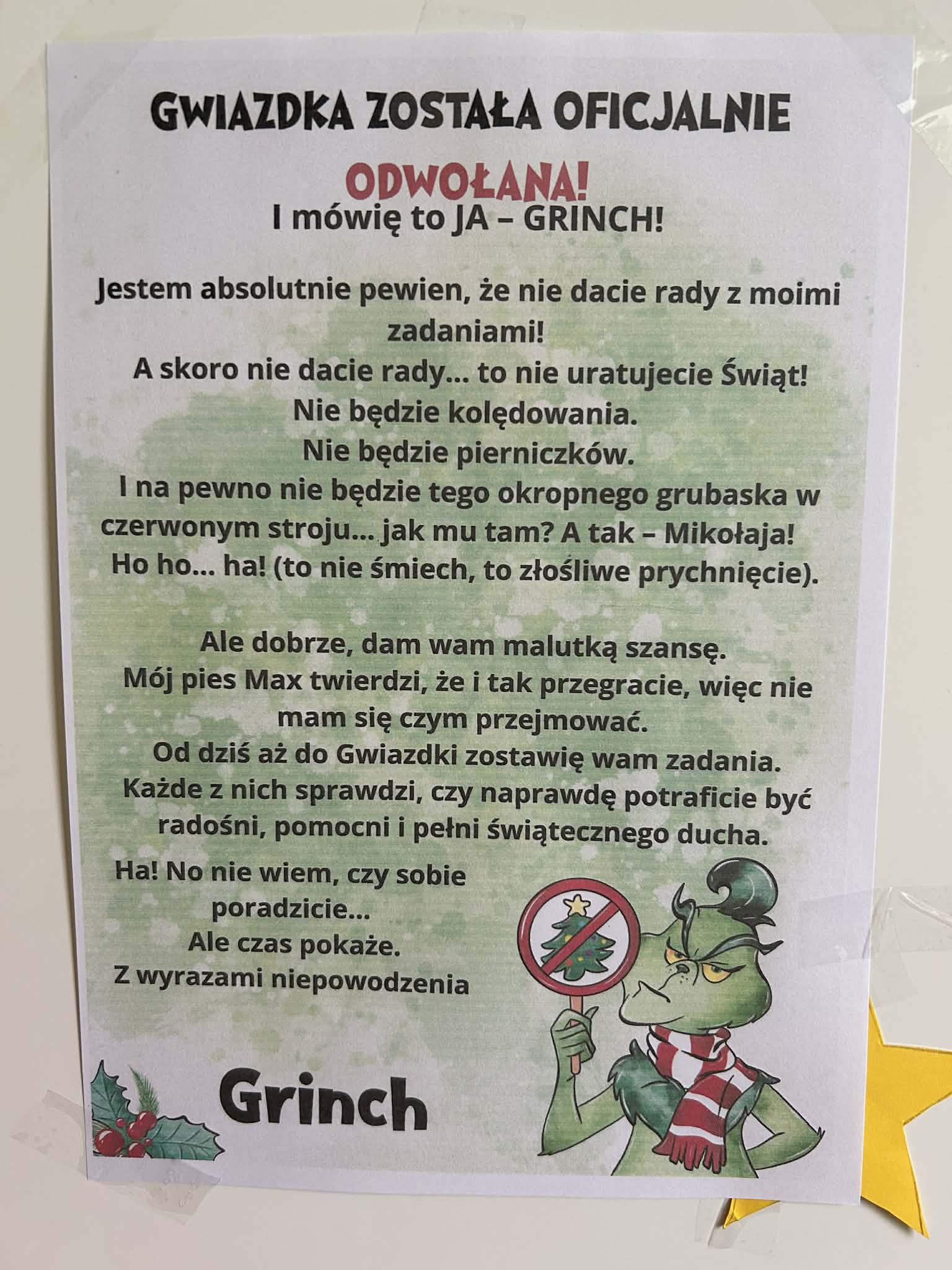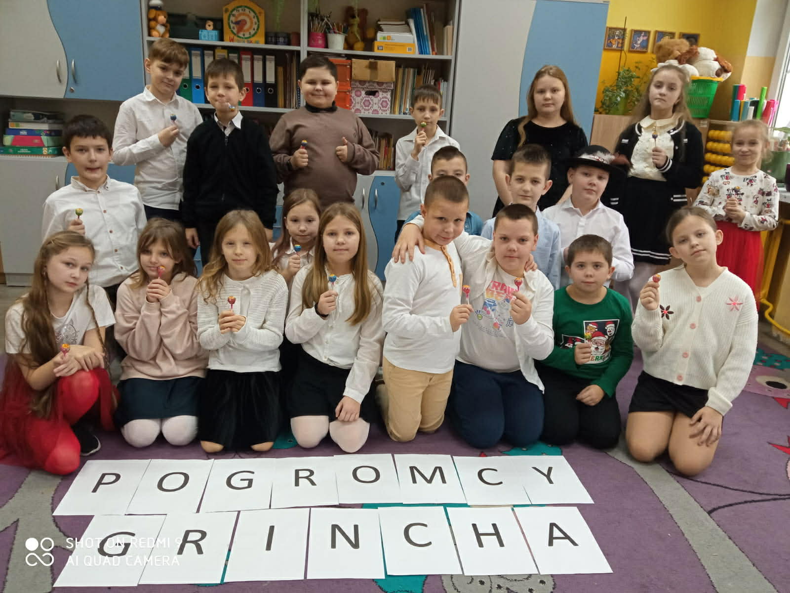 Na początku grudnia uczniowie klas 1-3 stanęli przed niezwykłym wyzwaniem - uratowaniem Świąt Bożego Narodzenia! Podstępny Grinch postanowił je odwołać. Tylko wykonanie zadań przygotowanych przez niego, mogło ocalić Gwiazdkę. Czy dzieciaki zawiodły? Oczywiście, że nie! Stworzyły łańcuchy dobrych uczynków, ułożyły świąteczne życzenia i zrobiły klasowe serca dobra. A na koniec te wszystkie klasowe wigilie, śpiewanie kolęd, wręczanie sobie upominków… Tego Grinch nie mógł znieść Musiał uznać swoją porażkę. A dzieciaki? Zasłużyły na miano Pogromców Grincha. Ciekawe, co wymyśli w przyszłym roku…