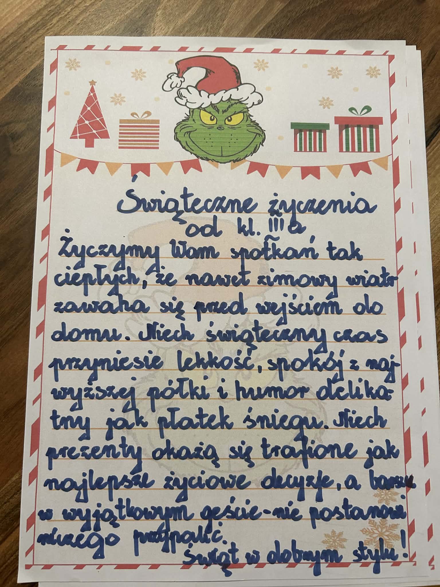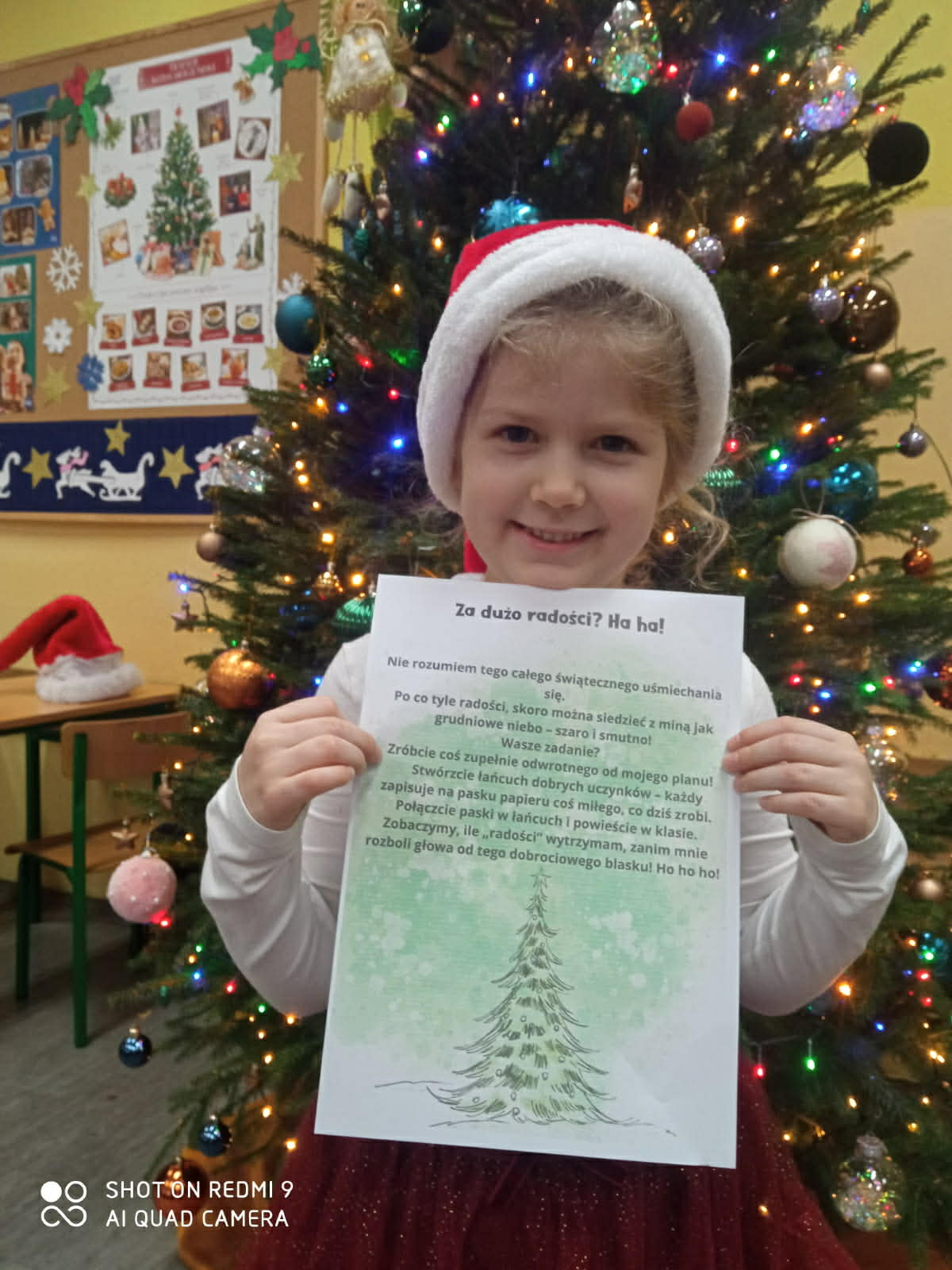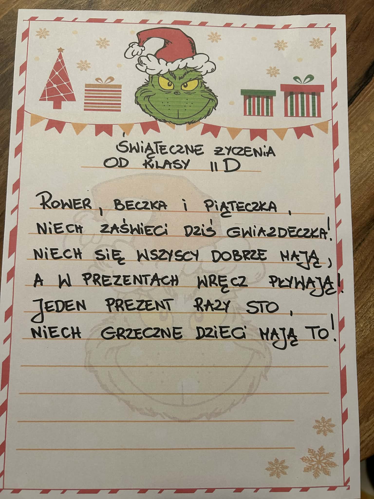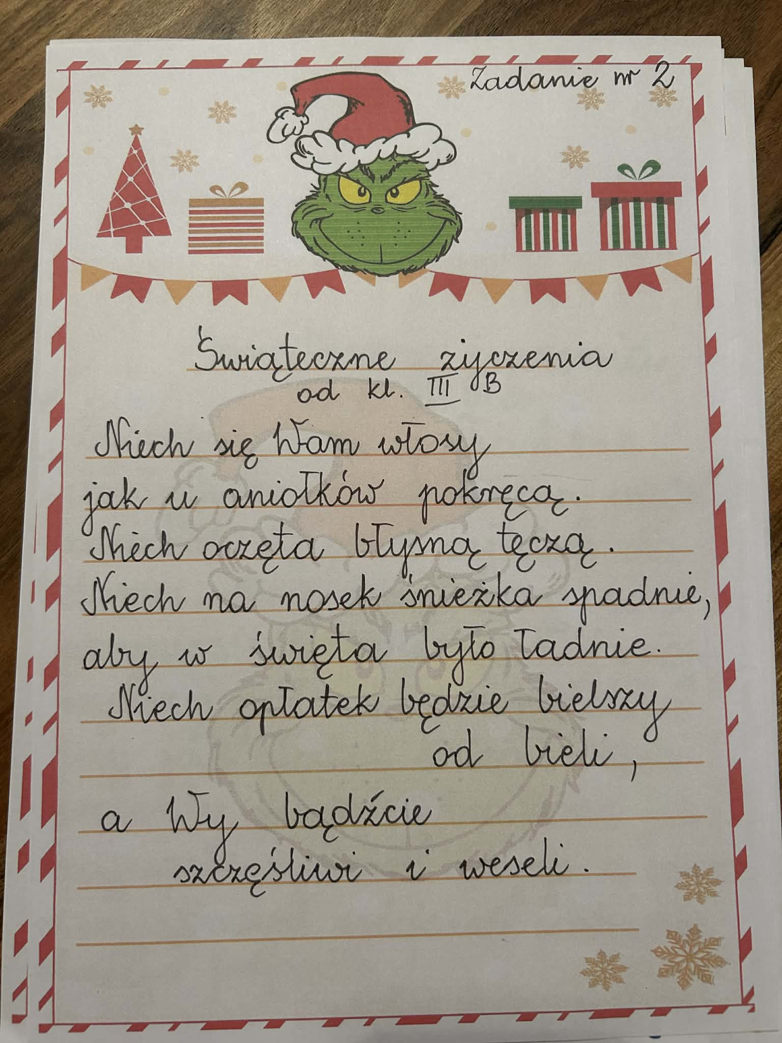 Na początku grudnia uczniowie klas 1-3 stanęli przed niezwykłym wyzwaniem - uratowaniem Świąt Bożego Narodzenia! Podstępny Grinch postanowił je odwołać. Tylko wykonanie zadań przygotowanych przez niego, mogło ocalić Gwiazdkę. Czy dzieciaki zawiodły? Oczywiście, że nie! Stworzyły łańcuchy dobrych uczynków, ułożyły świąteczne życzenia i zrobiły klasowe serca dobra. A na koniec te wszystkie klasowe wigilie, śpiewanie kolęd, wręczanie sobie upominków… Tego Grinch nie mógł znieść Musiał uznać swoją porażkę. A dzieciaki? Zasłużyły na miano Pogromców Grincha. Ciekawe, co wymyśli w przyszłym roku…