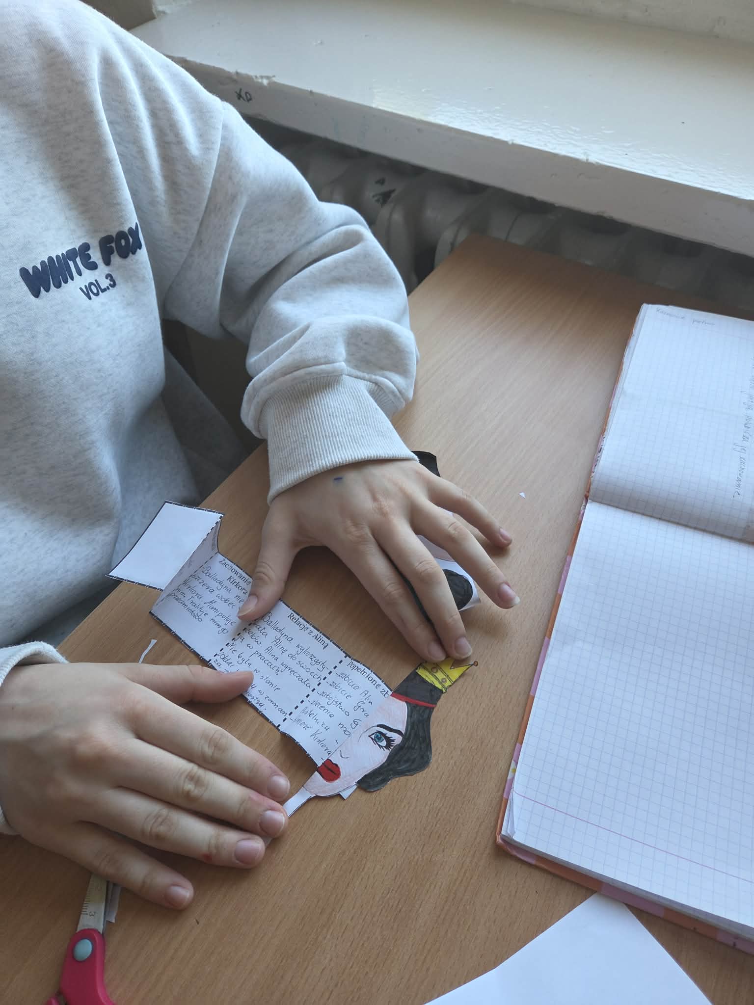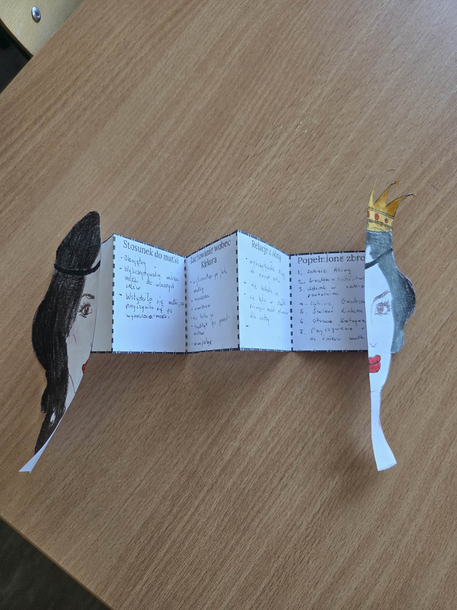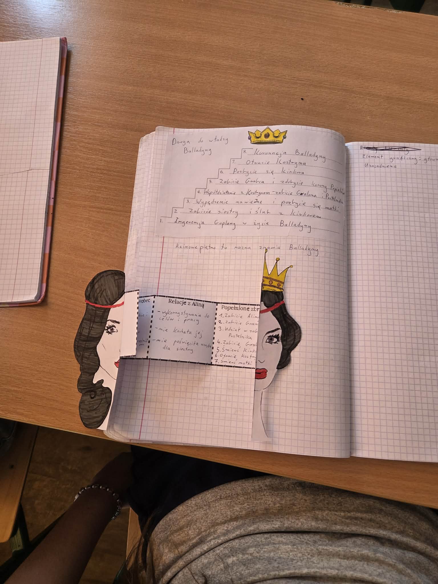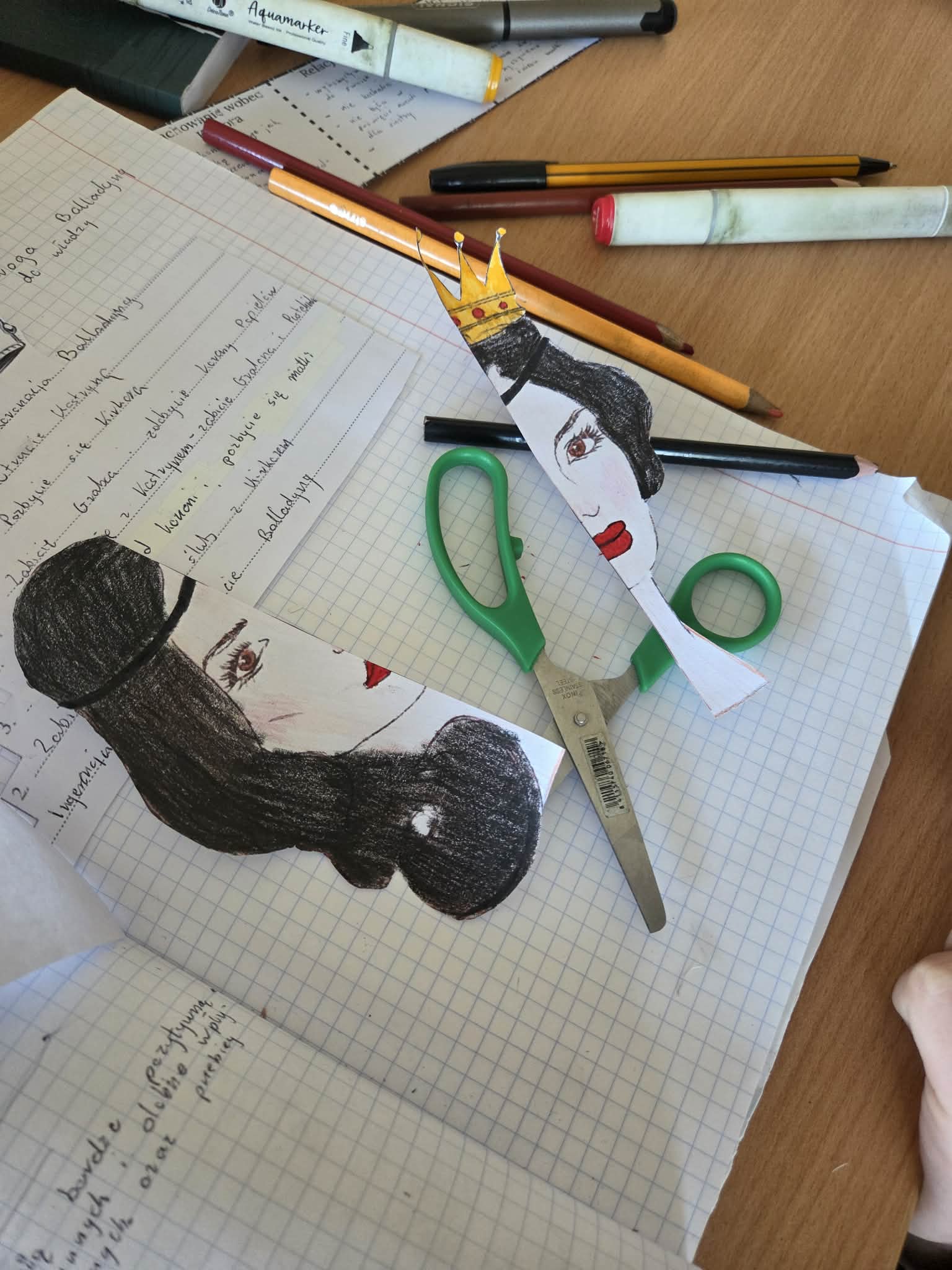 Kreatywną częścią lekcji było zadanie plastyczno-interpretacyjne polegające na stworzeniu „ukrytej twarzy Balladyny”. Celem pracy było ukazanie symbolicznego postępowania bohaterki , jej przemiany, ambicji, winy oraz konsekwencji podejmowanych decyzji. Powstałe prace pokazały, jak różnorodnie można interpretować postać Balladyny i jak wiele emocji oraz znaczeń kryje się w tej literackiej bohaterce.