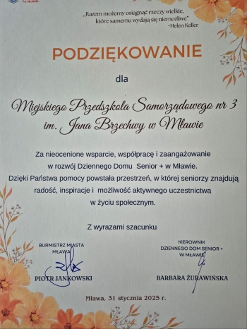 Zapytanie dziś w przedszkolu: Kto chce iść do seniorów ? Las rąk widać, nie do wiary ! Z seniorami takie czary ? Dzieci chętnie chodzą tu. Z życzeniami, z kokardkami i wierszami. By nam wszystkim było miło. Chyba o to w życiu nam chodziło. Z okazji jubileuszu 5-lecia istnienia Dziennego Domu Seniora + w Mławie. Życzymy wielu uśmiechów i niezliczonej ilości spotkań w tak przemiłej atmosferze. Dziękujemy za dotychczasową współpracę i wyróżnienie naszej placówki.