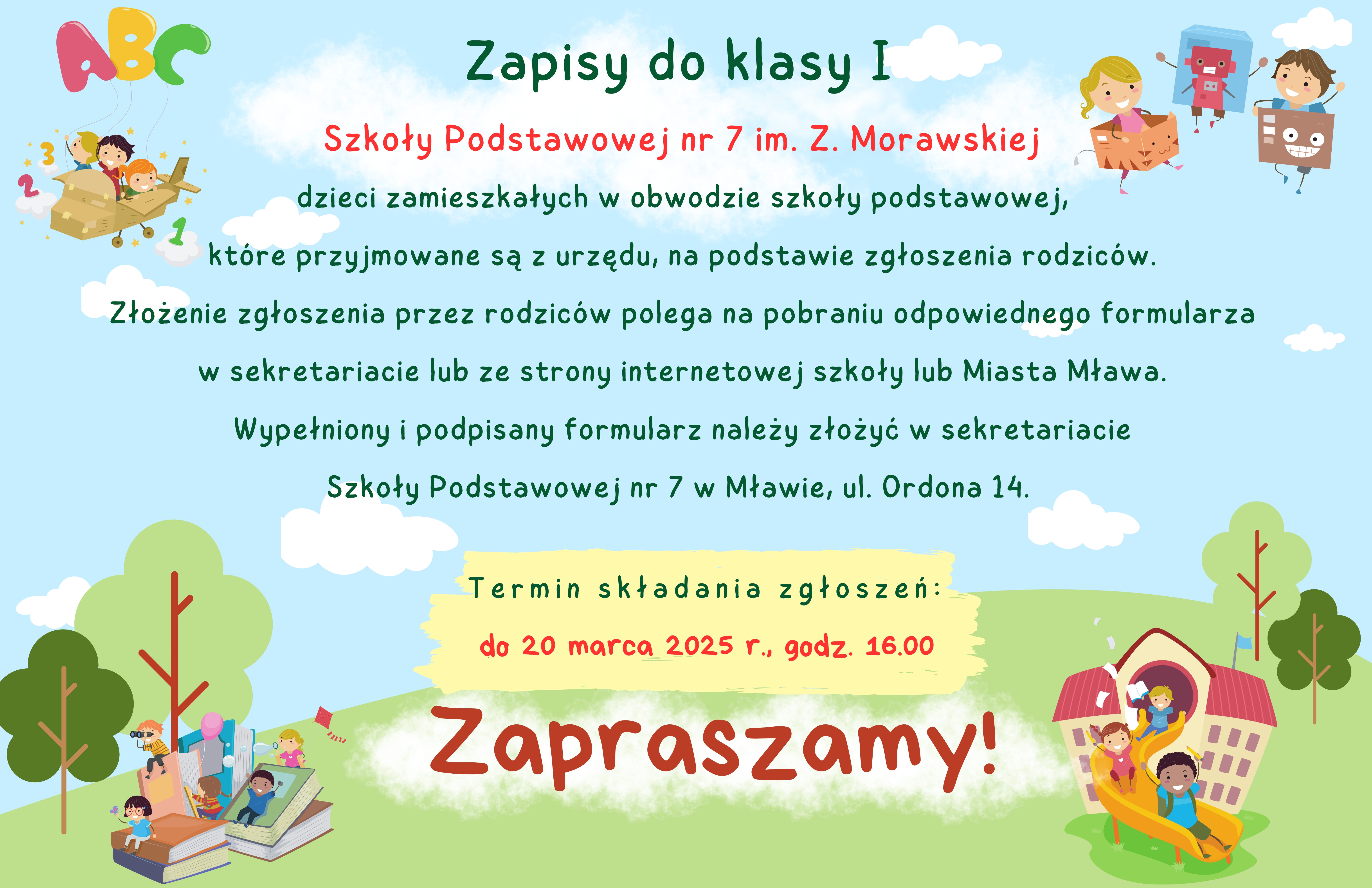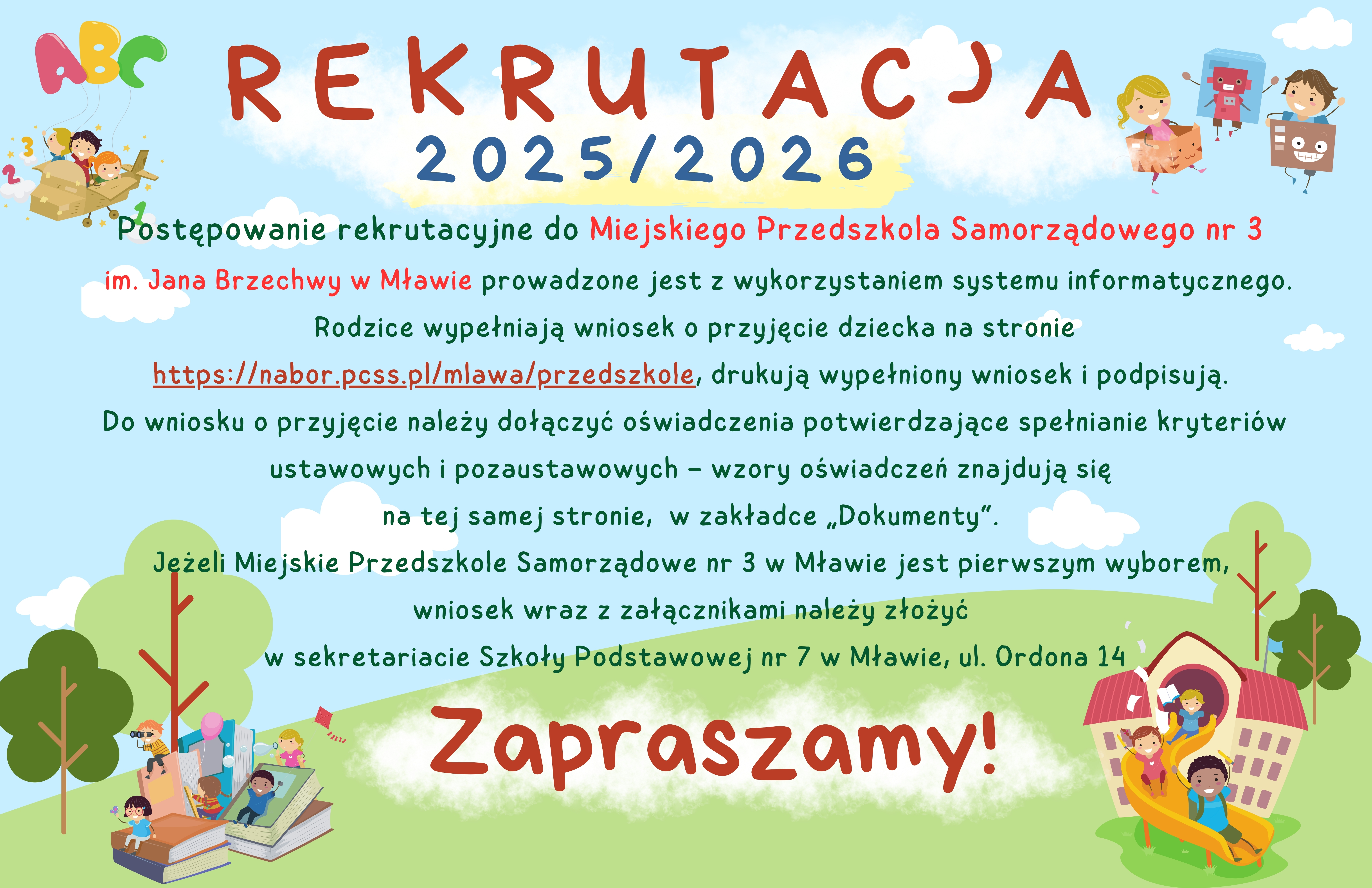 rusza rekrutacja do Miejskiego Przedszkola Samorządowego nr 3 im. Jana Brzechwy w Mławie oraz zapisy do klasy I Szkoły Podstawowej nr 7 na rok szkolny 2025/2026. Zainteresowane osoby proszę o szczegółowe zapoznanie się z zamieszczonymi dokumentami, wypełnienie odpowiednich do Państwa sytuacji formularzy oraz załączników i we wskazanym terminie zgłoszenie się do sekretariatu Szkoły Podstawowej nr 7.