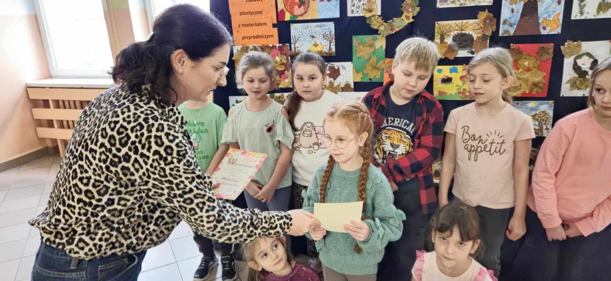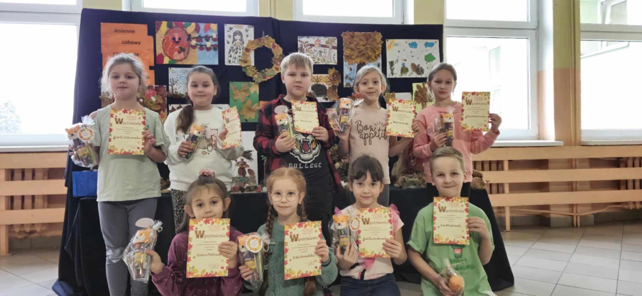20.11.2024r. odbyło się rozstrzygnięcie Konkursu Plastyczno – Technicznego pt. „Jesienne zabawy plastyczne z materiałem przyrodniczym”. Konkurs adresowany był do uczniów kl. I-III. Prace były oceniane w dwóch kategoriach: płaskiej oraz przestrzennej, biorąc pod uwagę pomysłowość, ilość użytego materiału przyrodniczego, estetykę dokonano oceny i wyłoniono następujących laureatów: