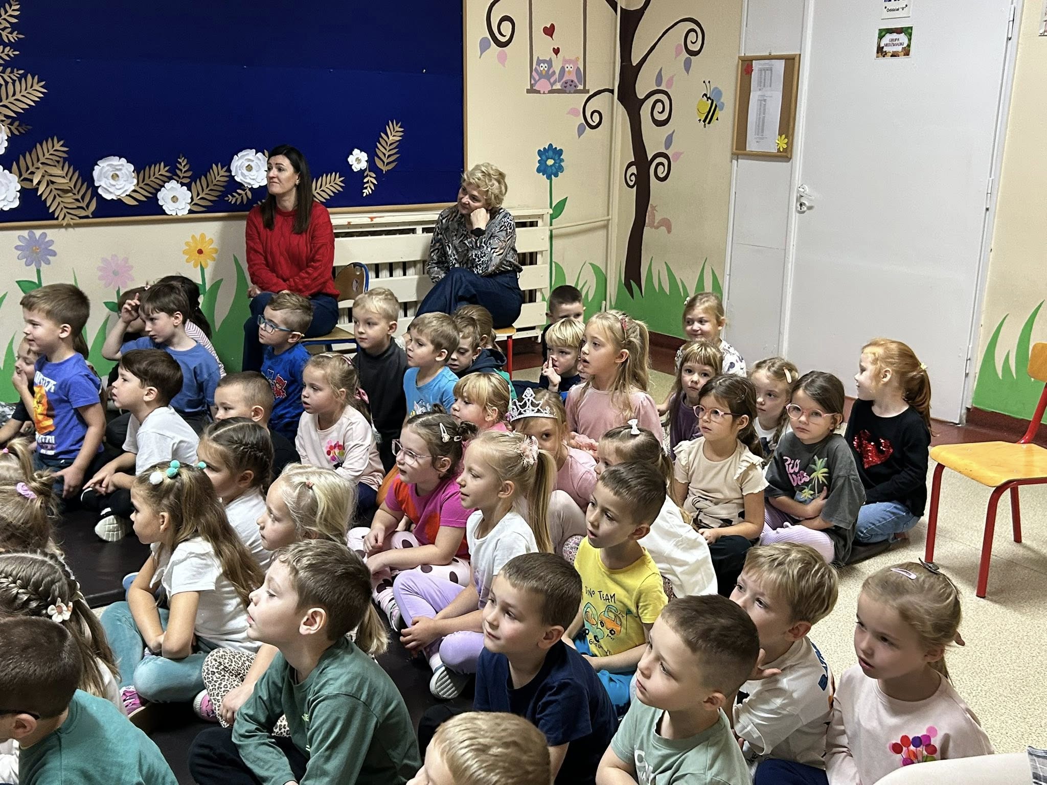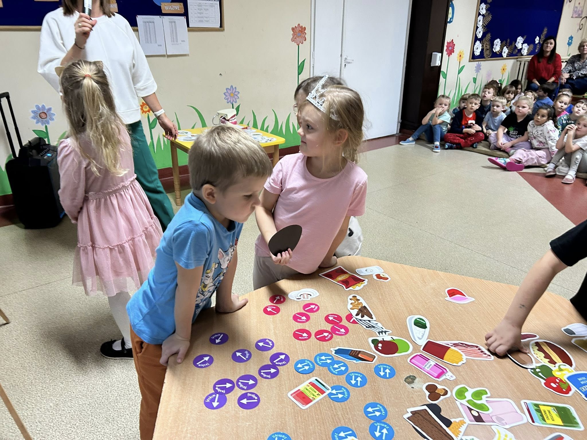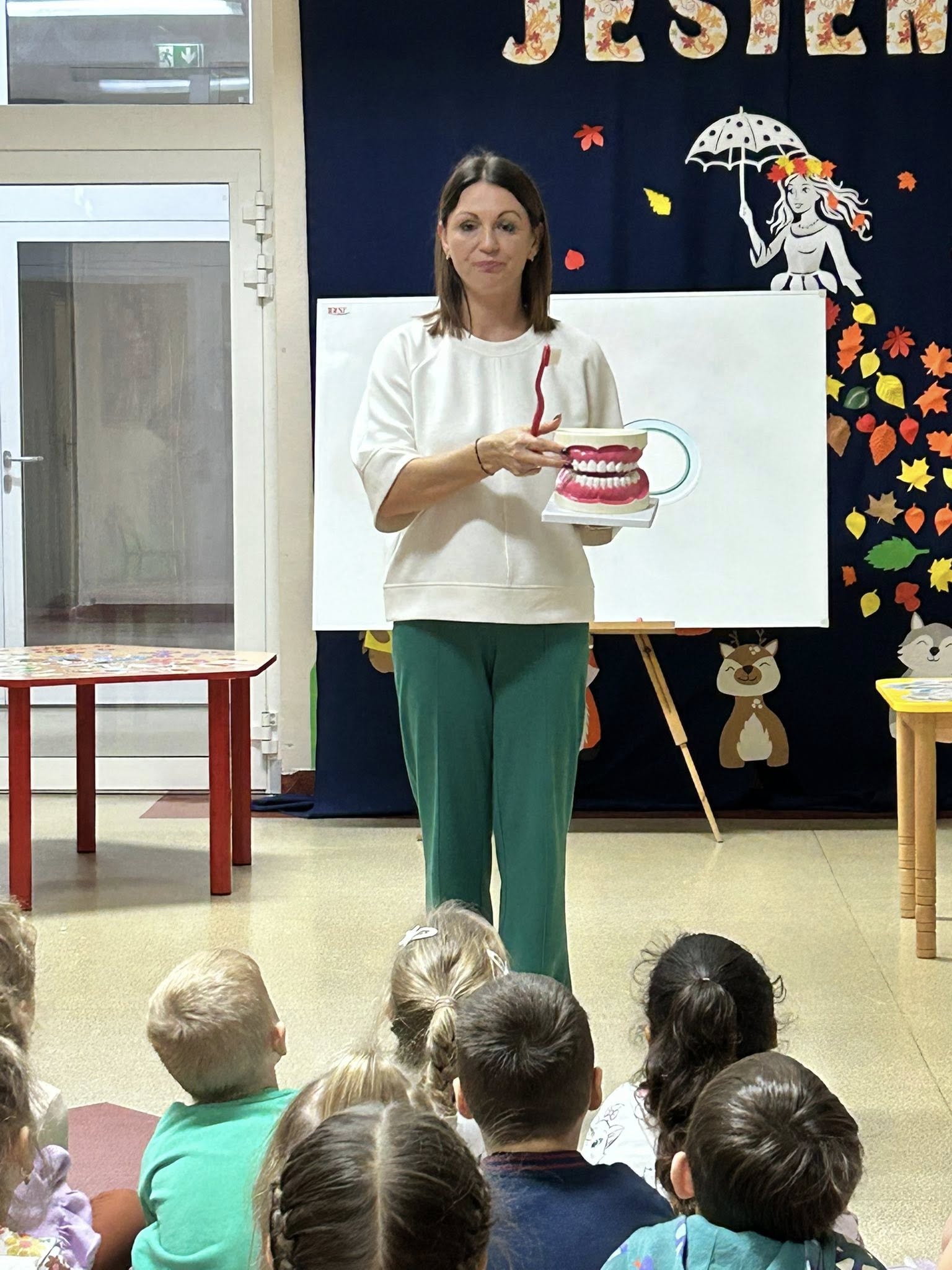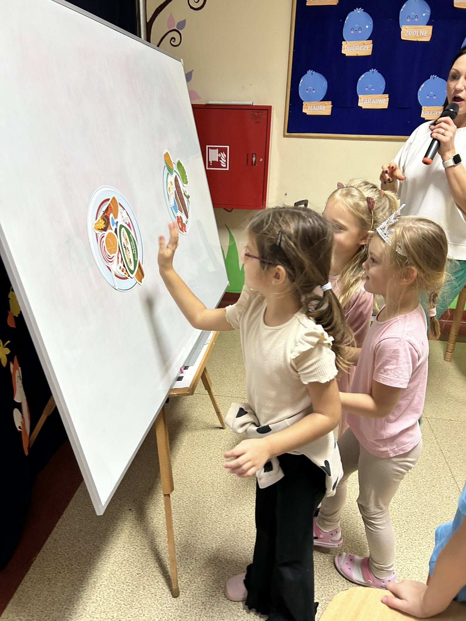 Dzieci z entuzjazmem uczestniczyły w zajęciach praktycznych, klasyfikując produkty na zdrowe i niezdrowe, a także obejrzały prezentację dotyczącą prawidłowego szczotkowania zębów.