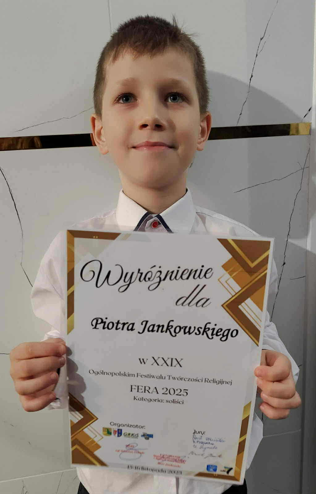 Wyróżnienie w kategorii solistów klas I–III otrzymaÅ‚ Piotr Jankowski, który swoim wystÄ™pem pokazaÅ‚, że w najmÅ‚odszych artystach drzemie ogromny potencjaÅ‚. Brawo, Piotrek!