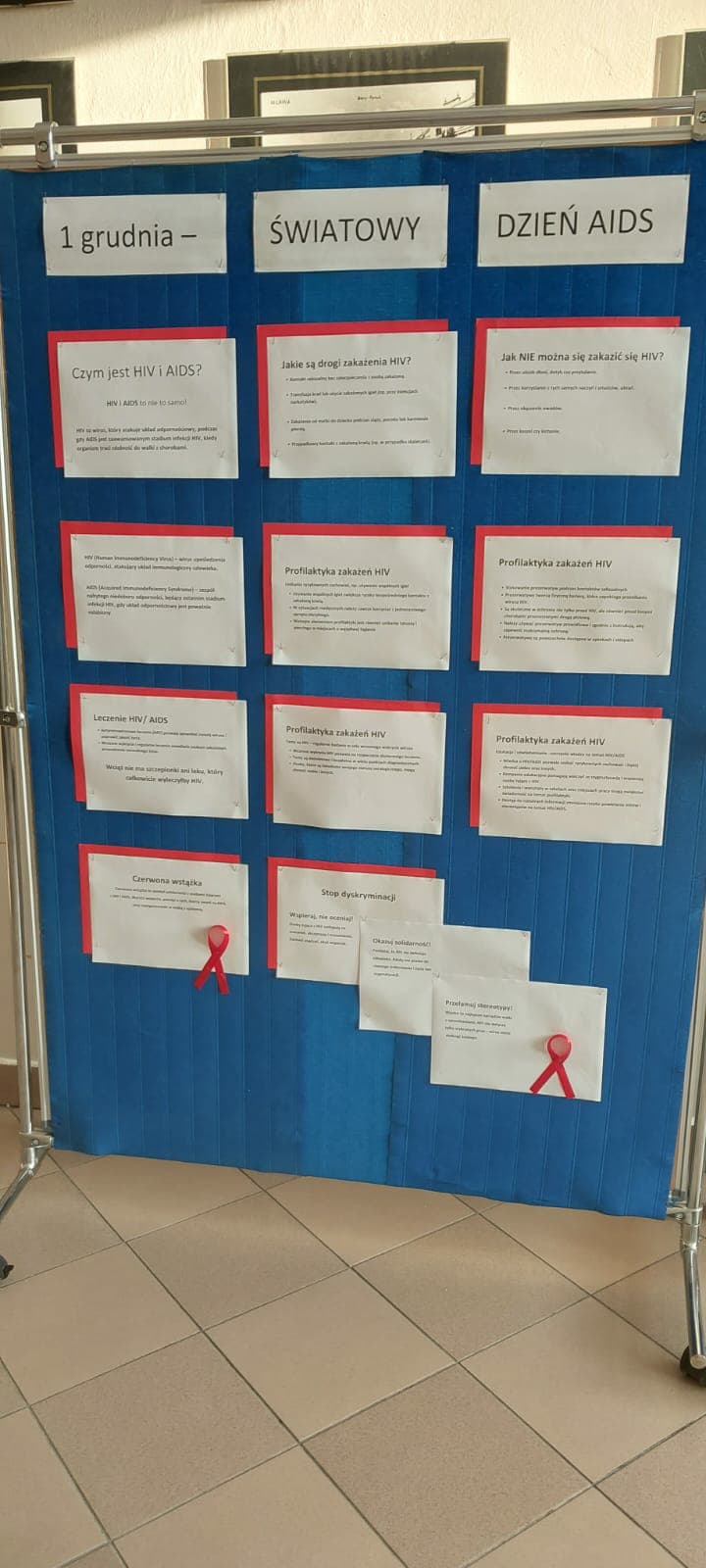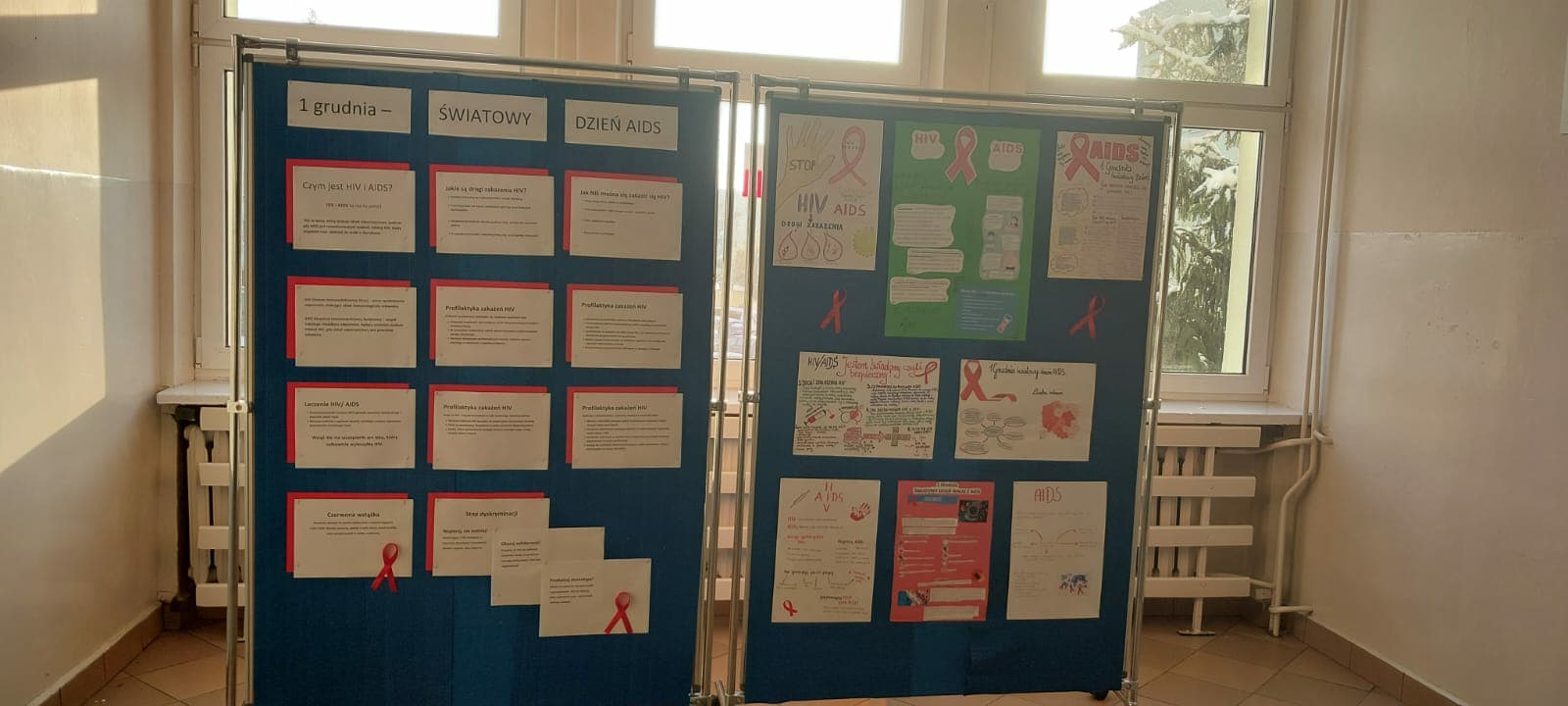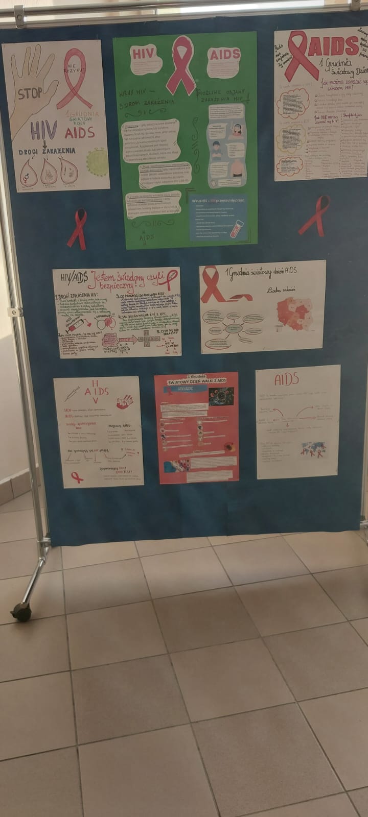 1 grudnia - Światowy Dzień AIDS - dzień, który przypomina o globalnej walce z HIV / AIDS oraz potrzebie edukacji i solidarności z osobami żyjącymi z tym wirusem. Uczniowie klasy 7 i 8 w czasie lekcji biologii, godziny wychowawczej i edukacji zdrowotnej obejrzeli filmy edukacyjne pod hasłem ,,AIDS - epidemia wciąż niepokonana oraz ,, Żyć z HIV, uczestniczyli w pogadance, została wykonana gazetka informacyjna o sposobach zarażenia się oraz profilaktyce HIV/AIDS i umieszczona na korytarzu szkolnym.