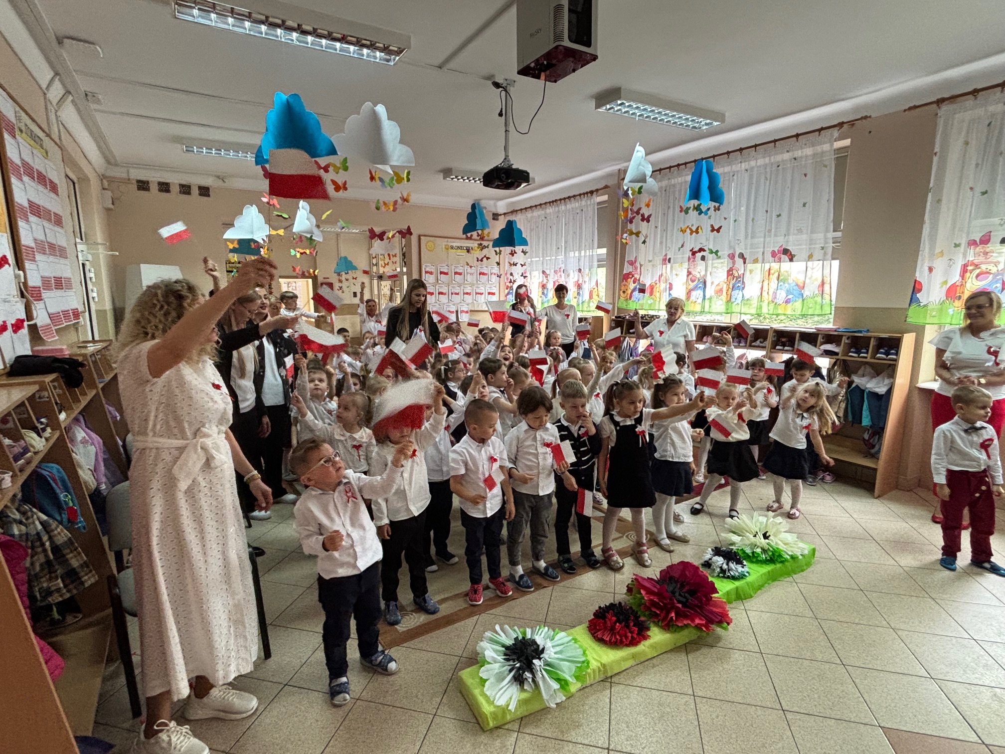 „Powiewa flaga, gdy wiatr się zerwie A na tej fladze biel jest i czerwień. Czerwień – to miłość, biel- serce czyste Piękne są nasze barwy ojczyste.”