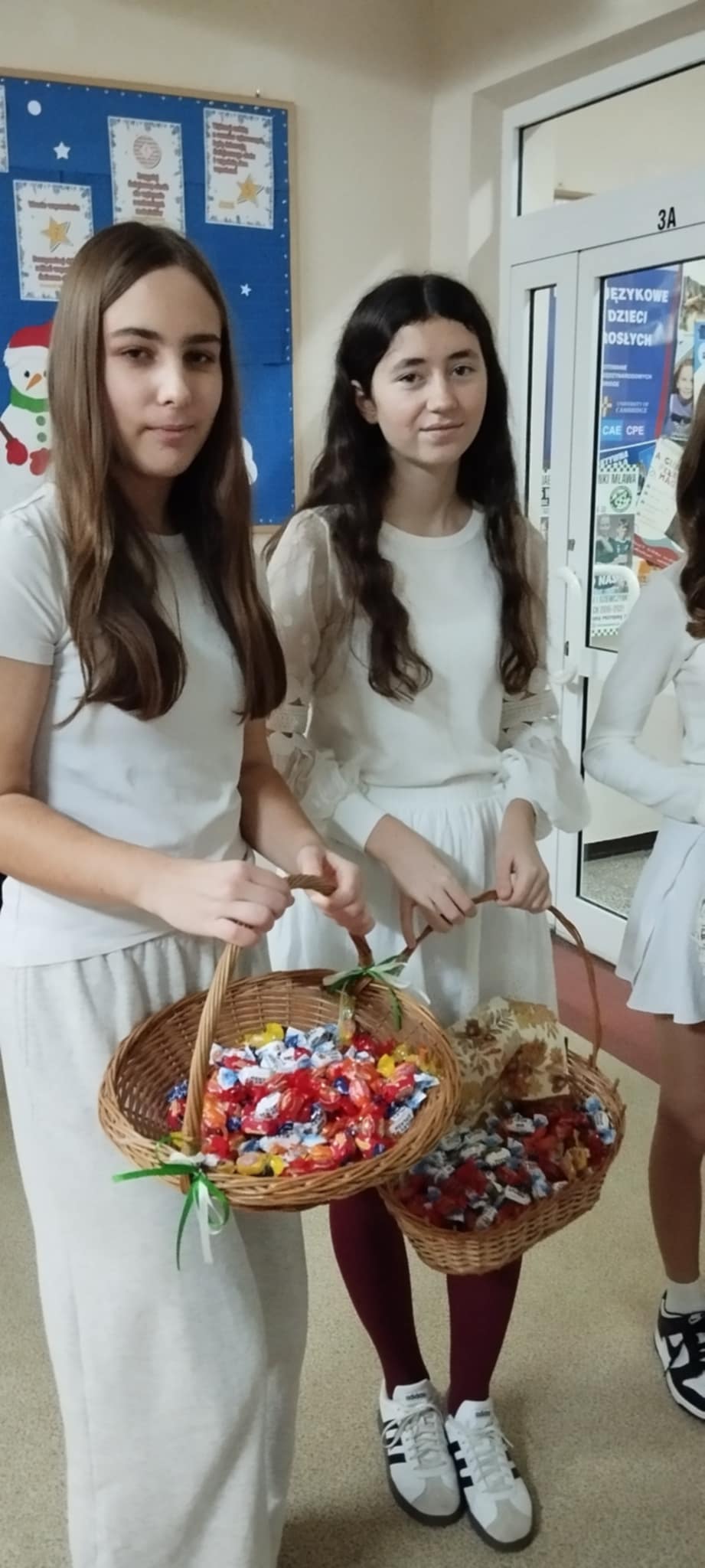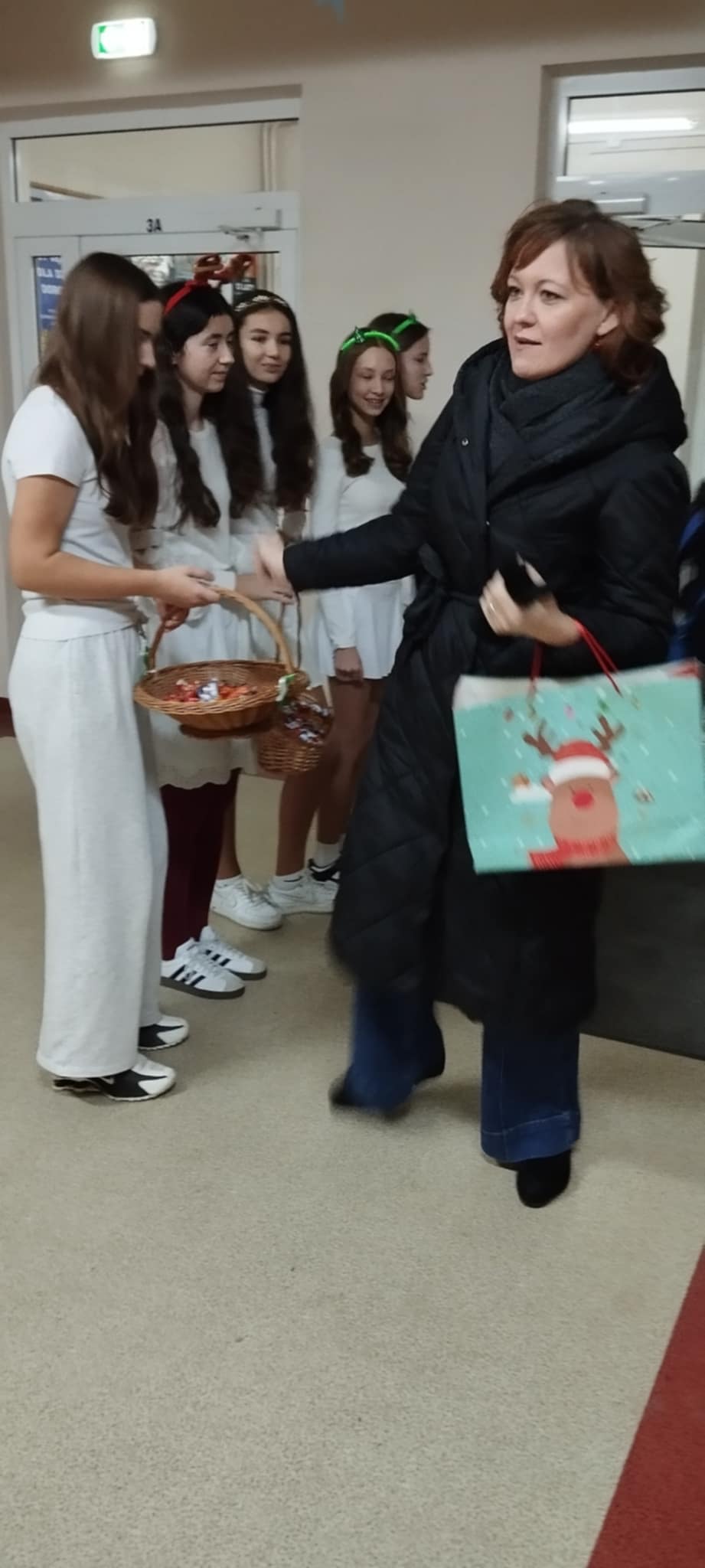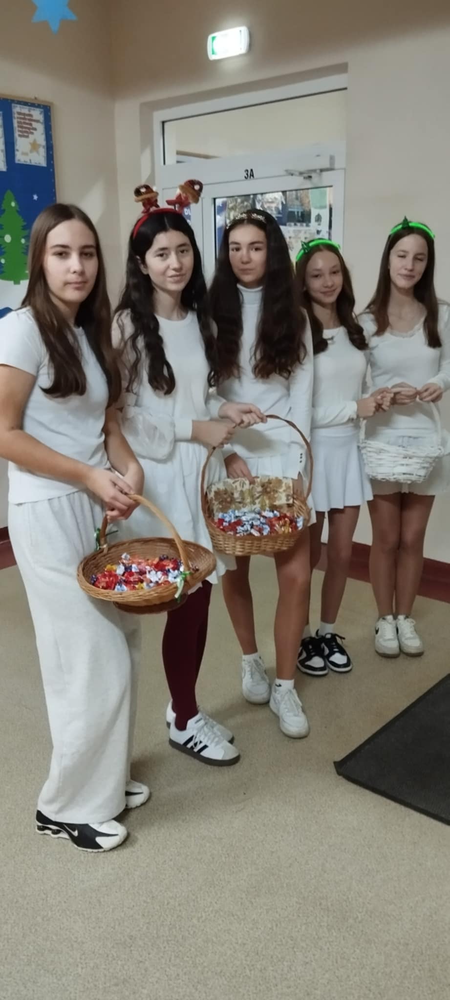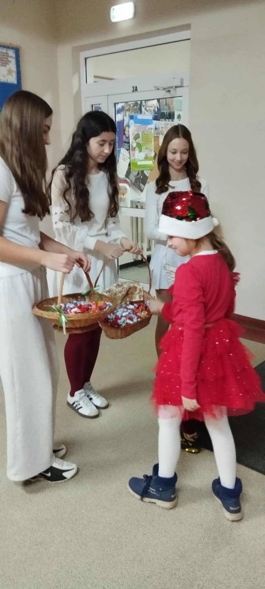 Już od progu dało się poczuć wyjątkową atmosferę! Przy drzwiach wejściowych na uczniów i nauczycieli czekały uśmiechnięte śnieżynki, które witały wszystkich miłym słowem oraz słodkim poczęstunkiem. Tak rozpoczęliśmy ten niezwykle radosny dzień!