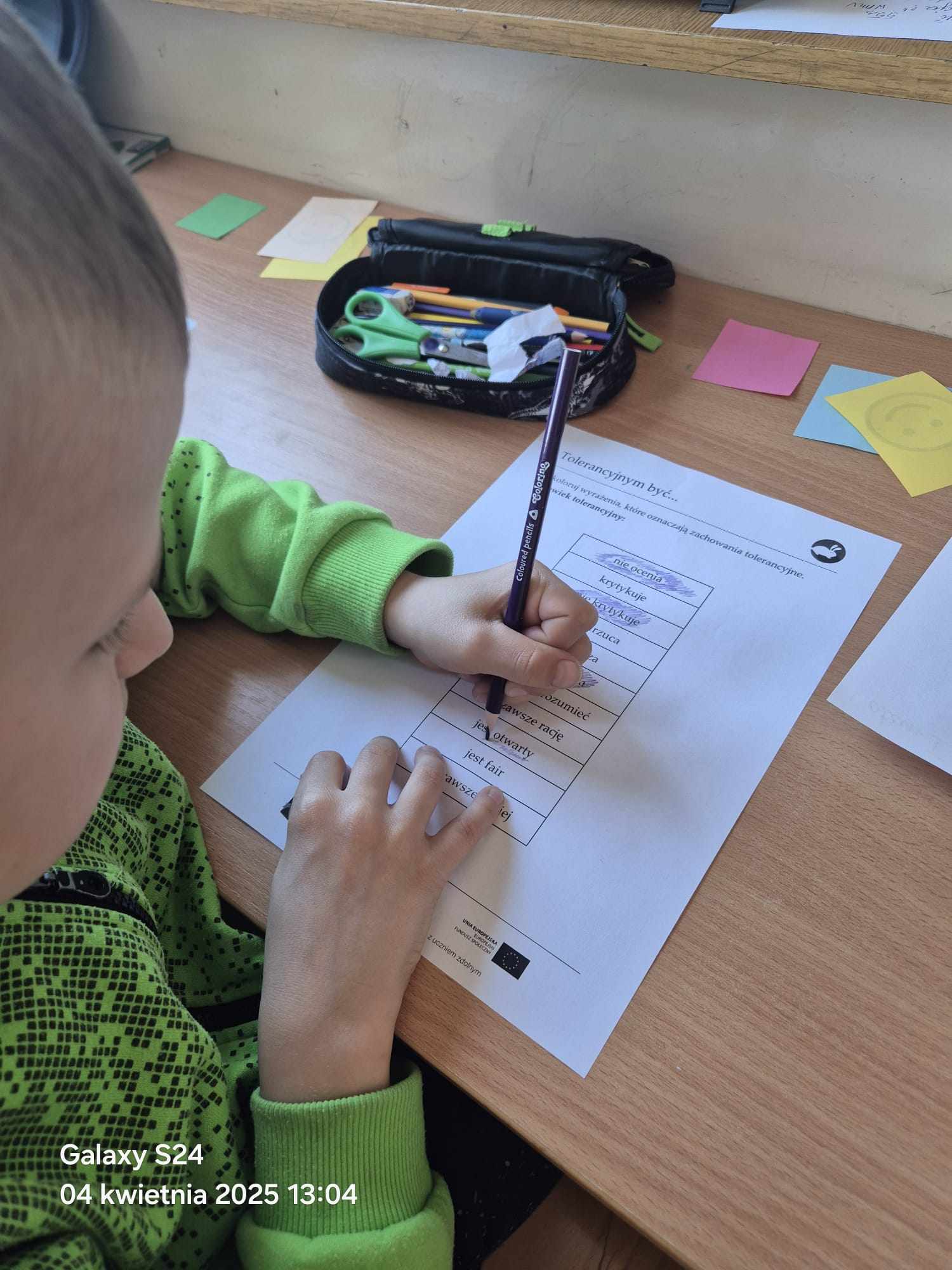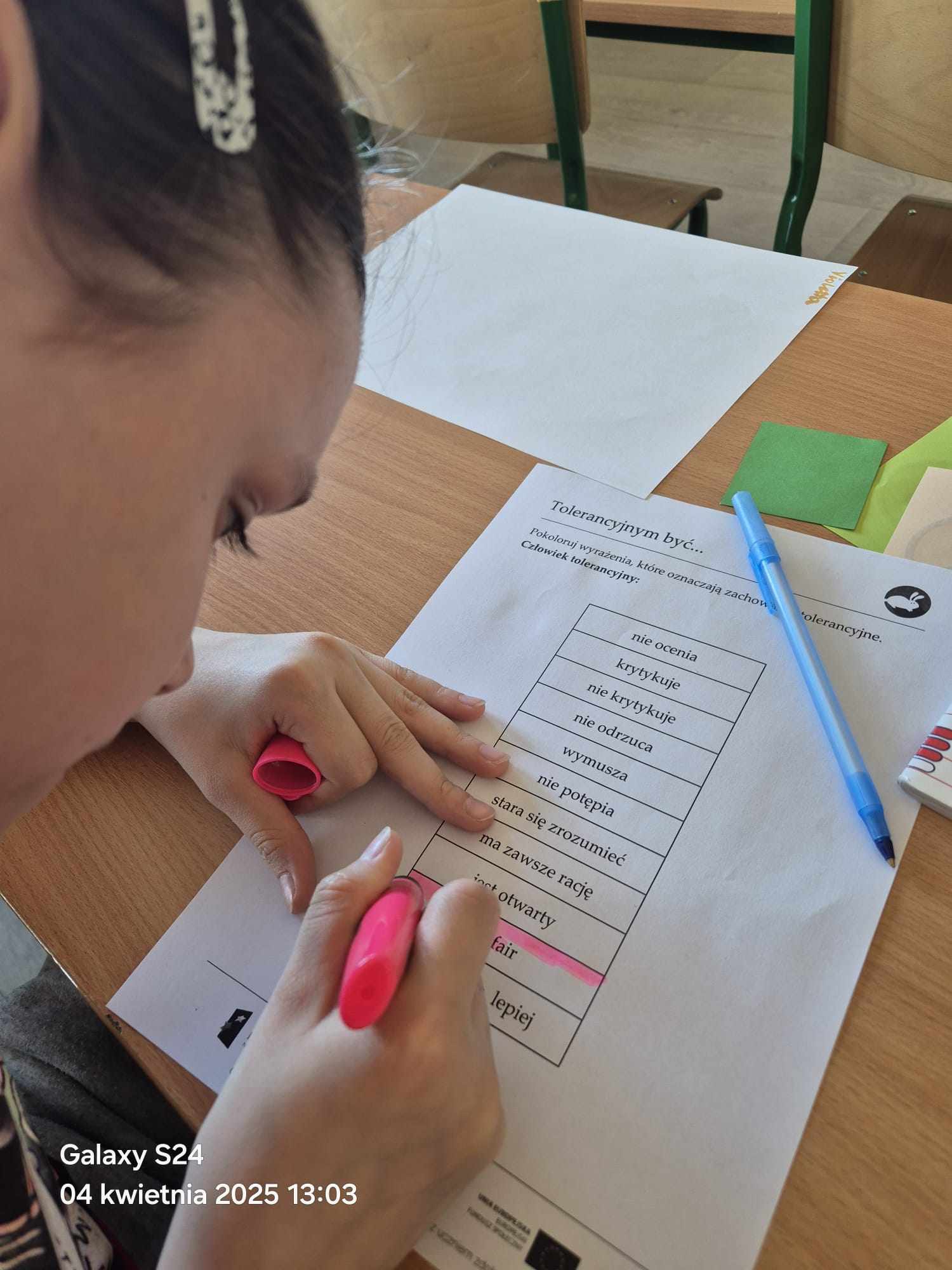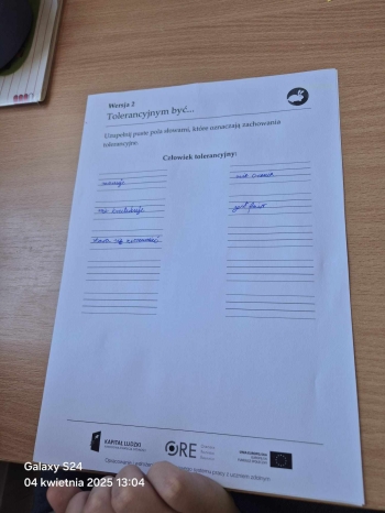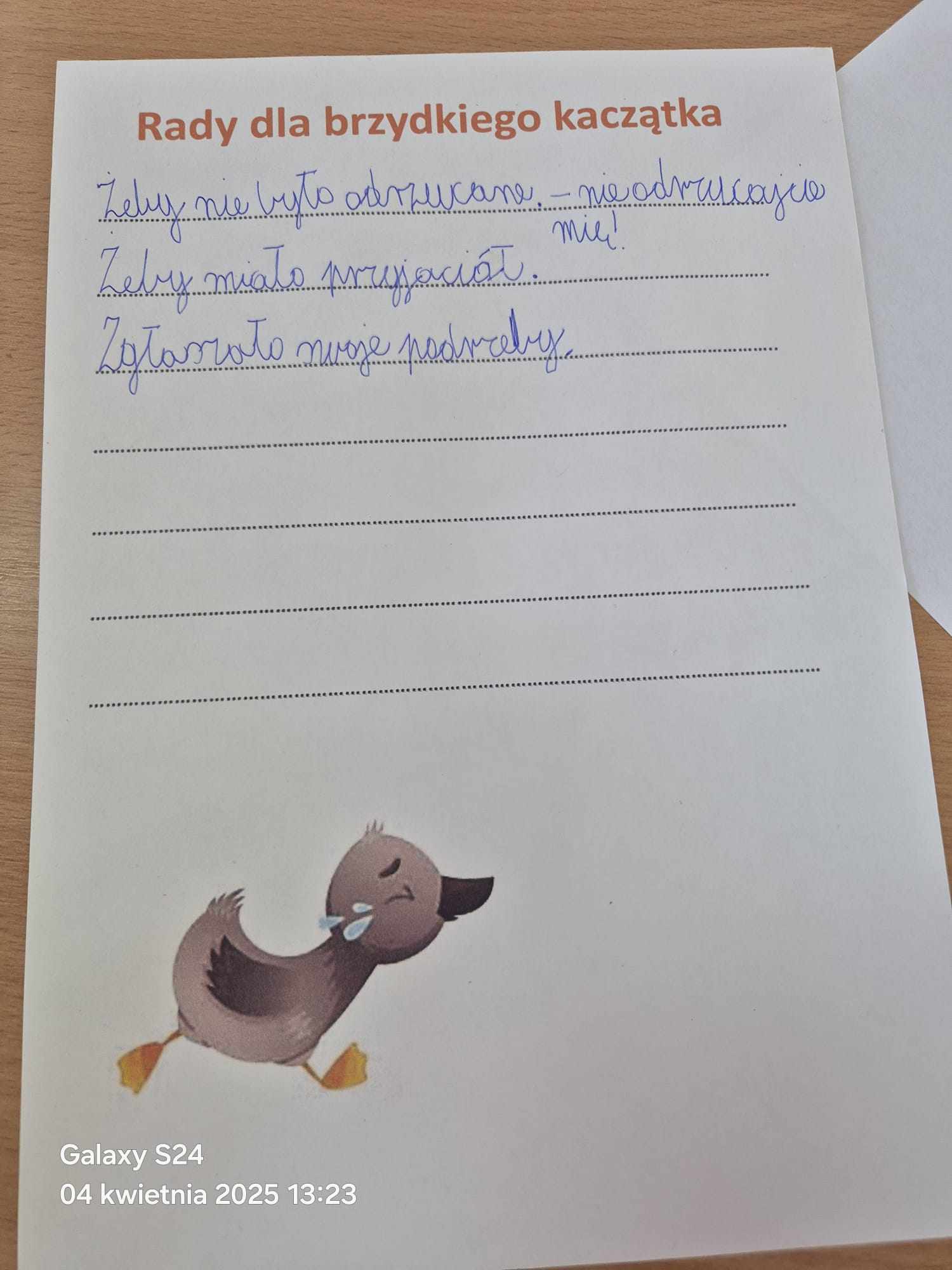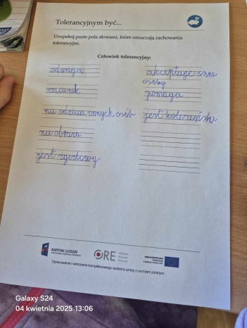 Tolerancja, akceptacja, poszanowanie drugiego człowieka to wartości, o których nie można zapominać. Uczniowie kl. III d aktywnie uczestniczyli w ciekawych i pouczających zajęciach poruszających to zagadnienie. W czasie lekcji wykorzystując m.in. metodę "burzy mózgów" i "łańcucha skojarzeń" określali cechy człowieka tolerancyjnego i starali się to odmienić do losów brzydkiego kaczątka. Zajęcia uświadomiły uczniom jak ważny jest szacunek do drugiego człowieka.