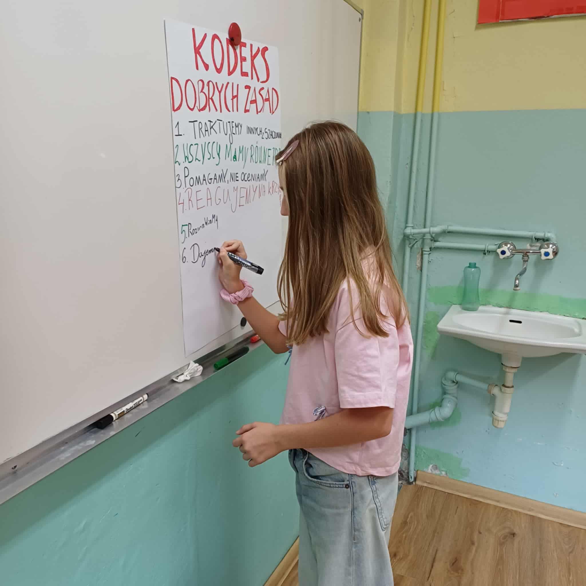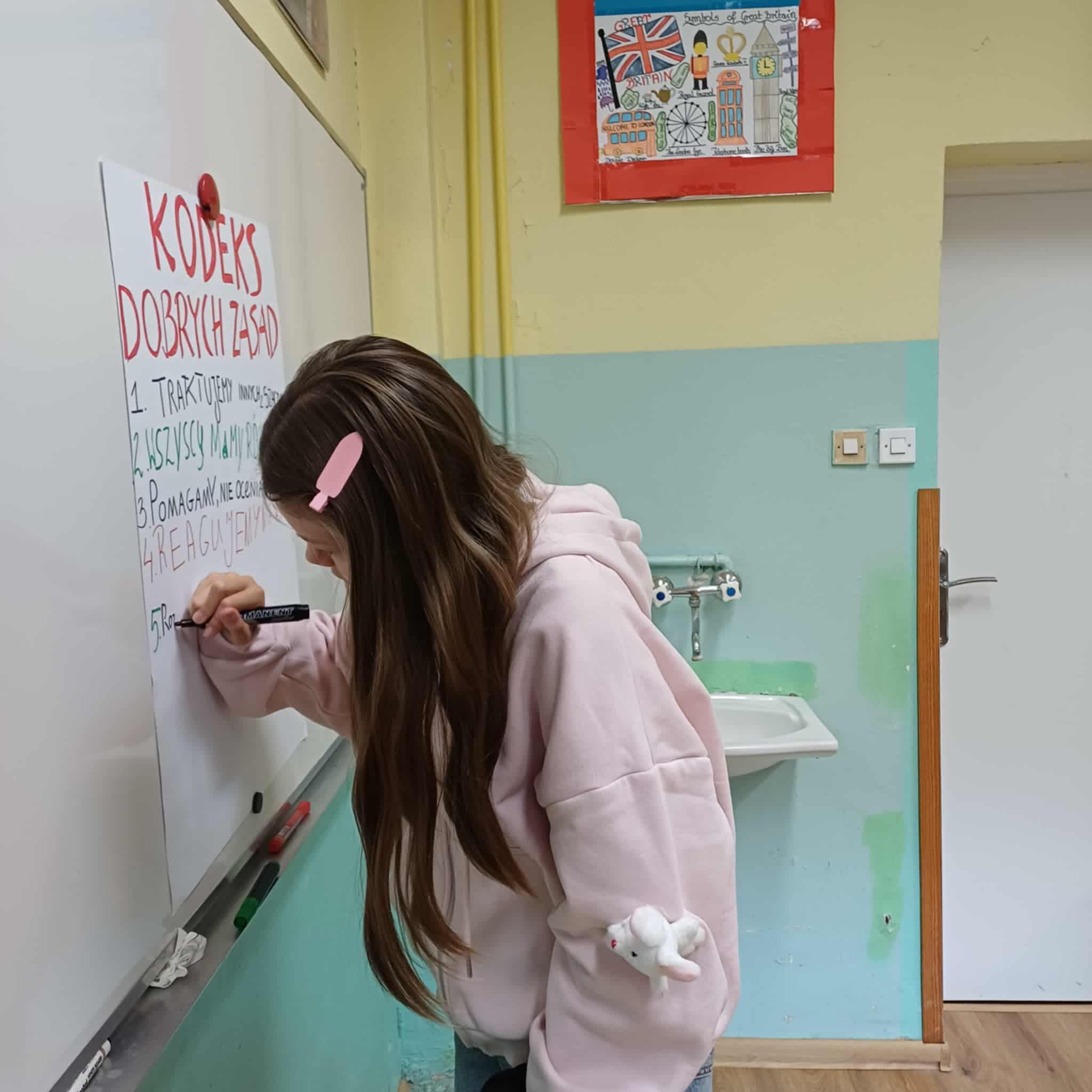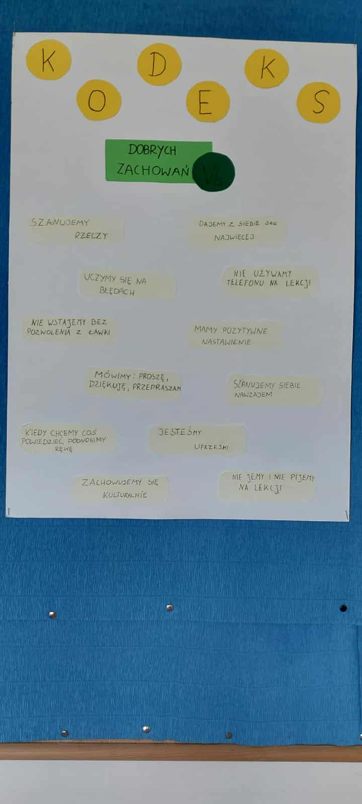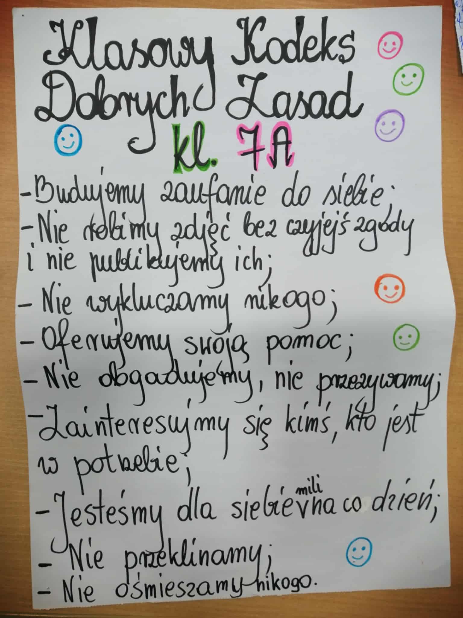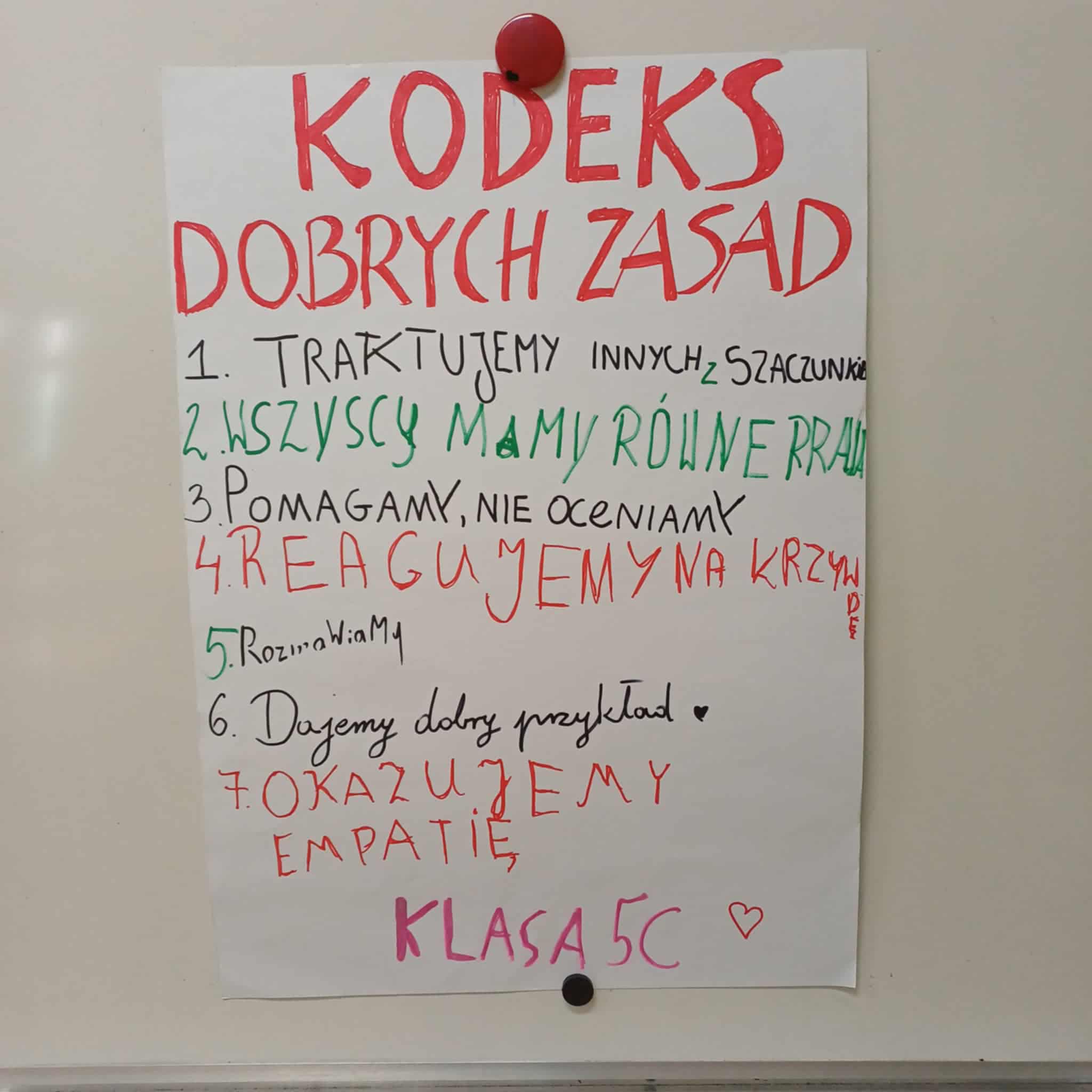 Klasy wspólnie tworzyÅ‚y kodeksy przeciw przemocy, w których zawarÅ‚y swoje pomysÅ‚y na budowanie atmosfery wzajemnego wsparcia, życzliwoÅ›ci i wspóÅ‚pracy.