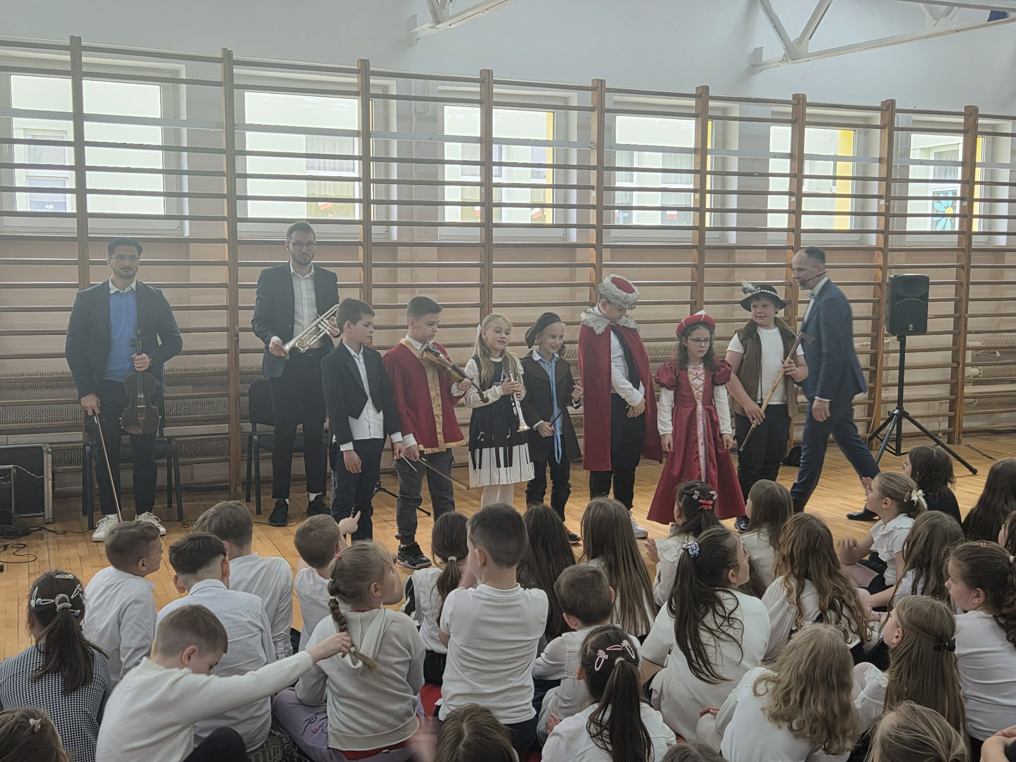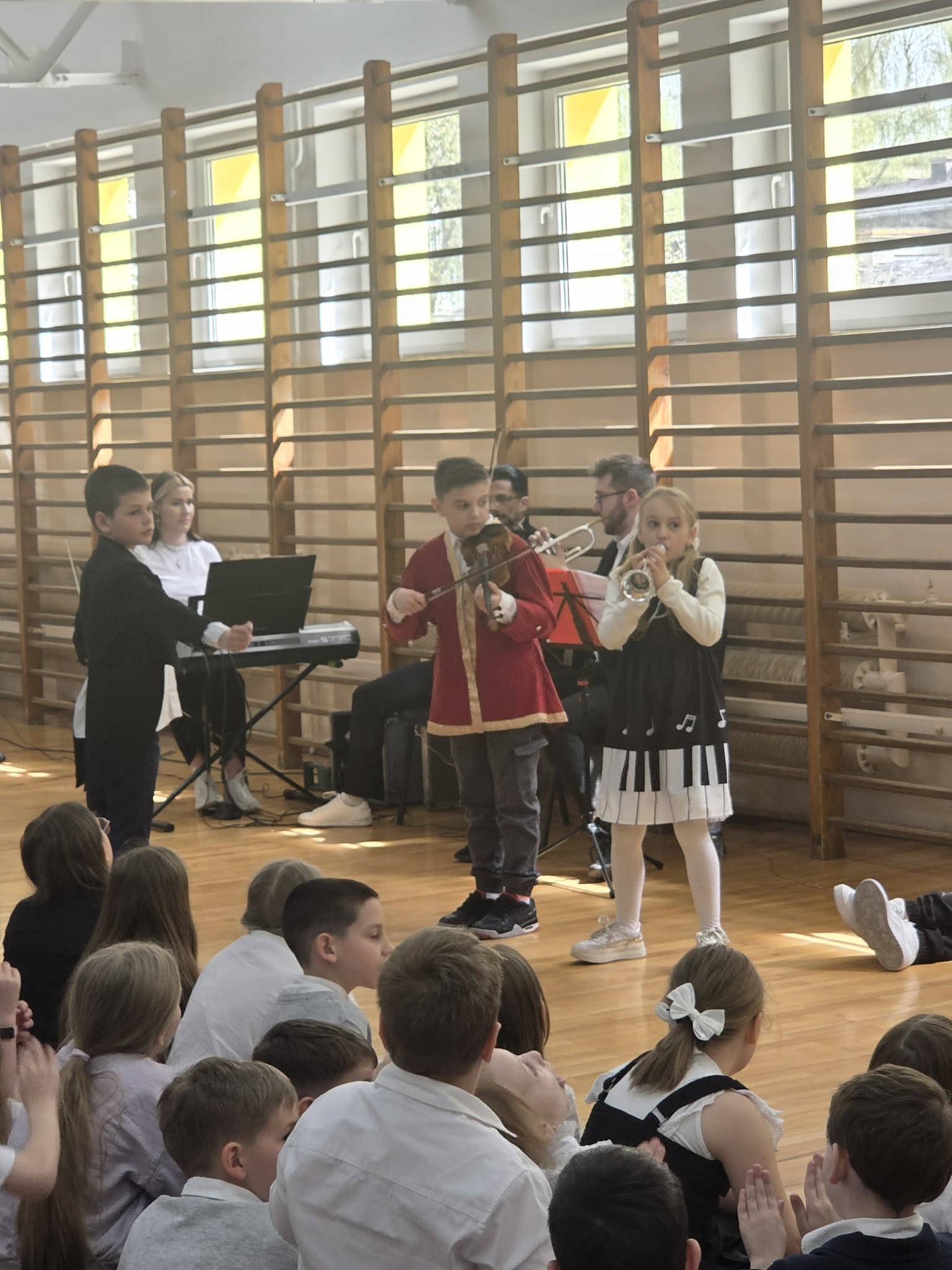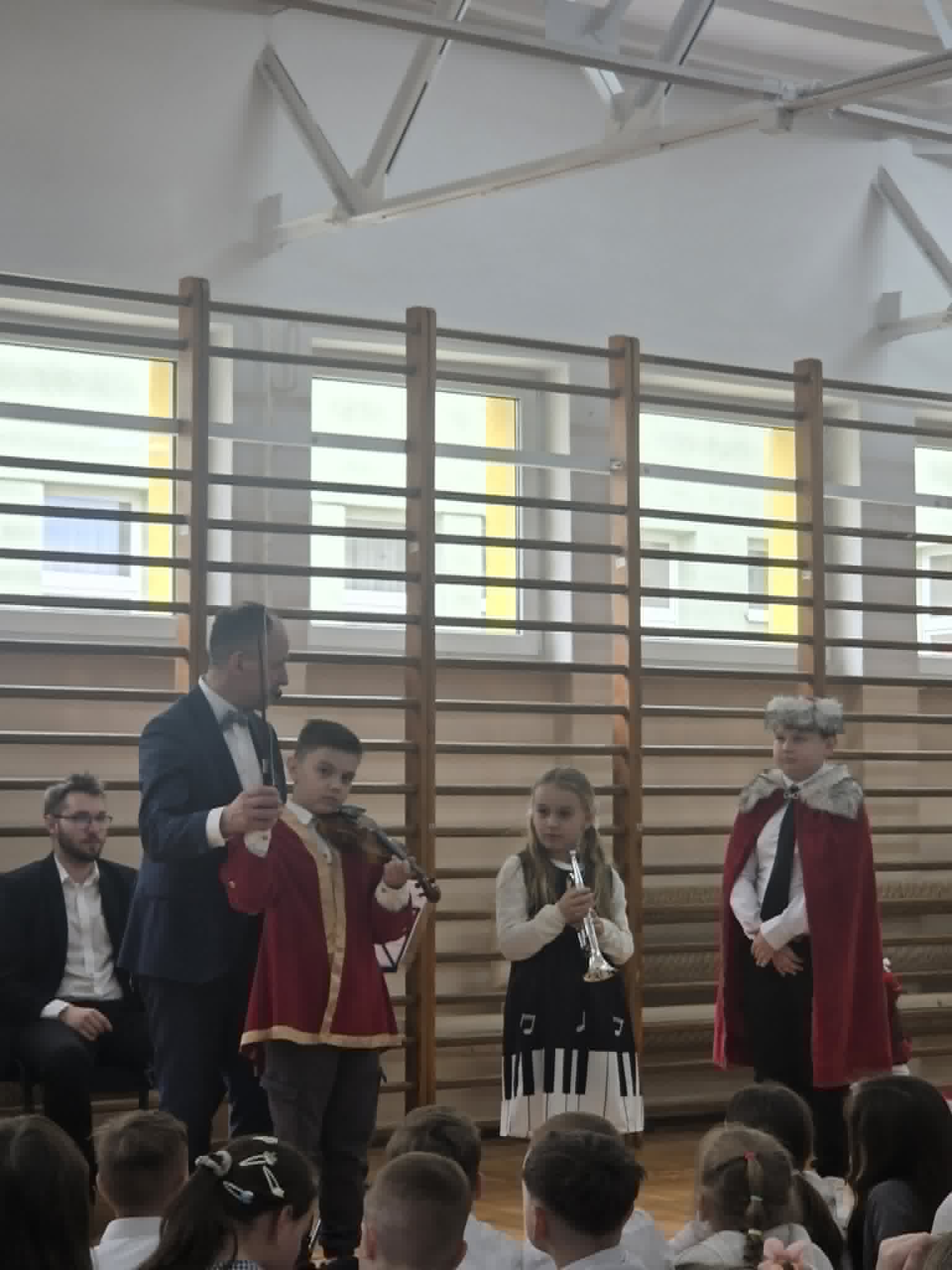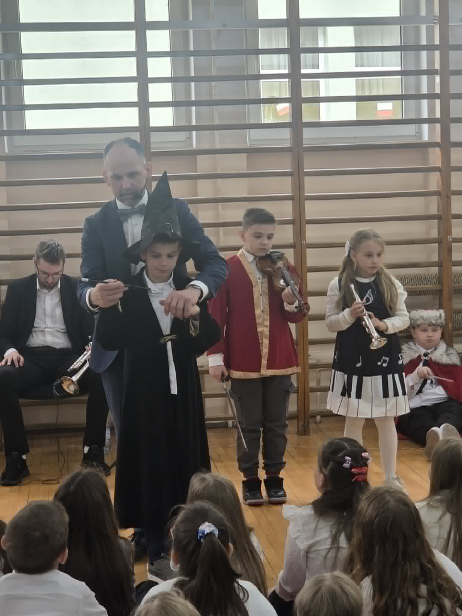 Uczniowie klas 1–3 wzięli udział w wyjątkowej audycji muzycznej pt. „Muzyczny czarodziej", która odbyła się w naszej szkole. Tym razem to artyści przyjechali do dzieci, zamieniając szkolną salę gimnastyczną w prawdziwą filharmonię.