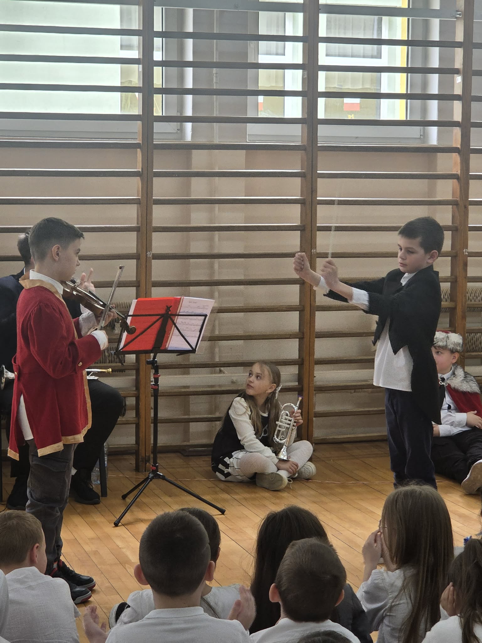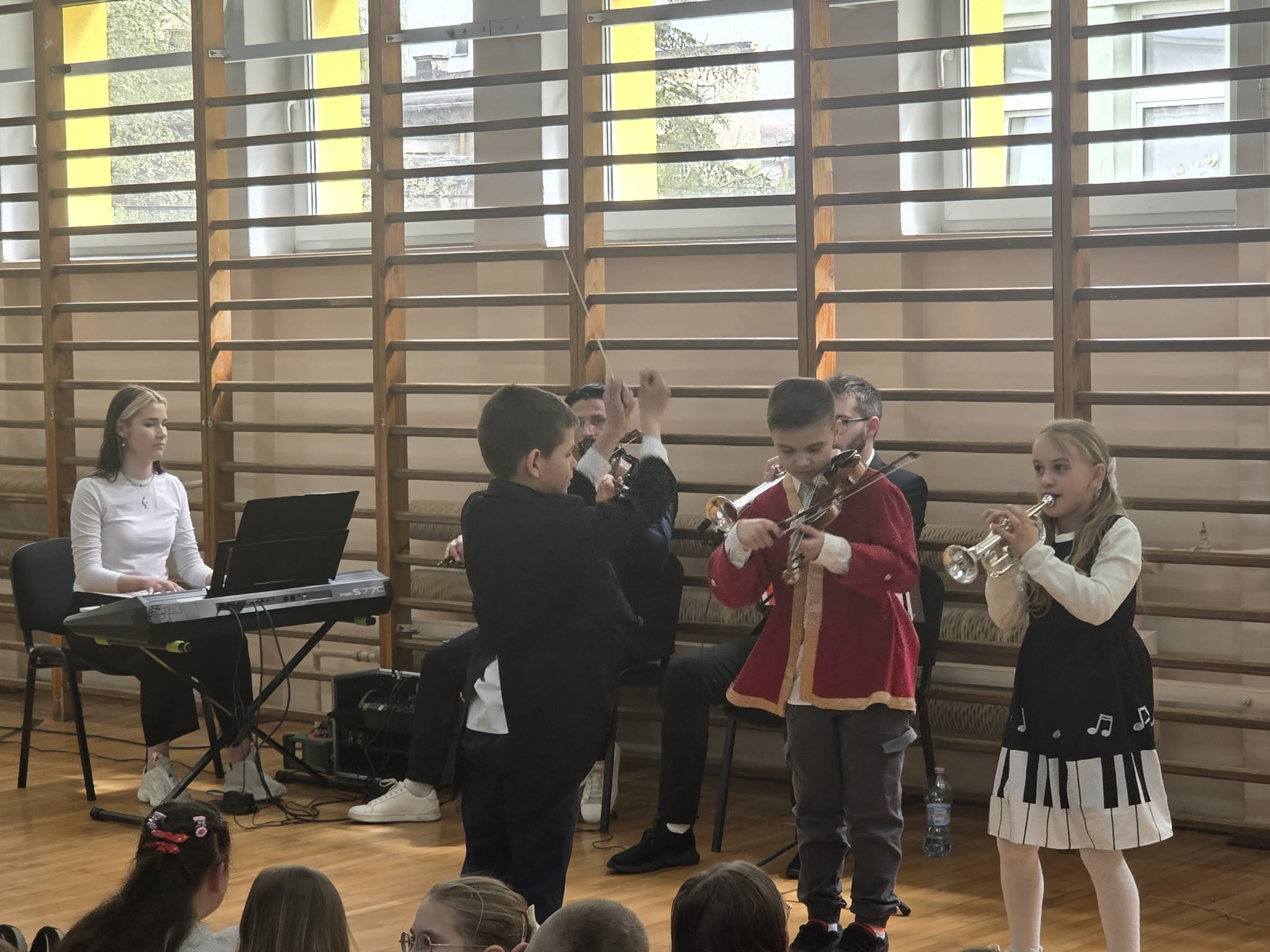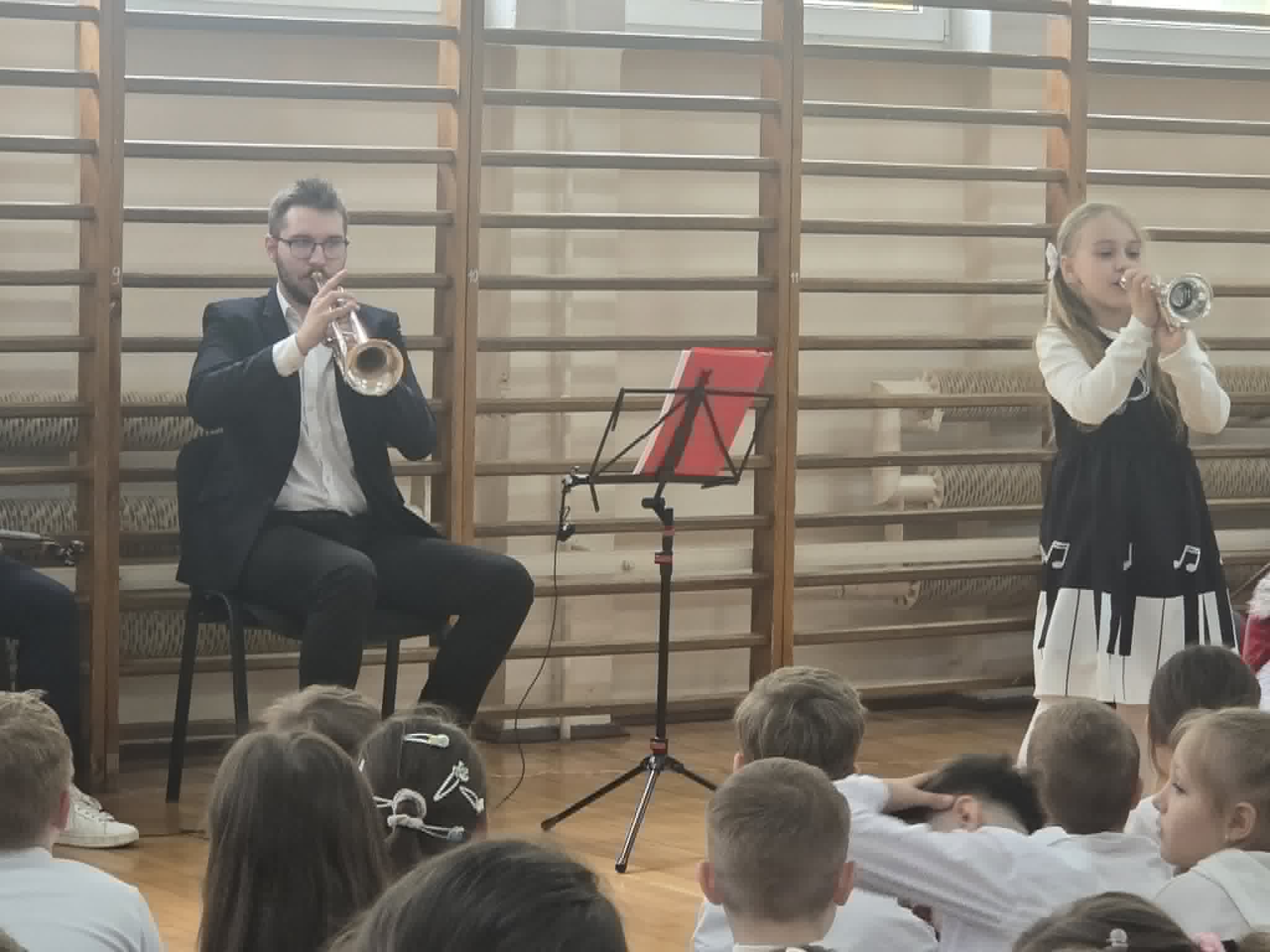 Podczas spotkania uczniowie mieli okazję poznać bliżej różne instrumenty muzyczne, m.in. trąbkę oraz skrzypce. Dowiedzieli się również, kim jest dyrygent i na czym polega jego rola, a także czym jest duet. Artyści w ciekawy i przystępny sposób wprowadzili dzieci w świat muzyki, łącząc naukę z zabawą.