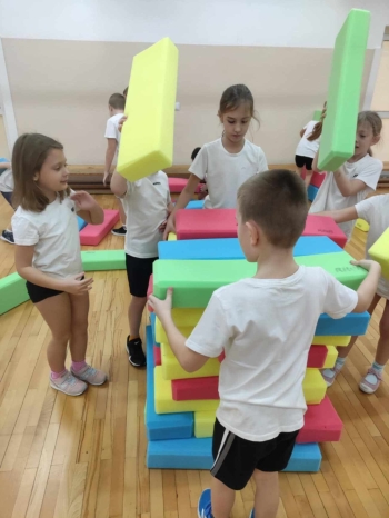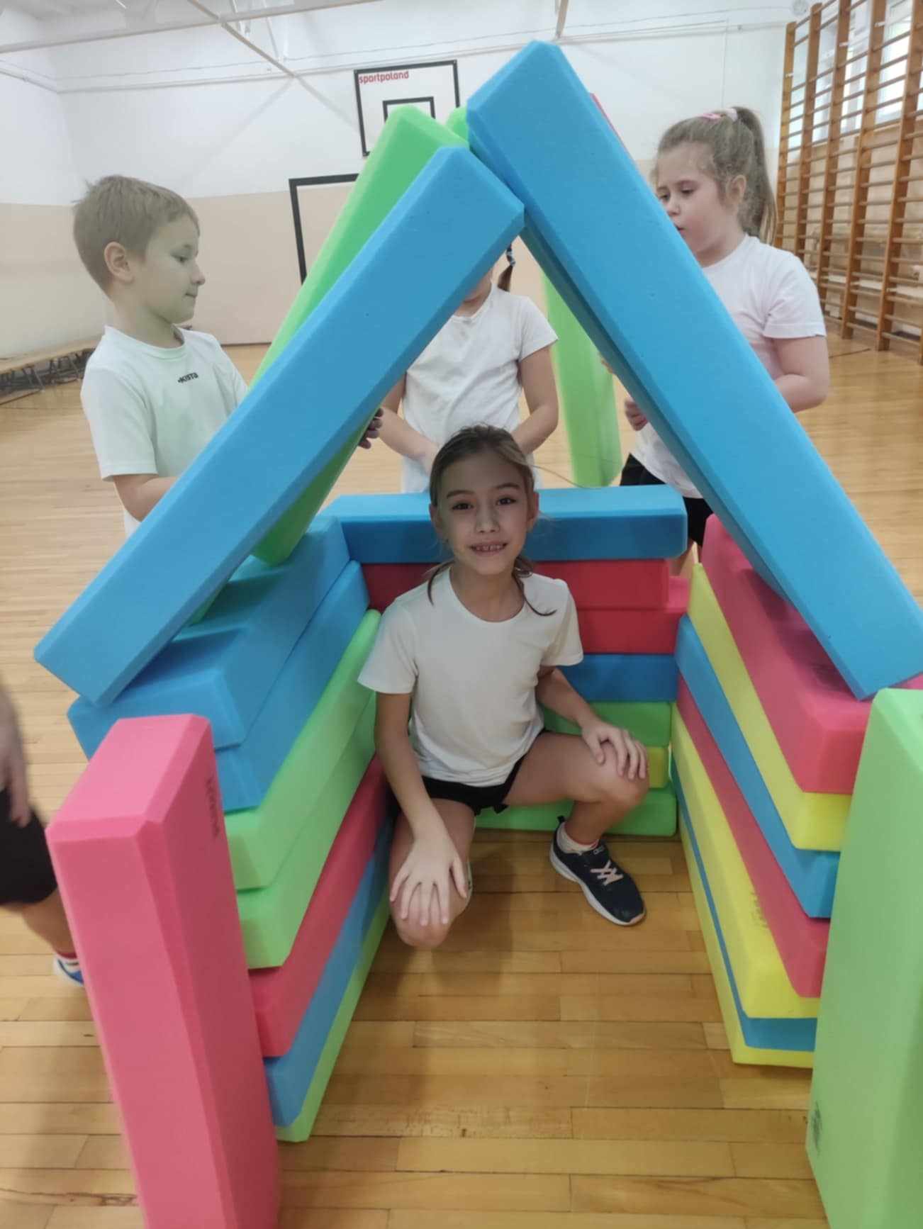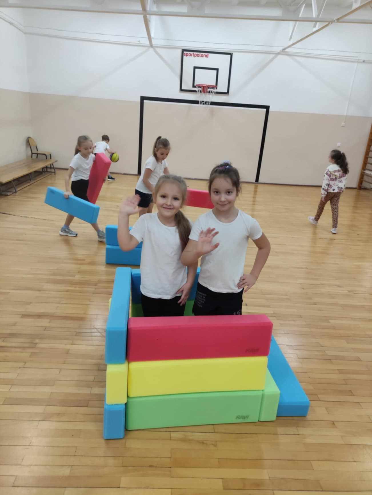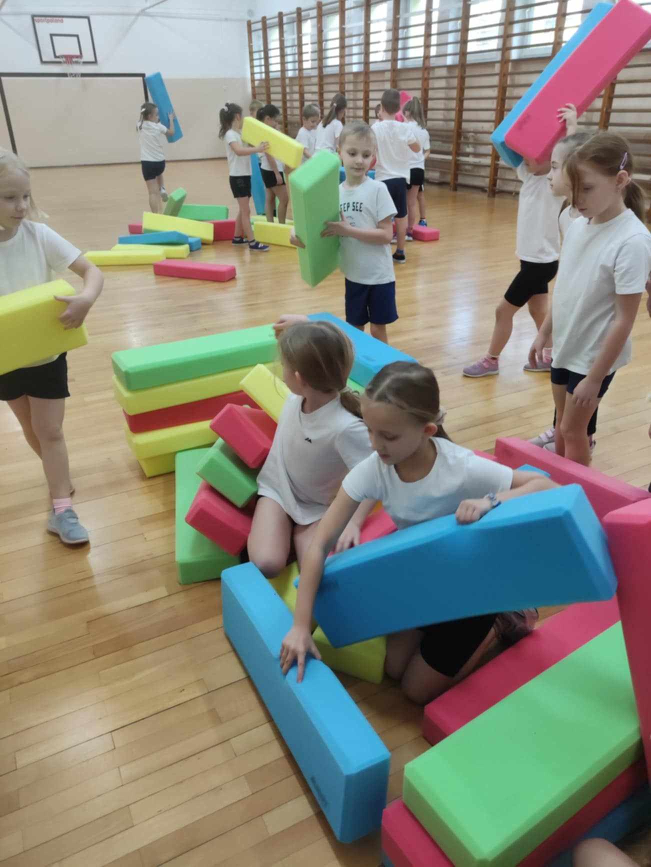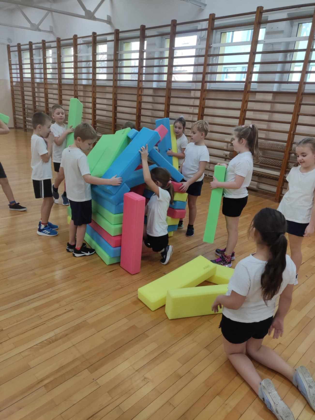 Planując zabawy sportowe warto zachęcić dzieci do działań kreatywnych i ruchu poprzez zabawę. Uczniowie klasy I a na lekcji wychowania fizycznego wykorzystali do zabawy klocki konstrukcyjne, z których tworzyli ciekawe budowle. Pierwszoklasiści zaskakiwali pomysłowością . Poprzez zabawę klockami uczniowie stymulowali zręczność, umiejętności motoryczne oraz kreatywność i myślenie przestrzenne. Zajęcia z klockami okazały się dla dzieci doskonałą zabawą.