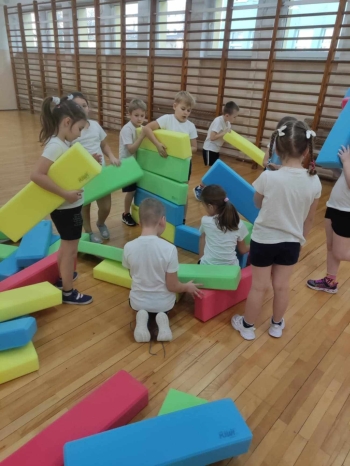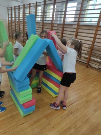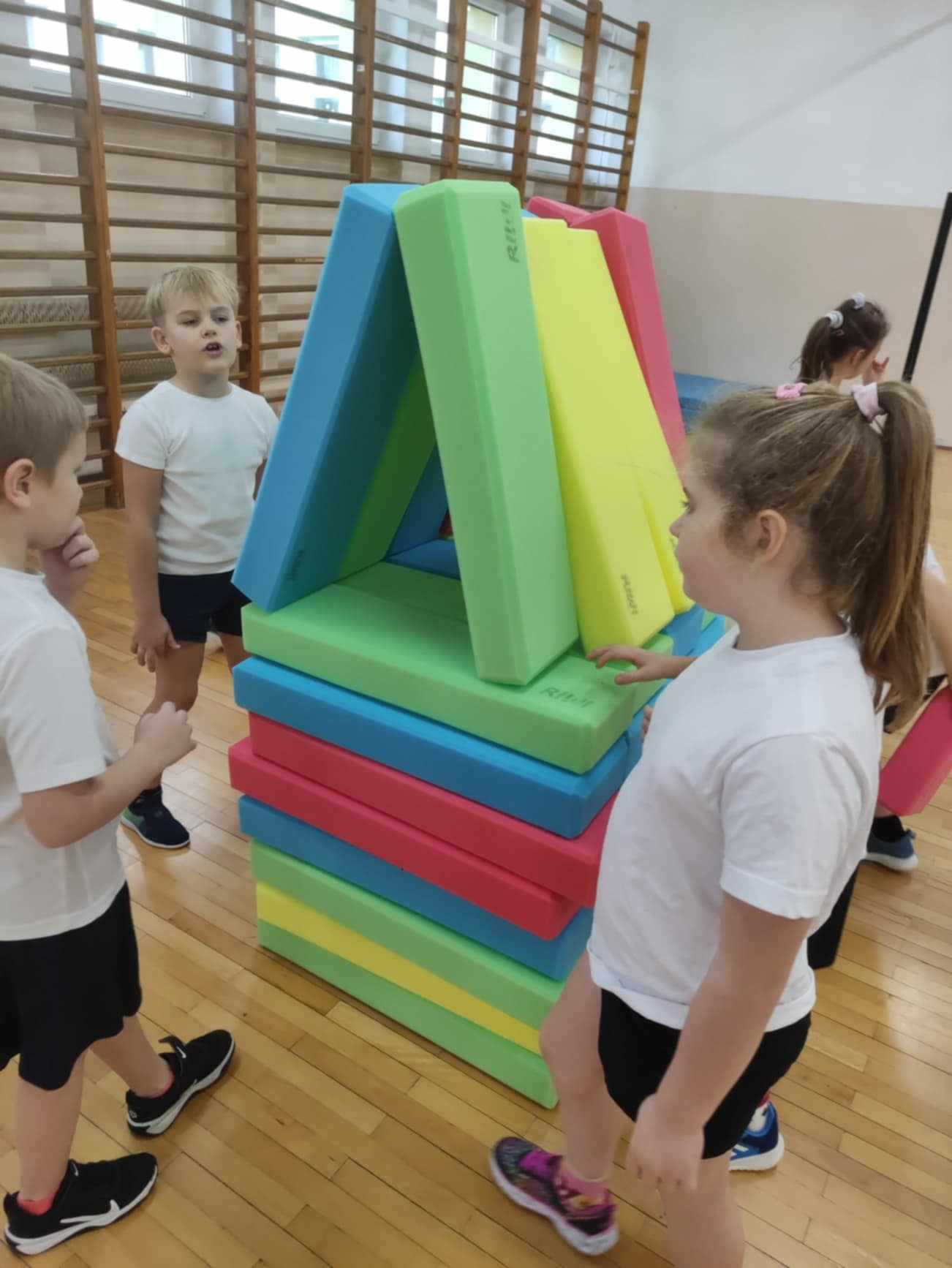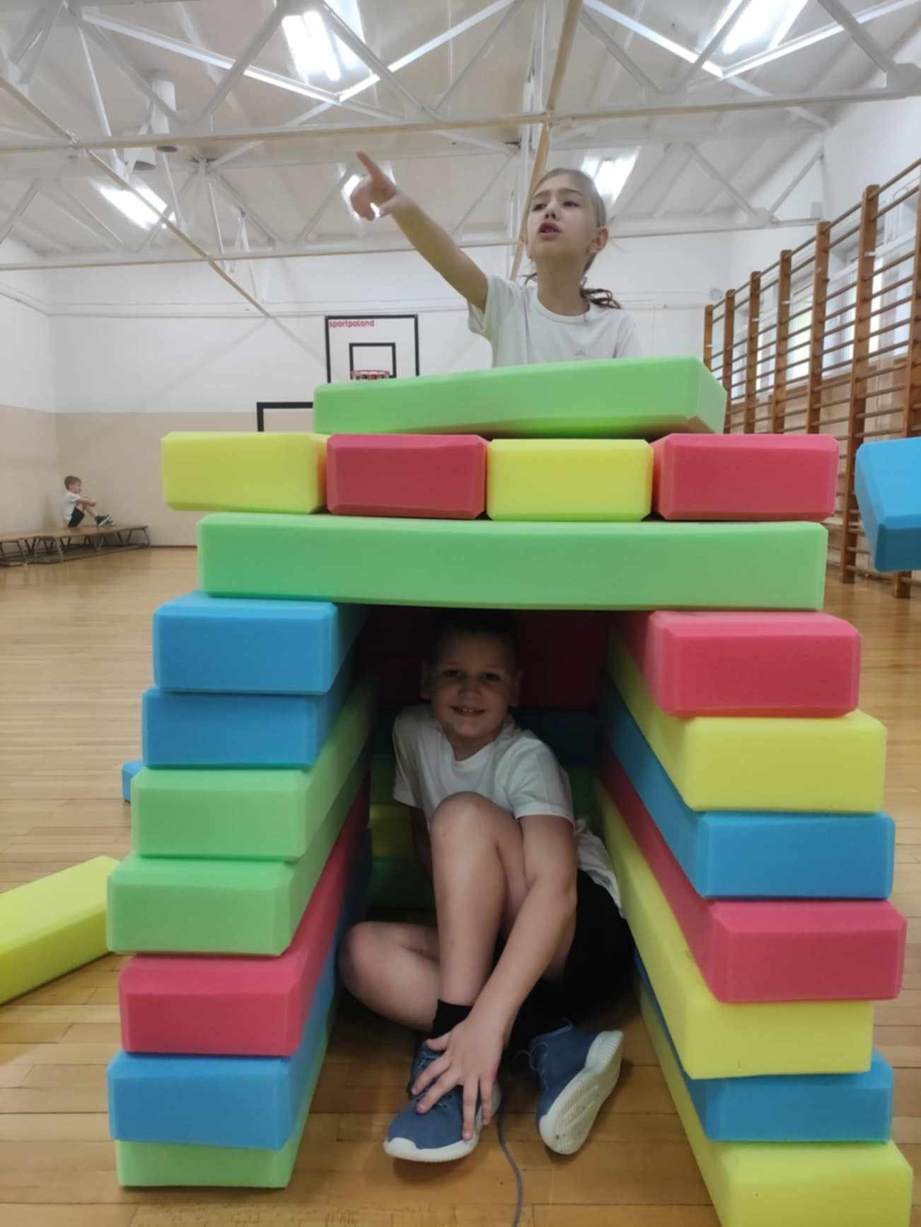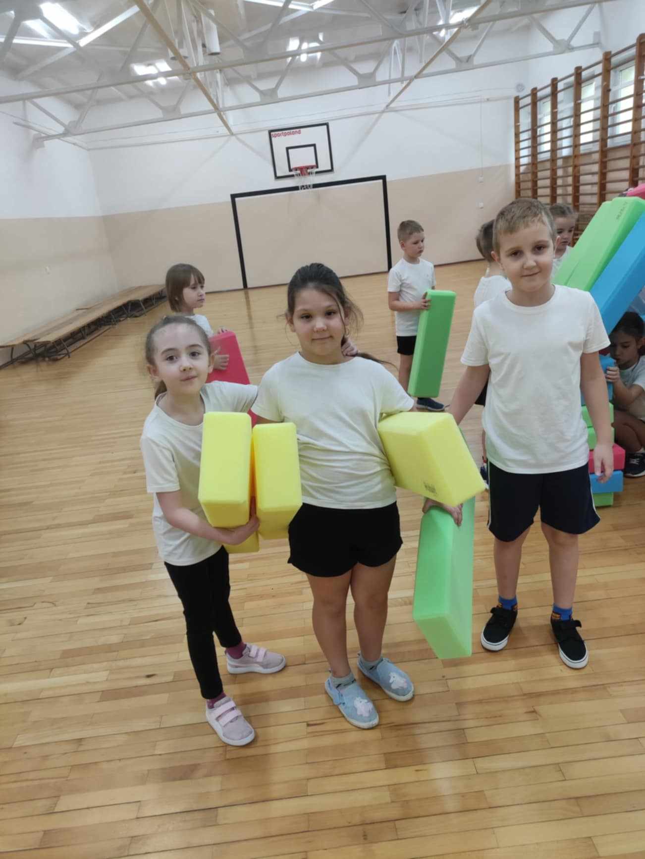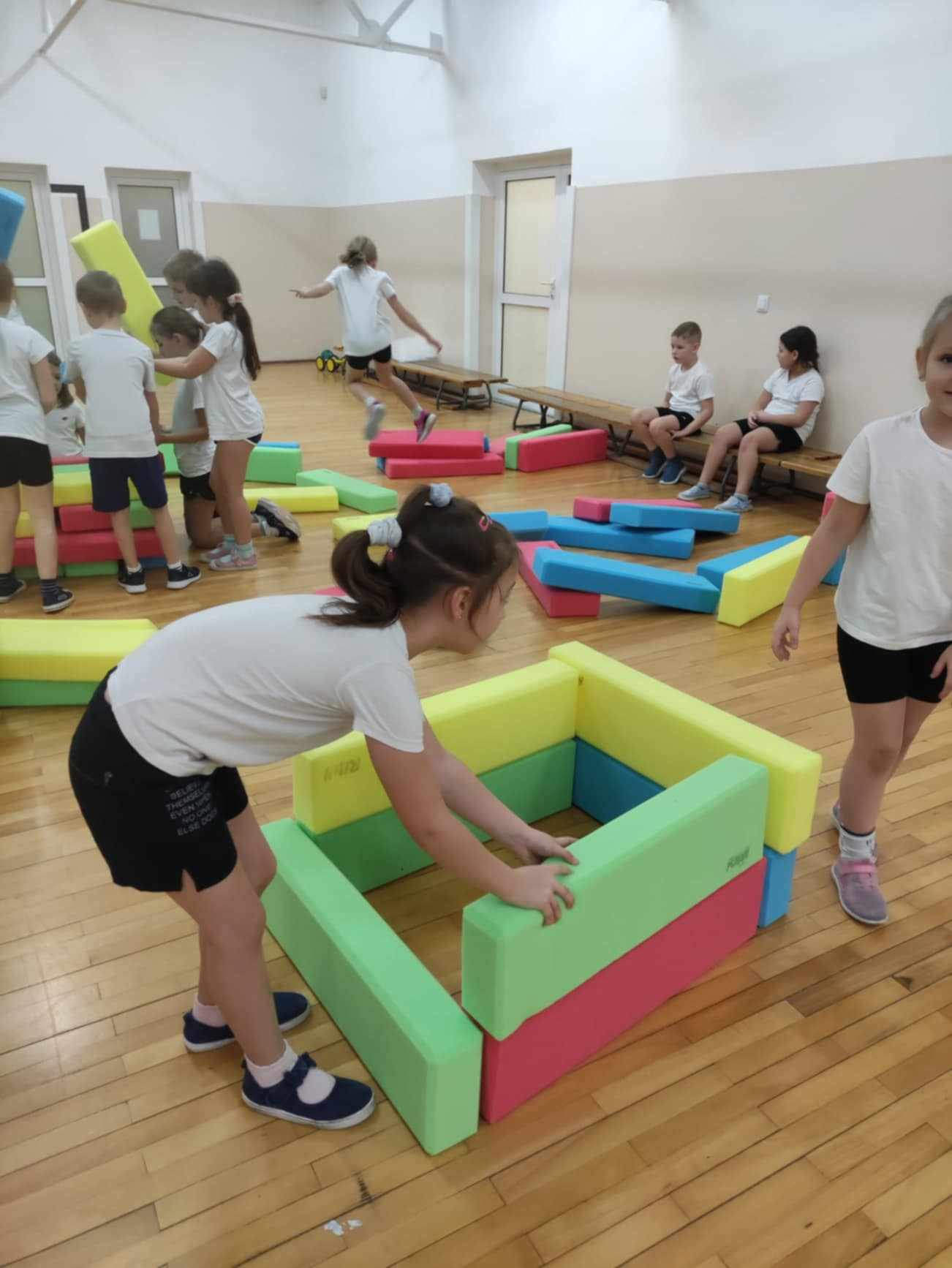 Planując zabawy sportowe warto zachęcić dzieci do działań kreatywnych i ruchu poprzez zabawę. Uczniowie klasy I a na lekcji wychowania fizycznego wykorzystali do zabawy klocki konstrukcyjne, z których tworzyli ciekawe budowle. Pierwszoklasiści zaskakiwali pomysłowością . Poprzez zabawę klockami uczniowie stymulowali zręczność, umiejętności motoryczne oraz kreatywność i myślenie przestrzenne. Zajęcia z klockami okazały się dla dzieci doskonałą zabawą.