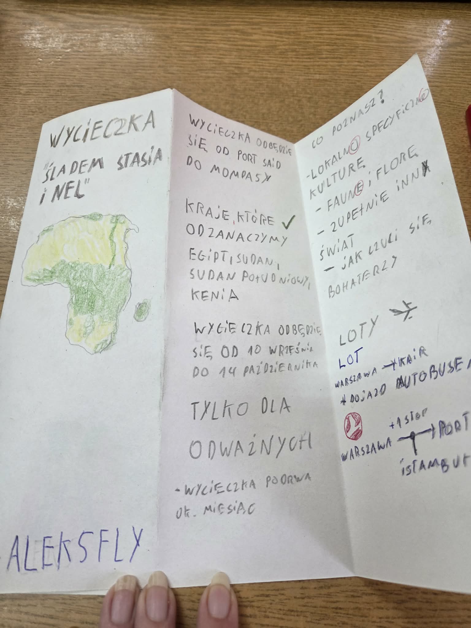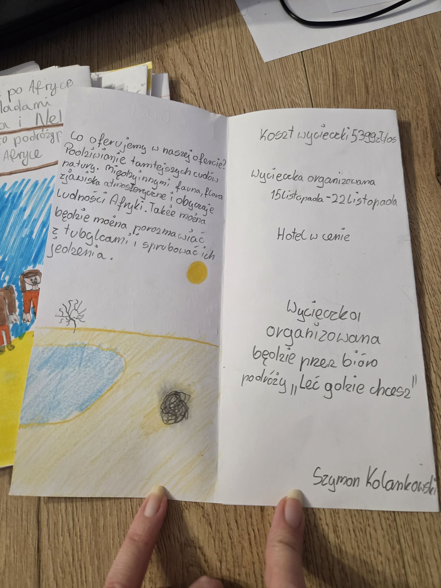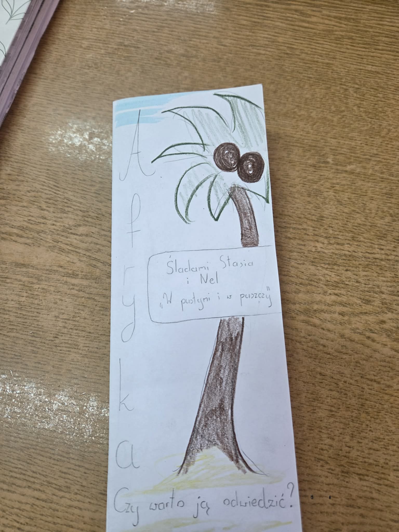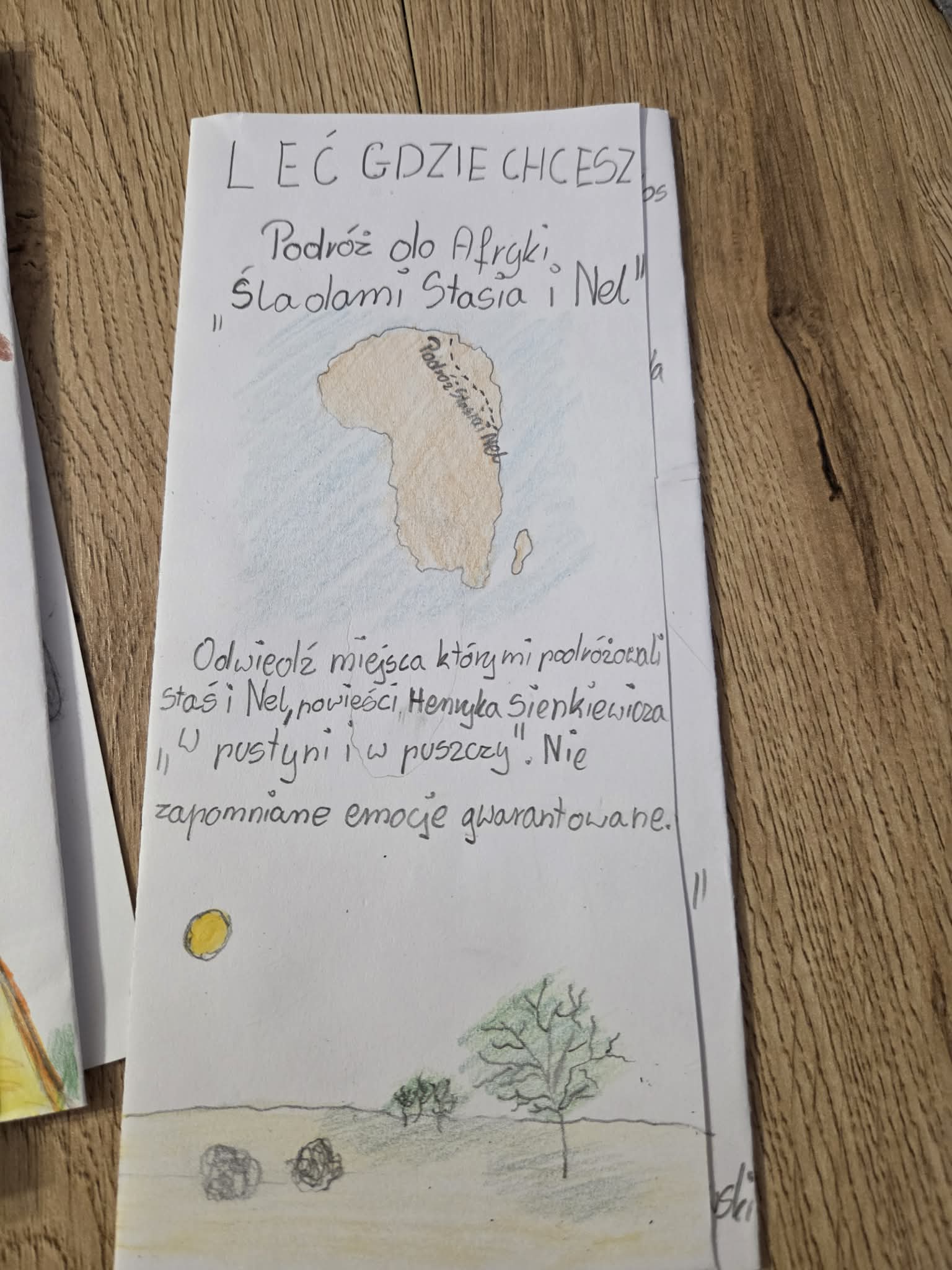 Na podsumowanie omawiania książki uczniowie przygotowali foldery turystyczne reklamujące podróż do Afryki śladami Stasia i Nel. Podczas pracy musieli wykazać się nie tylko znajomością treści lektury, ale także wyobraźnią, pomysłowością i umiejętnością selekcji informacji.