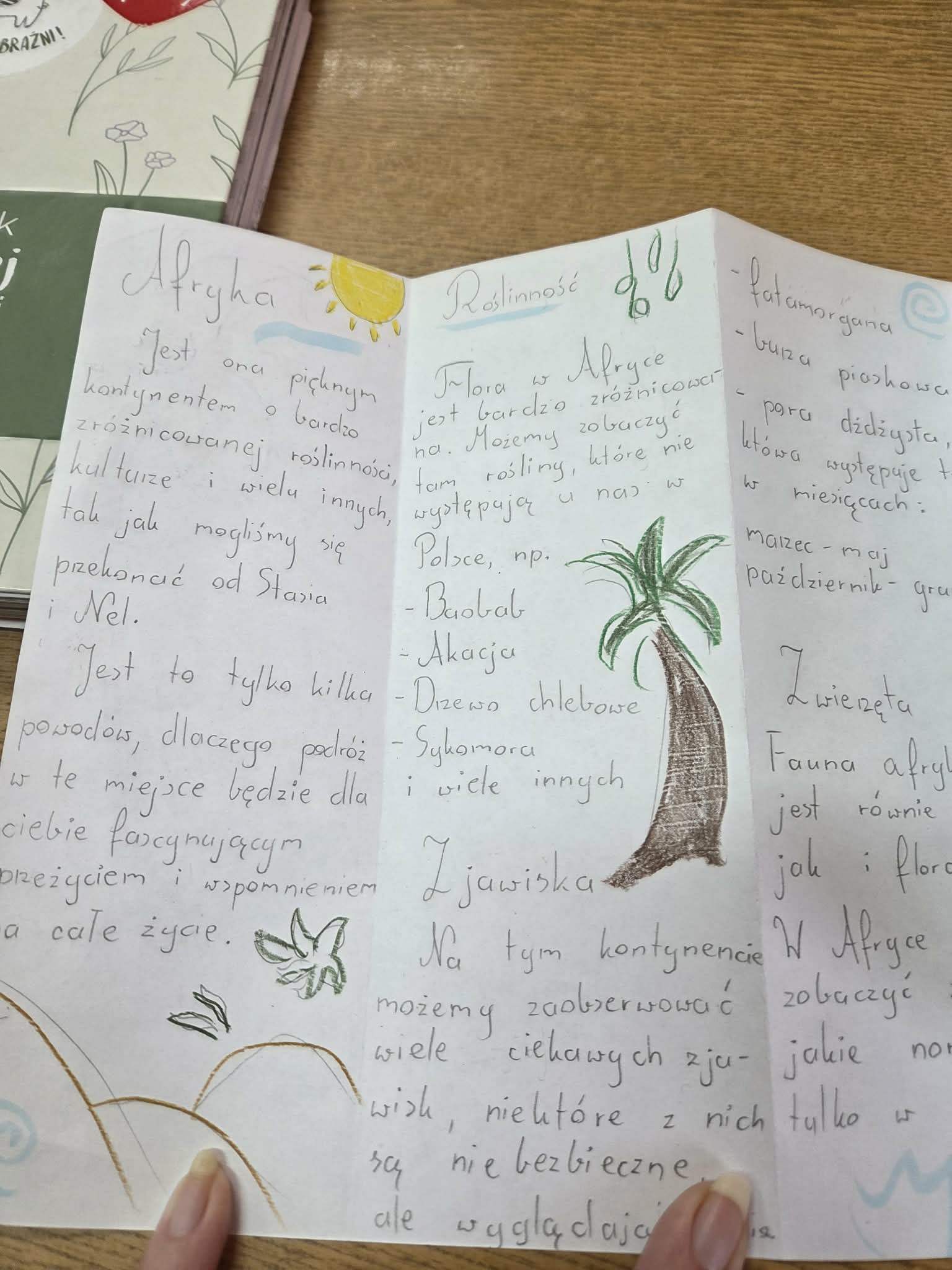 Szczególną uwagę uczniowie poświęcili szacie graficznej swoich prac. Foldery były starannie zaprojektowane, kolorowe i estetyczne, dzięki czemu mogłyby z powodzeniem zachęcić turystów do wyprawy na afrykański kontynent.
