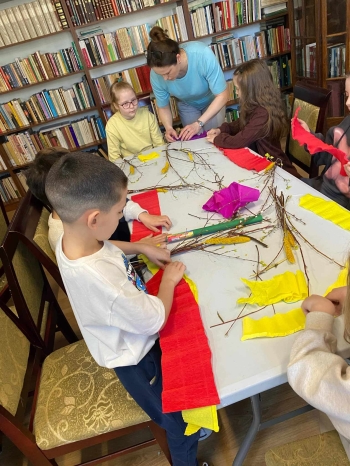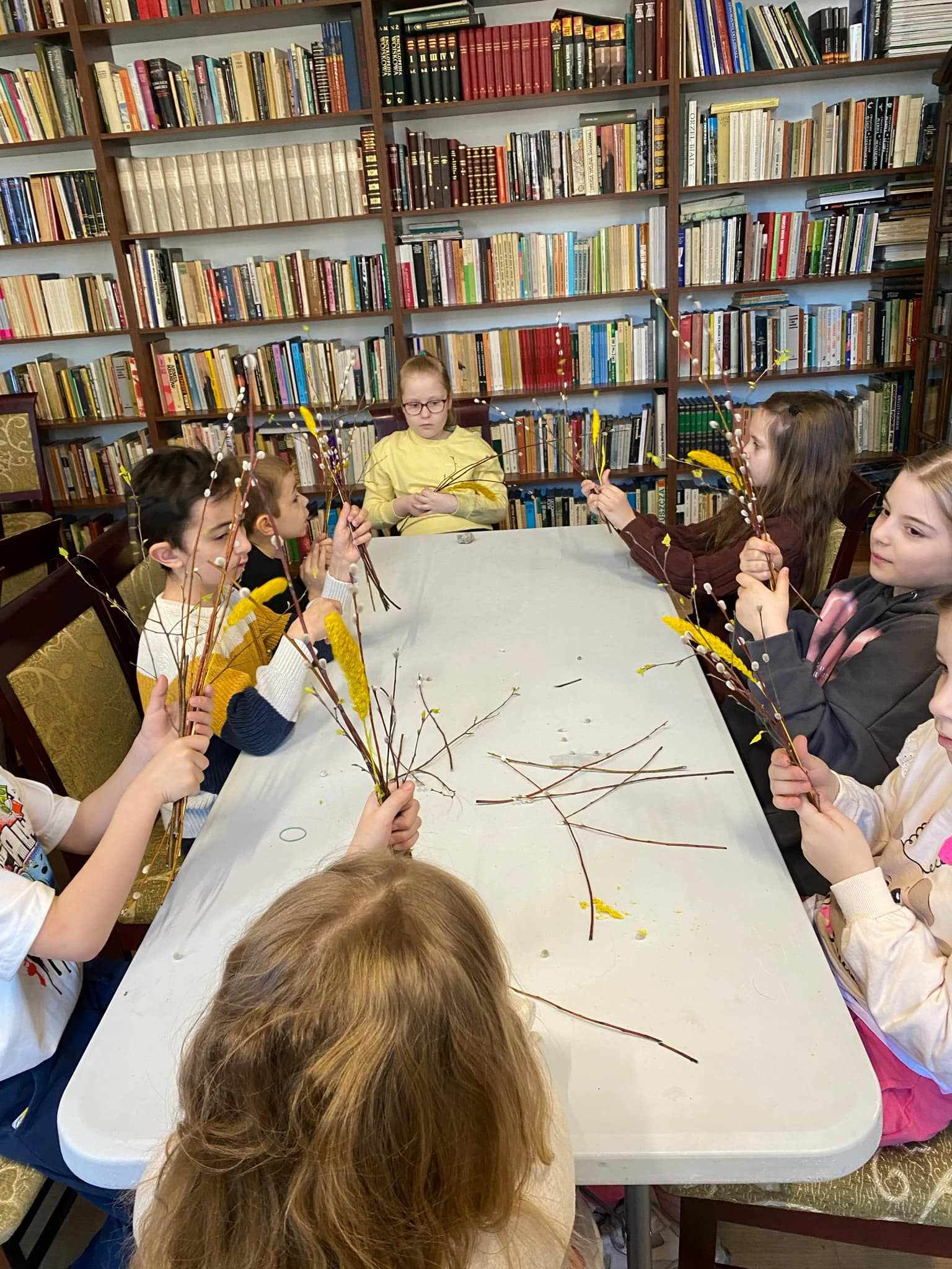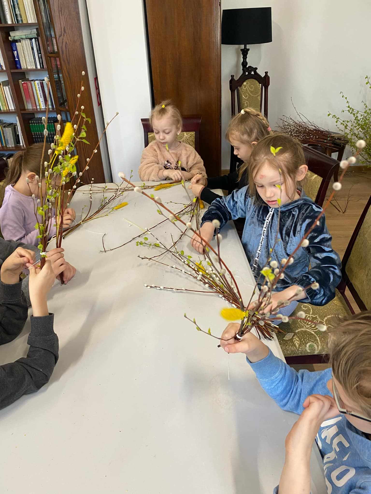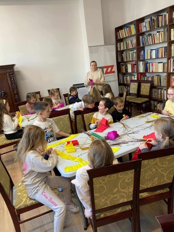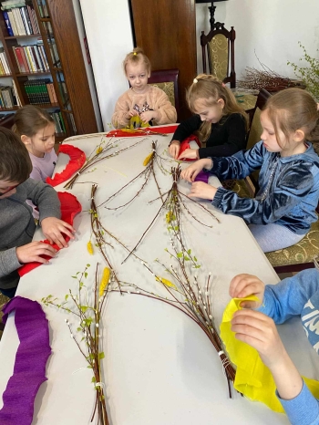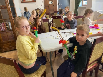 Podczas warsztatów każde dziecko wykonało tradycyjną palmę wielkanocną z gałązek brzozy, bazi i kolorowych kwiatów z bibuły. W czasie pracy panowała miła i radosna atmosfera. To były niezwykłe zajęcia, które na długo pozostaną w pamięci pierwszoklasistów.