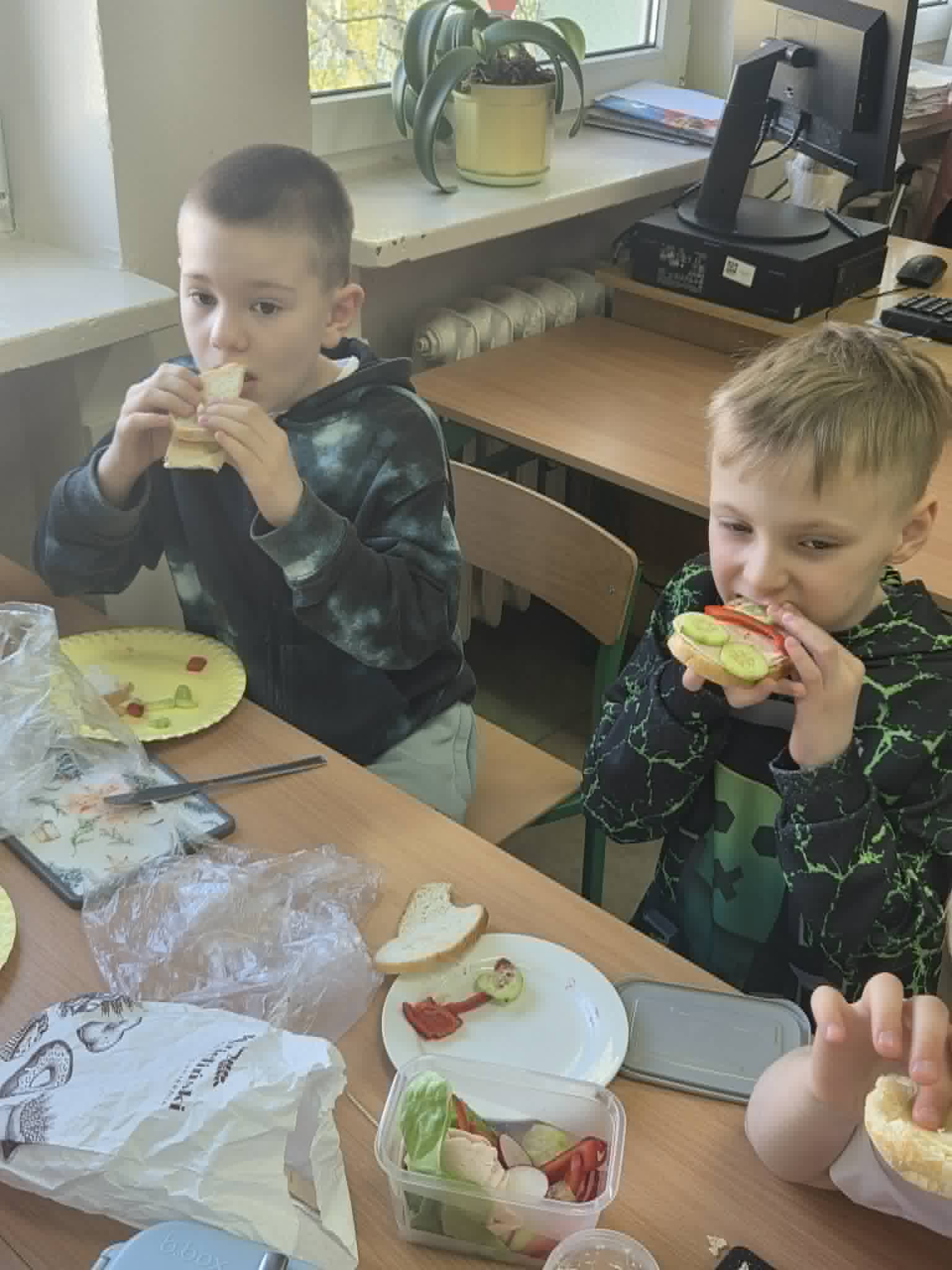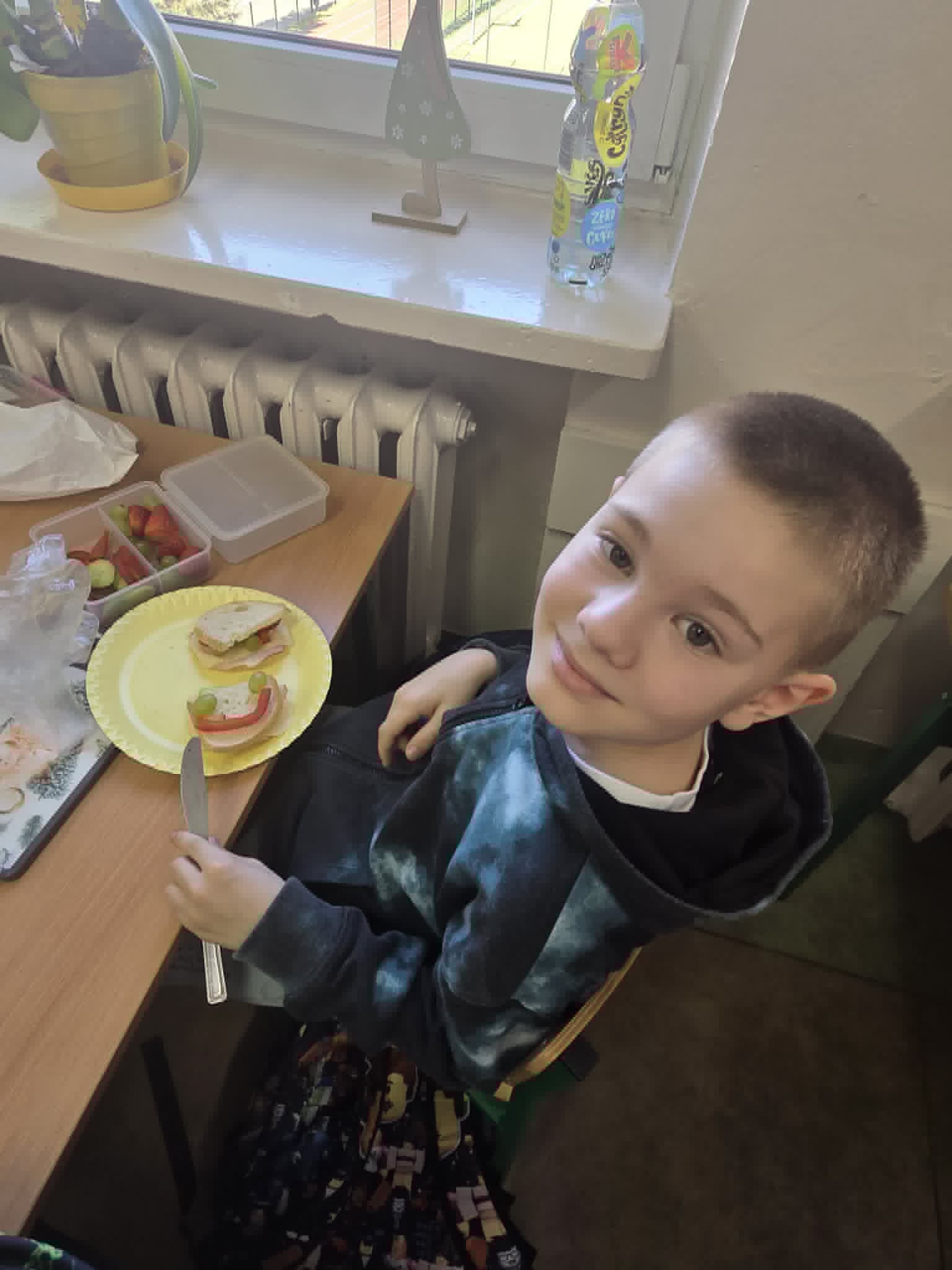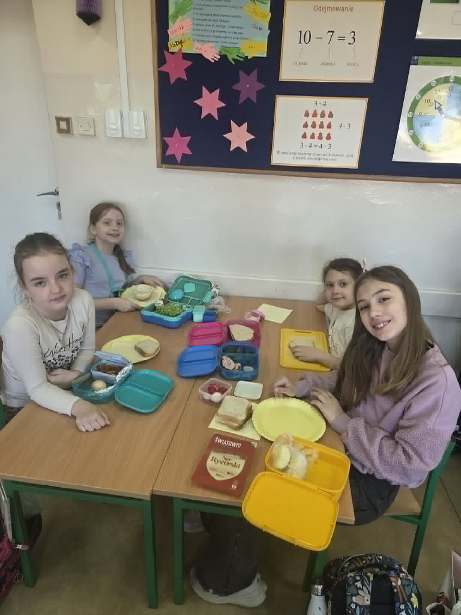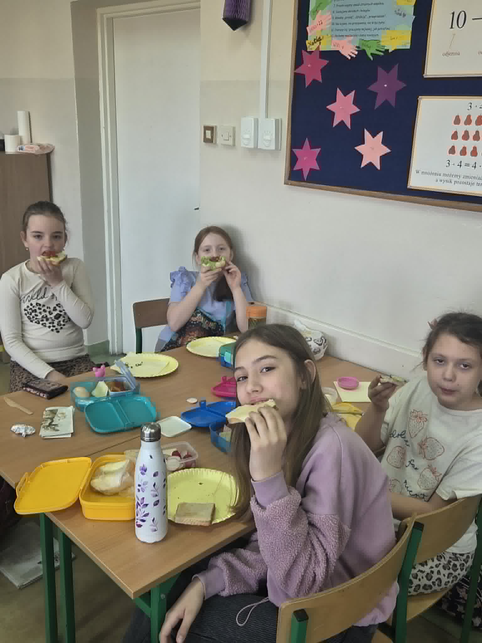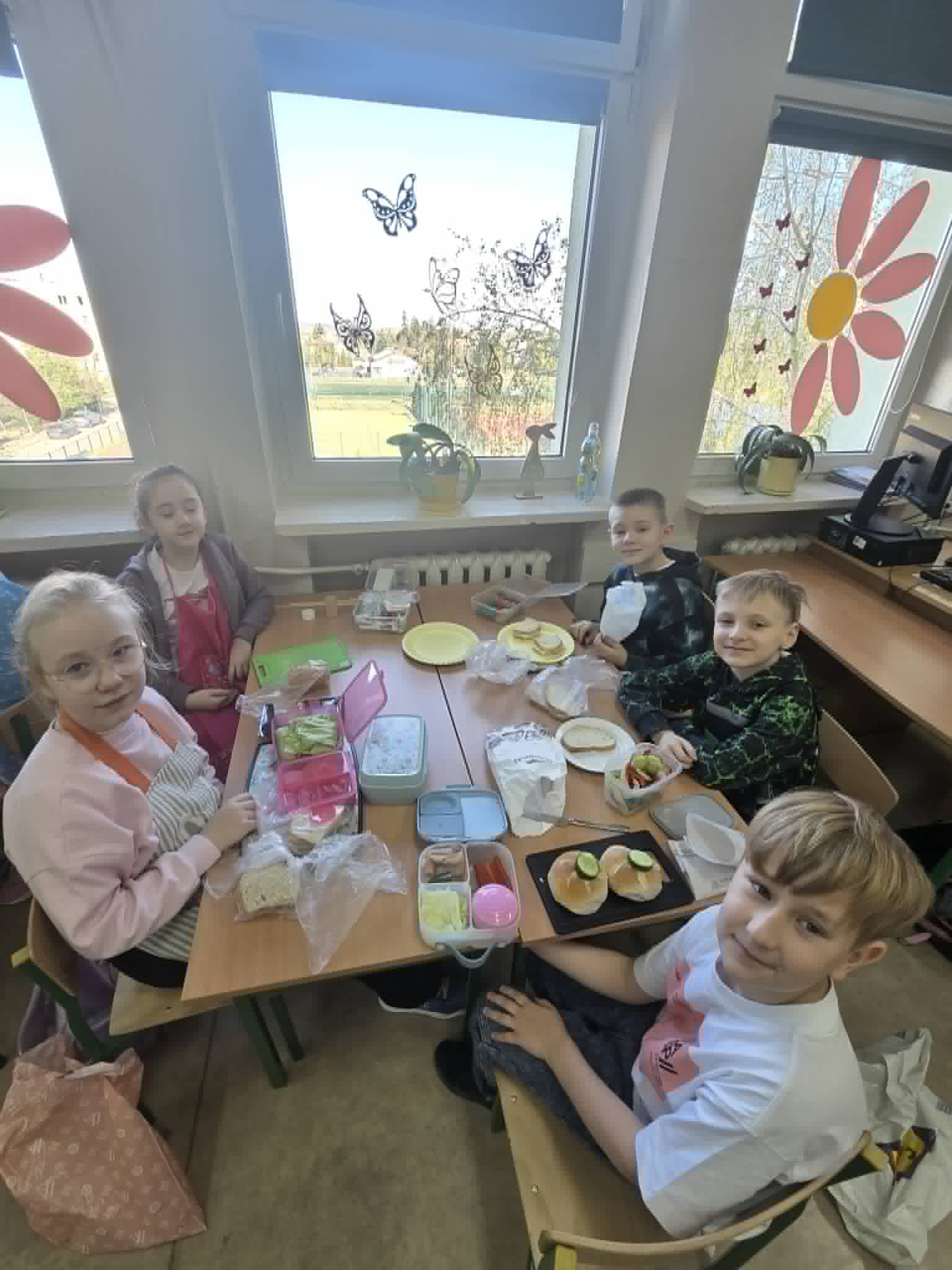 W klasie II a odbyło się wyjątkowe „zdrowe śniadanko”, podczas którego uczniowie mieli okazję samodzielnie przygotować pyszne i wartościowe posiłki. Na stołach pojawiły się kolorowe kanapki pełne świeżych warzyw, zdrowych dodatków oraz kreatywnych kompozycji, które zachęcały do jedzenia.