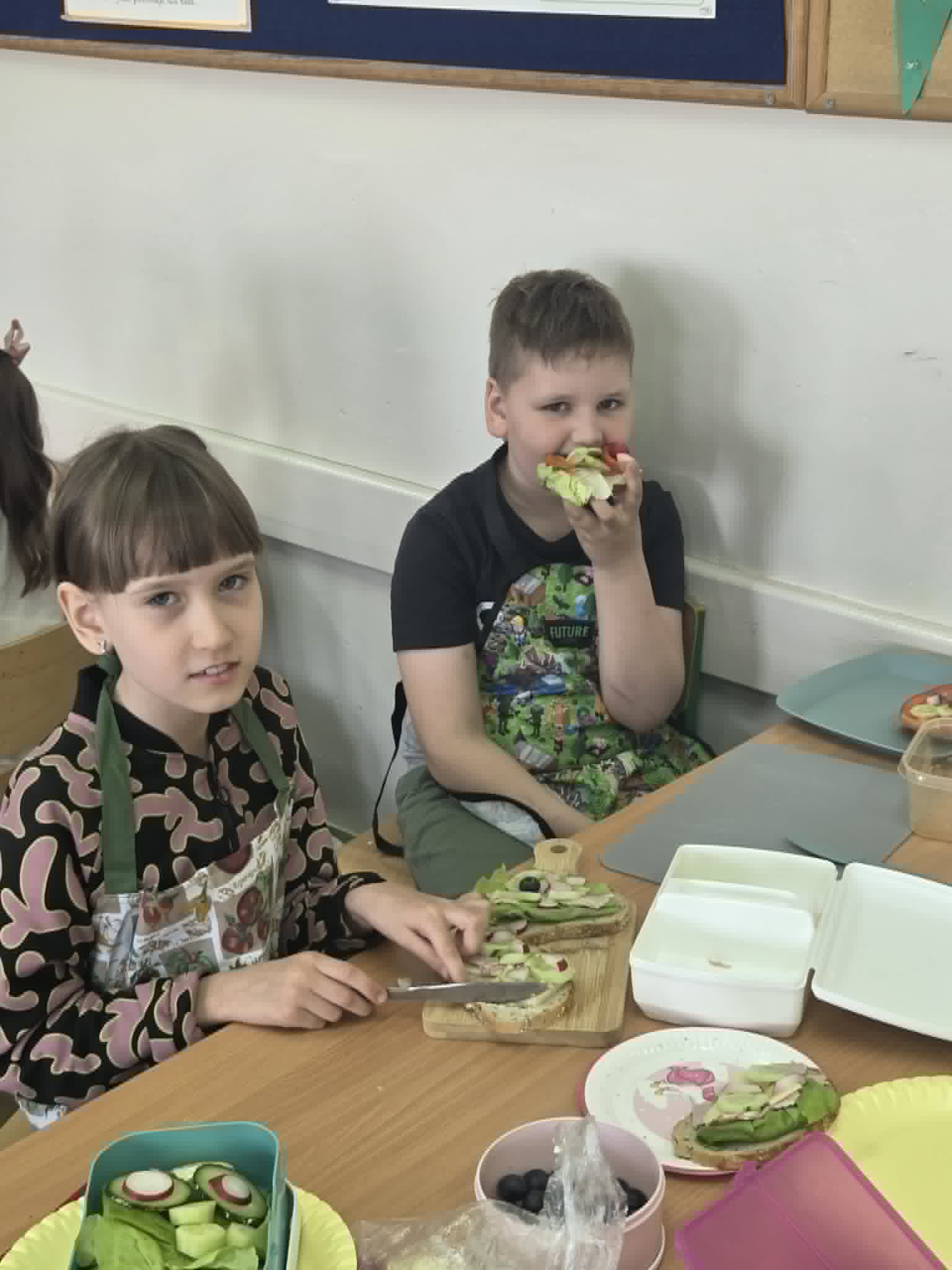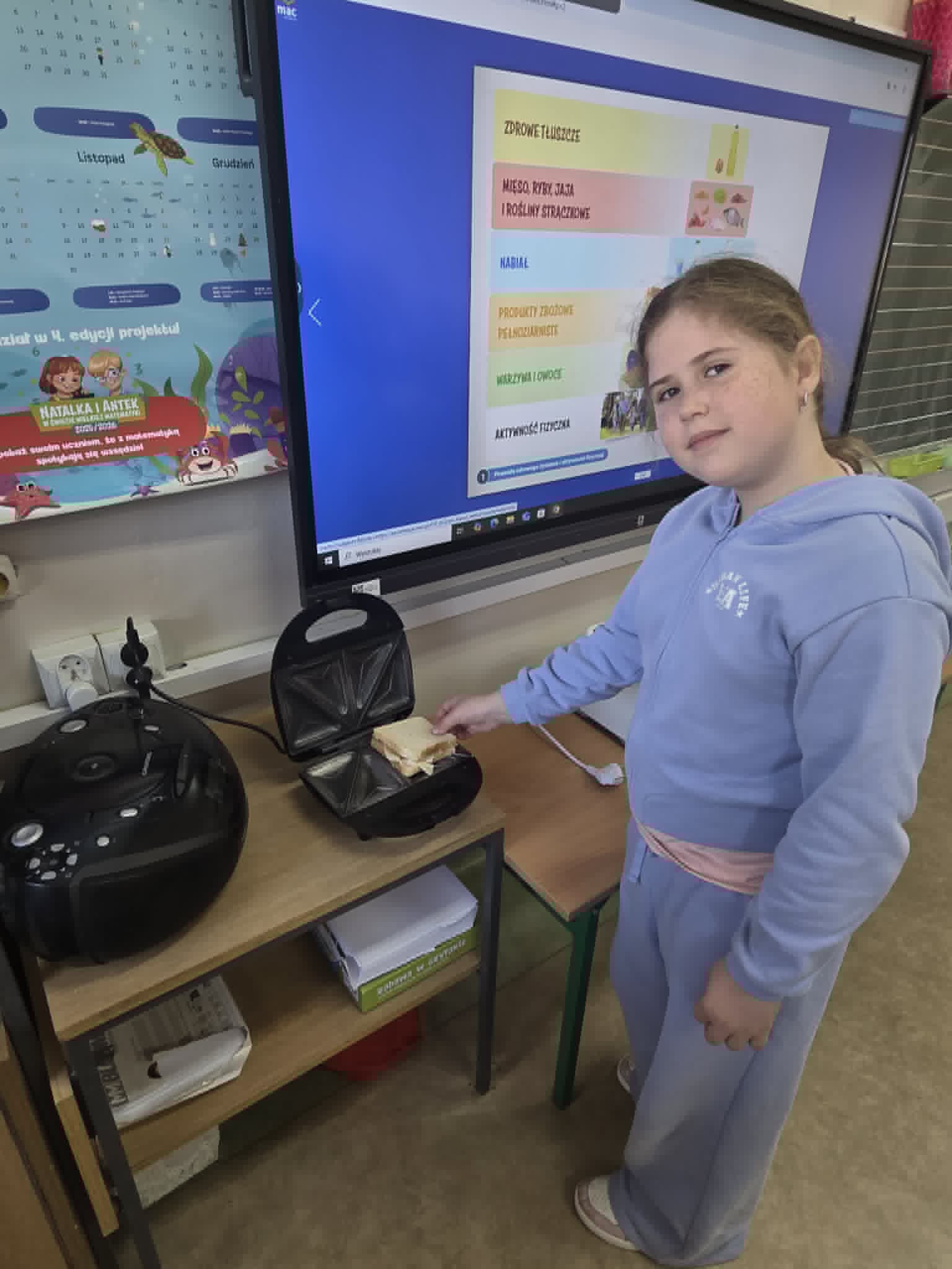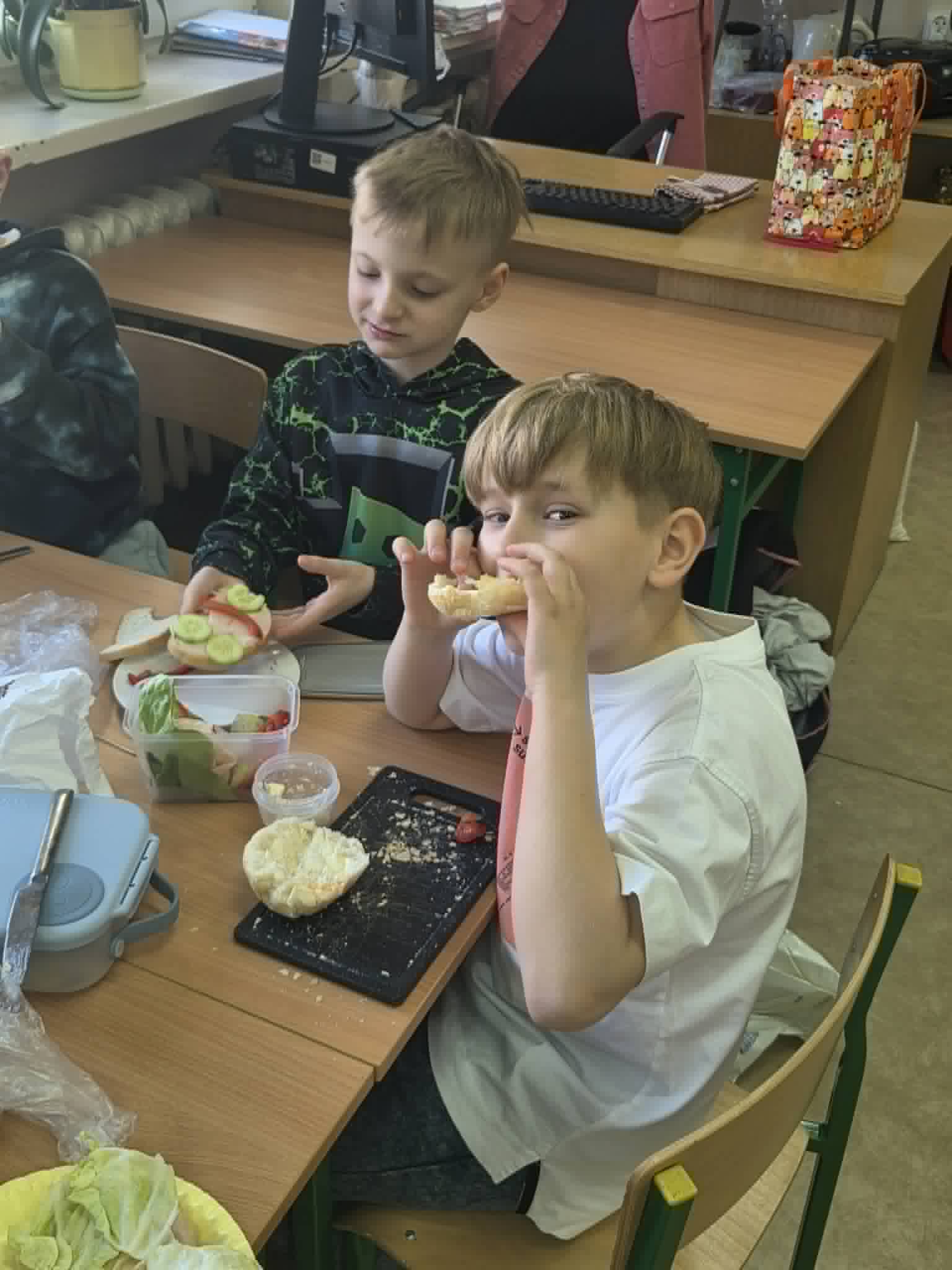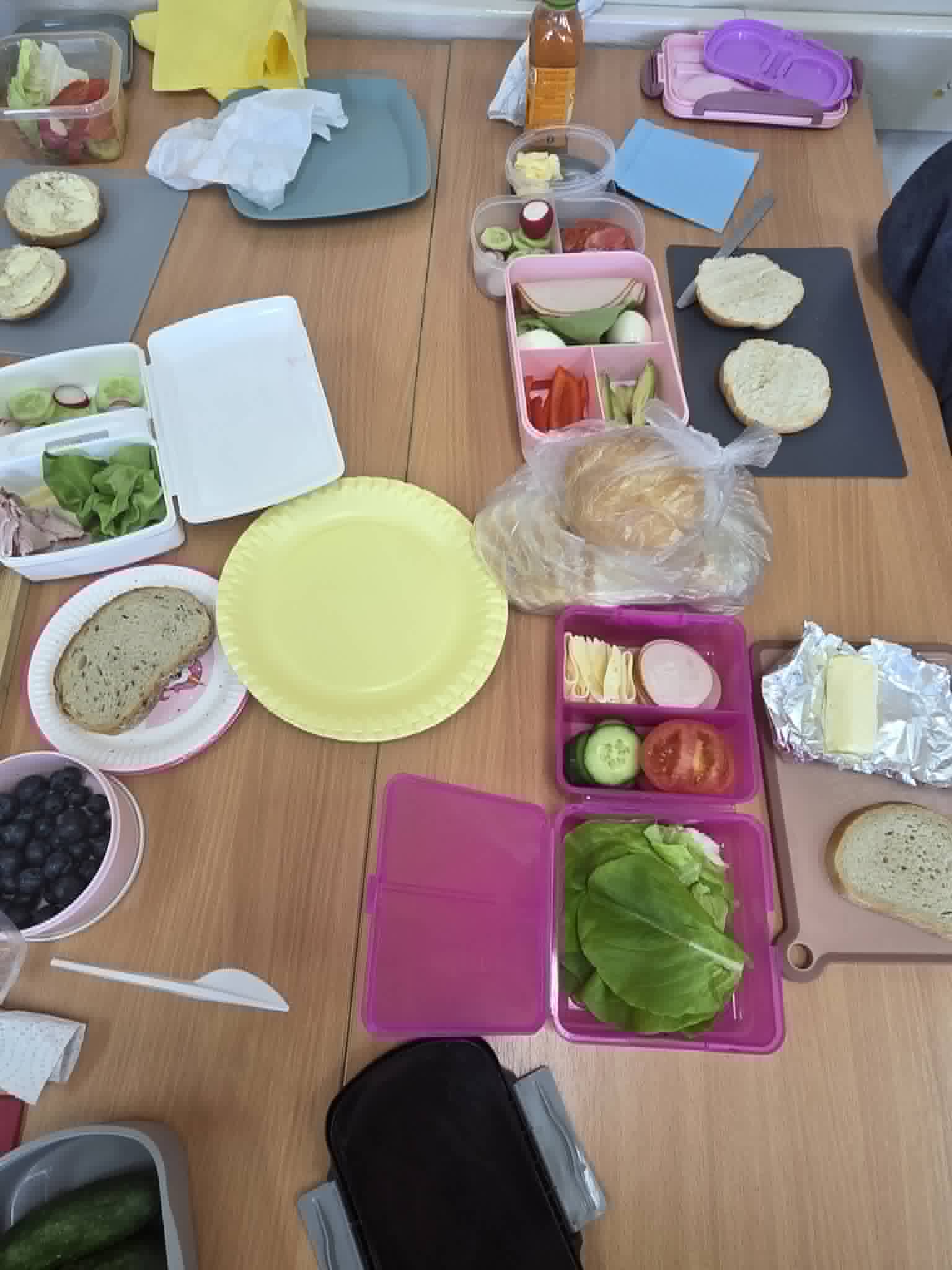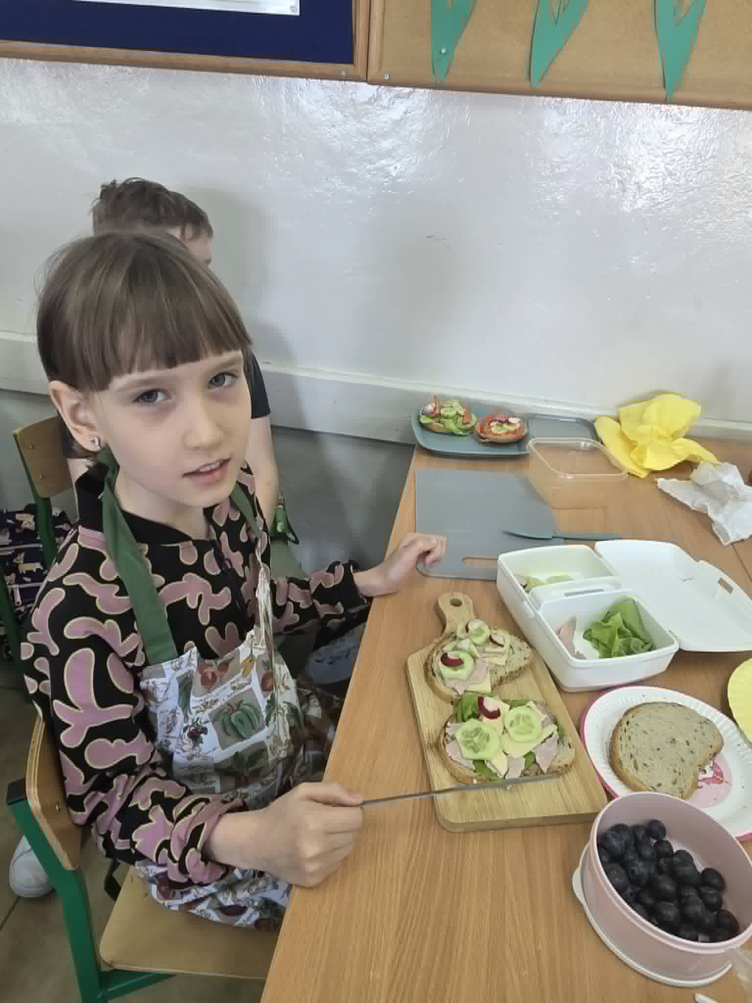 W klasie II a odbyło się wyjątkowe „zdrowe śniadanko”, podczas którego uczniowie mieli okazję samodzielnie przygotować pyszne i wartościowe posiłki. Na stołach pojawiły się kolorowe kanapki pełne świeżych warzyw, zdrowych dodatków oraz kreatywnych kompozycji, które zachęcały do jedzenia.