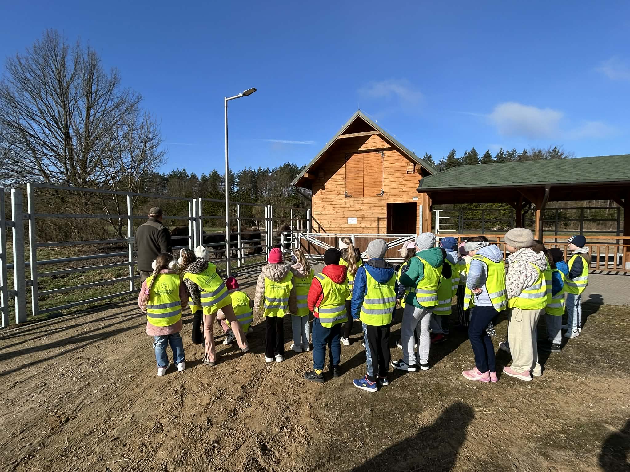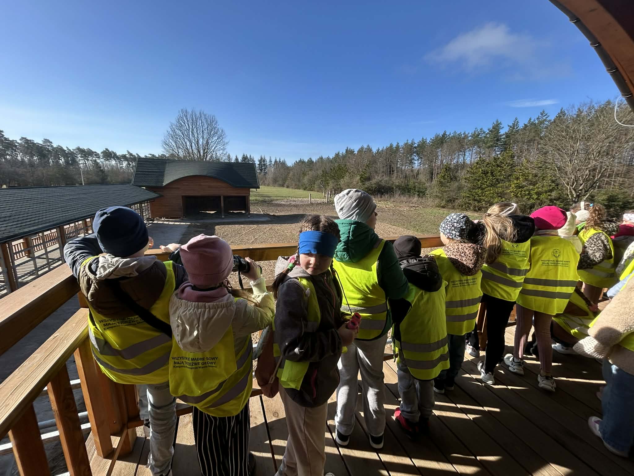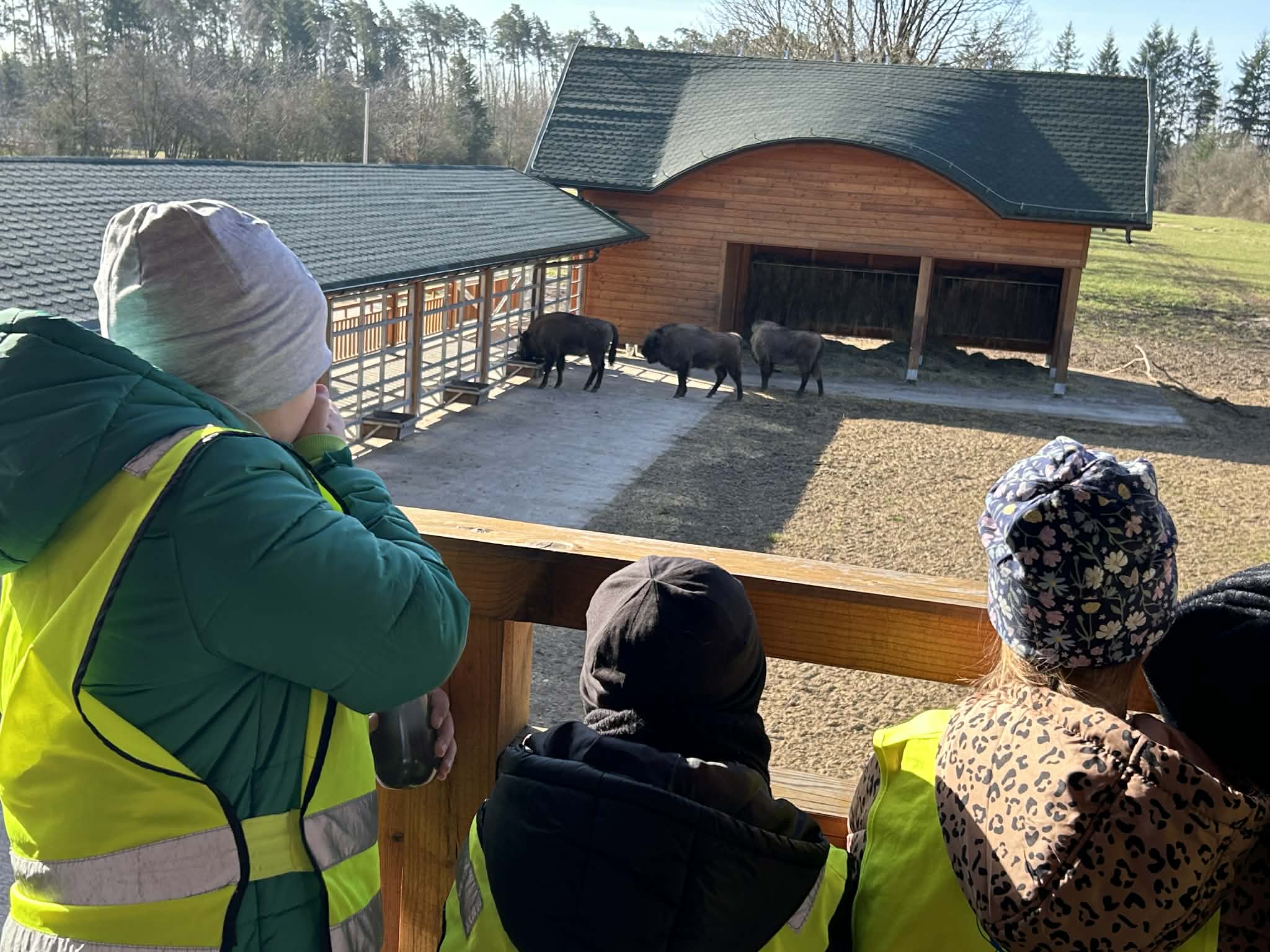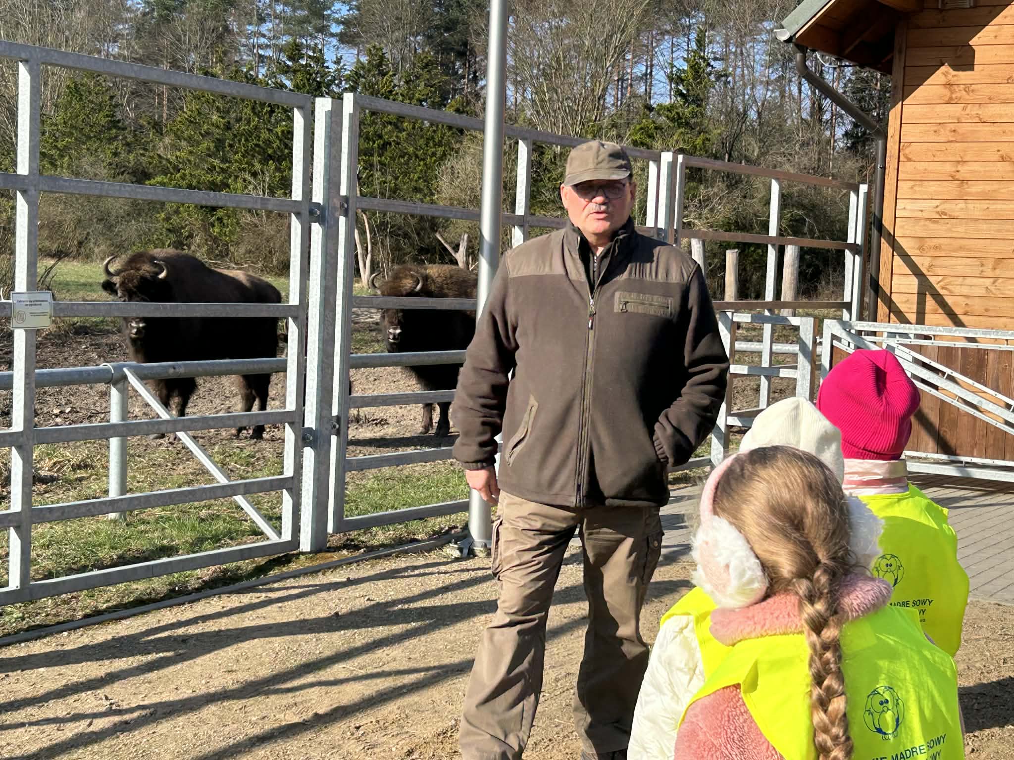 Na miejscu uczniowie mieli okazję zobaczyć żubry z bliska. Te imponujące zwierzęta wzbudziły ogromne zainteresowanie i podziw. Dzieci dowiedziały się wielu ciekawych informacji o ich życiu, zwyczajach oraz o tym, jak ważna jest ich ochrona. Spacer po zagrodzie był nie tylko przyjemny, ale także bardzo pouczający. Uczniowie zadawali pytania, dzielili się spostrzeżeniami i z dużym zaangażowaniem uczestniczyli w wycieczce.