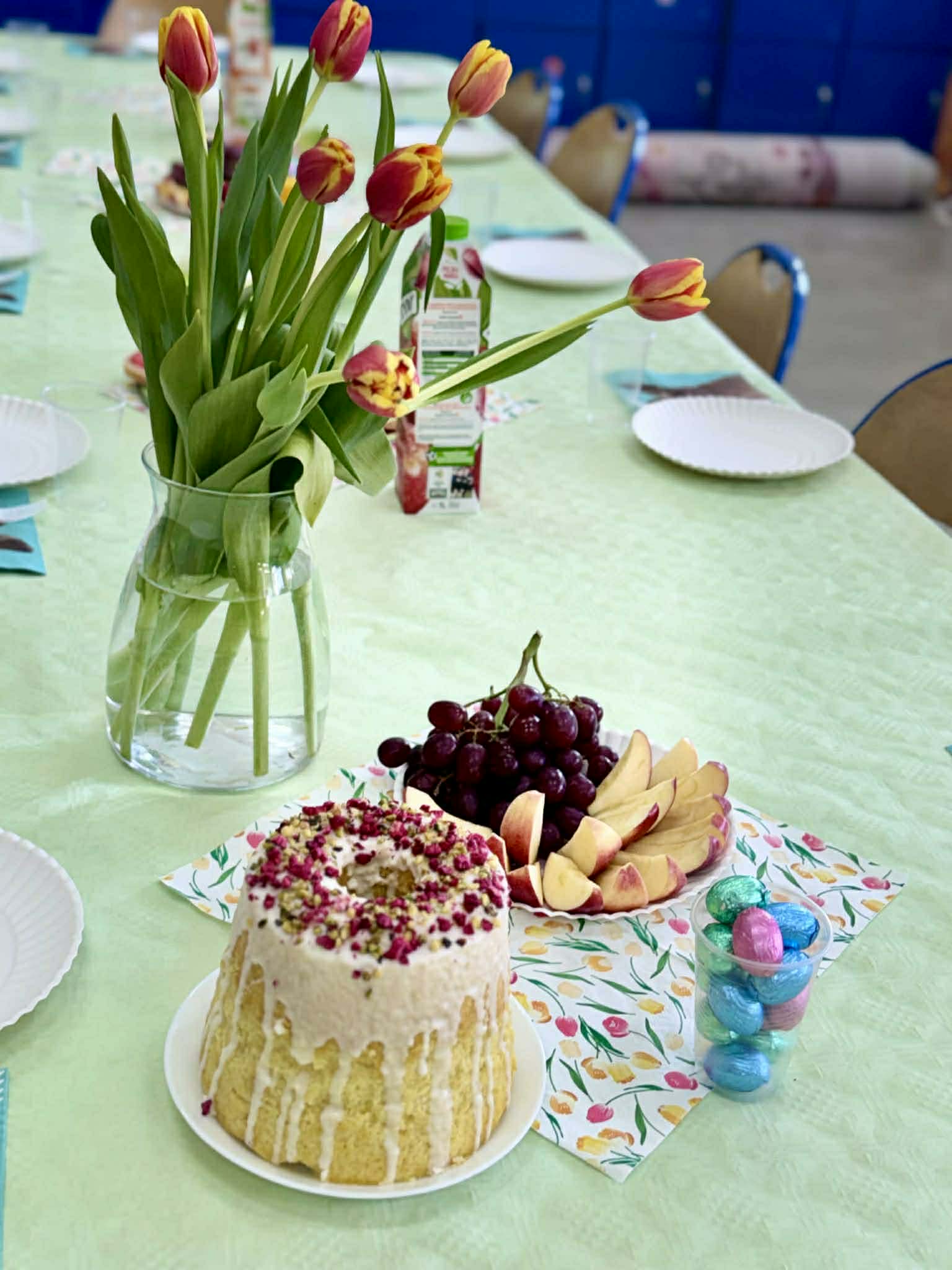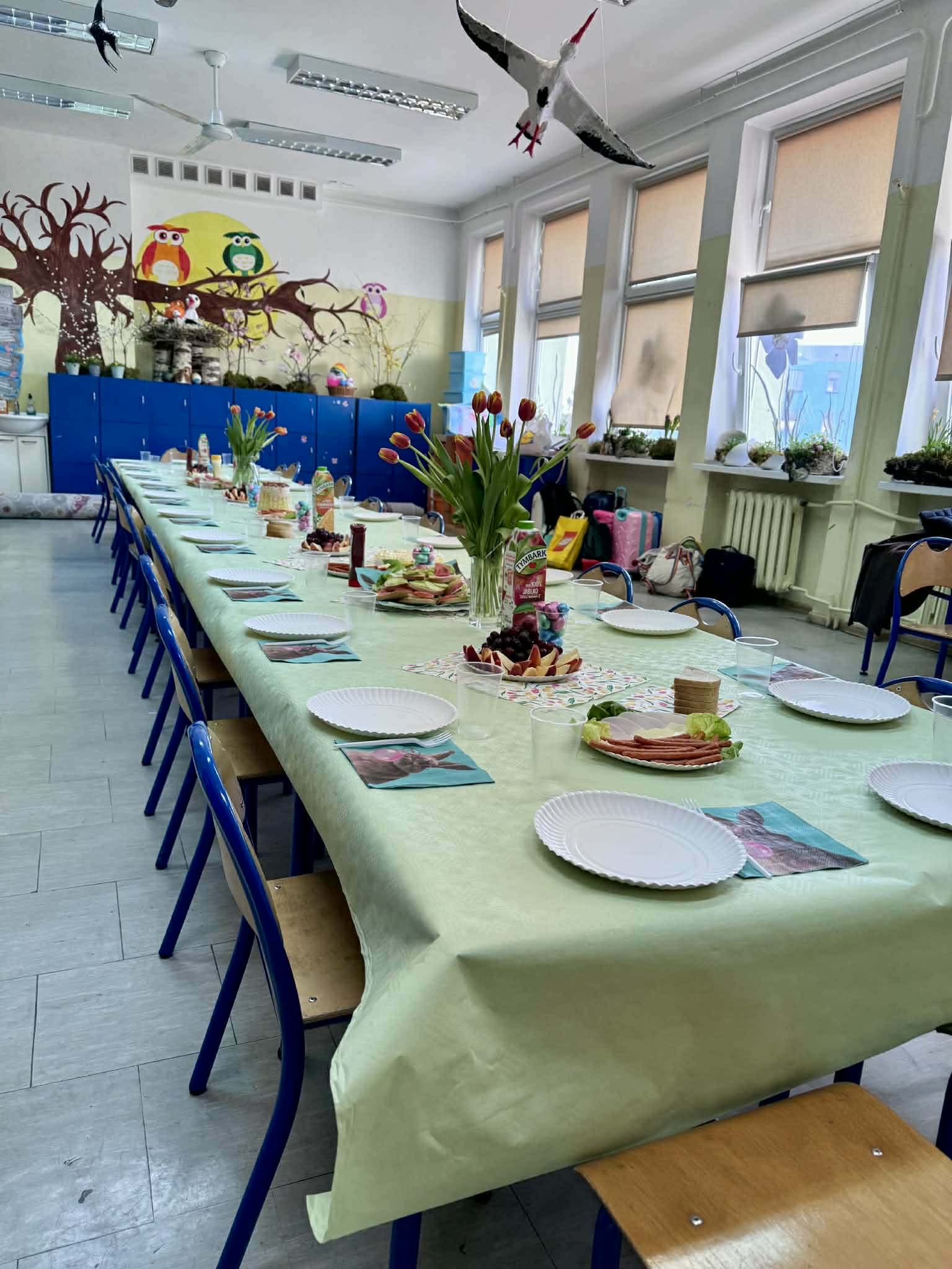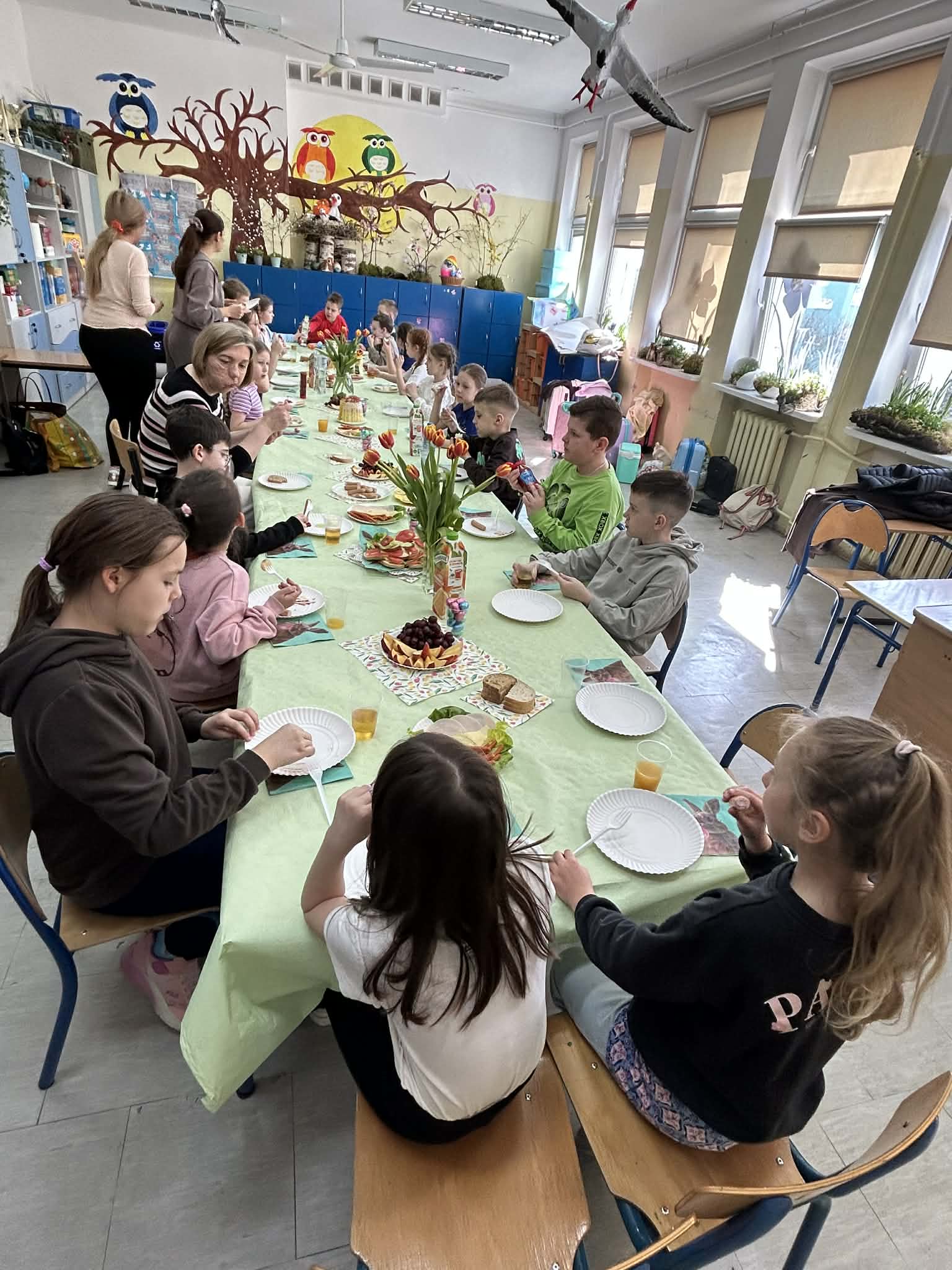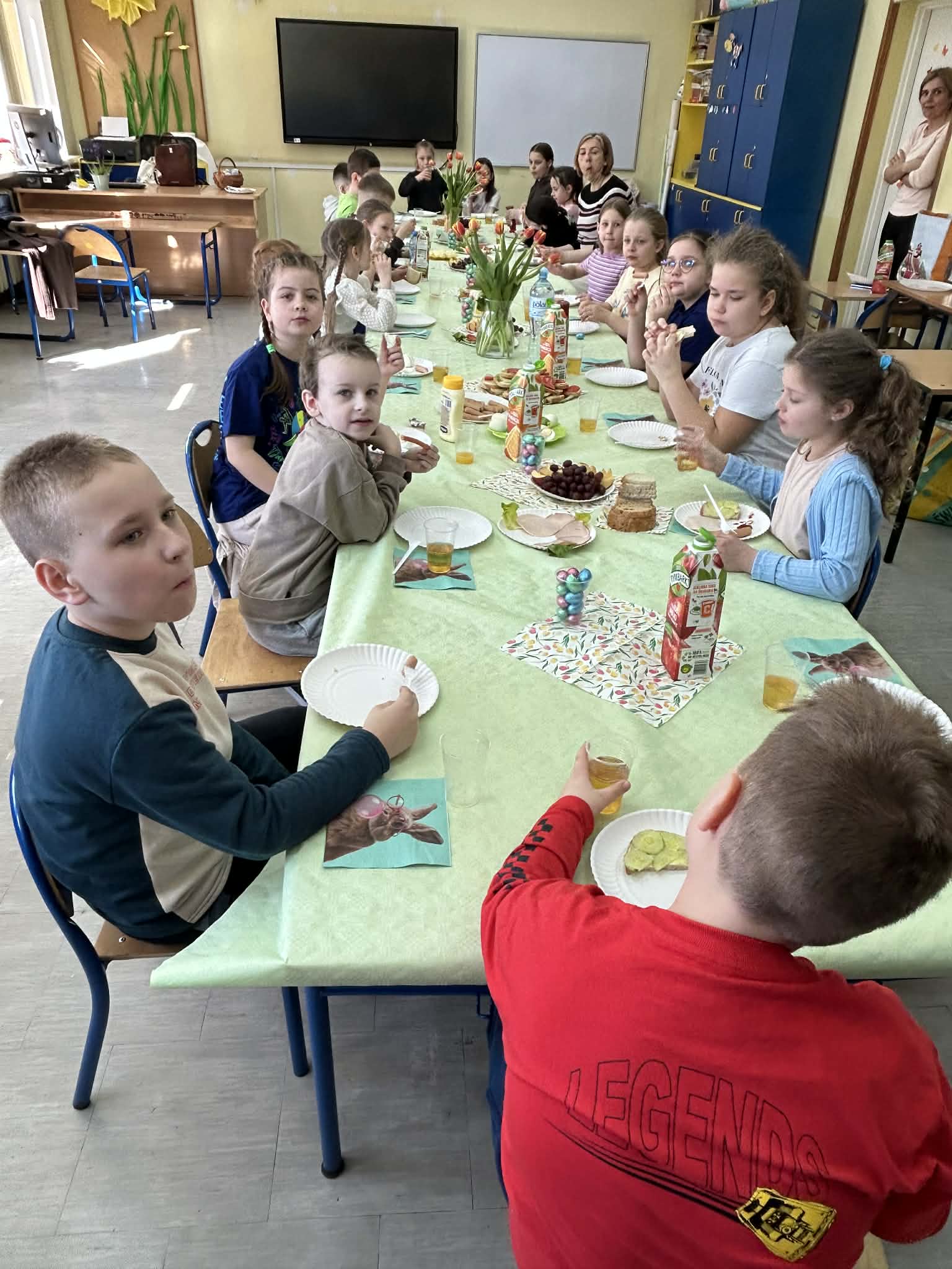 Po powrocie do szkoły czekała na nich miła niespodzianka – śniadanie wielkanocne przygotowane przez rodziców, którym serdecznie dziękujemy za ten wspaniały pomysł. Stoły były pięknie udekorowane, a na nich znalazły się tradycyjne potrawy.